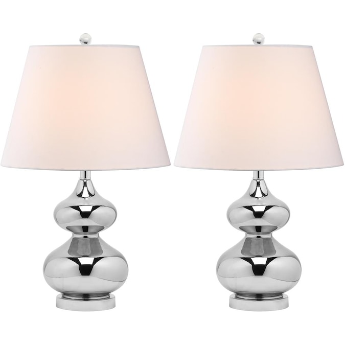 Illuminate any living space in style with the mercury silver Eva Double Gourd Lamp (set of two). Topped with a matching finial, Eva’s off-white cotton shade gives a classic touch to its curved glass body.