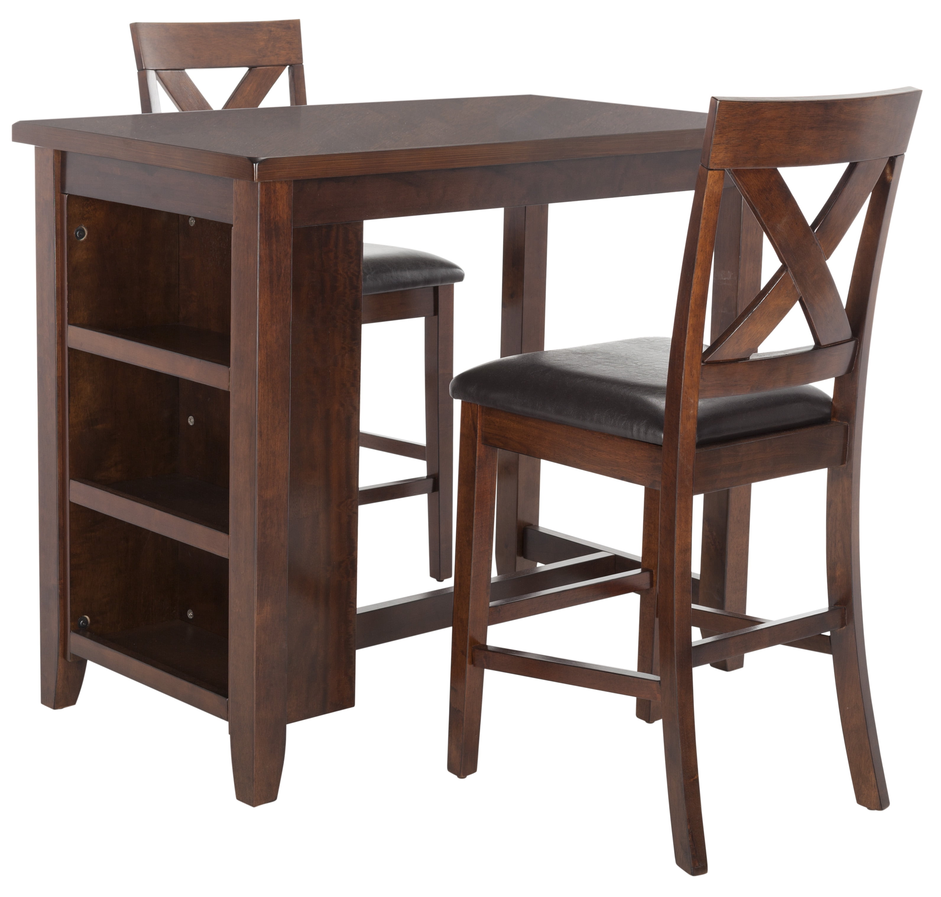 Shop Safavieh at . Save Money. Live Better. Safavieh Everest Solid Contemporary Glam 3 Piece Pub Set Transform any meal into a stylish dining experience with this 3-piece pub set. Constructed with solid mango wood, its mahogany finish compliments into any dining area décor. Its clever open storage shelves and classic x-back chairs make it an investment.