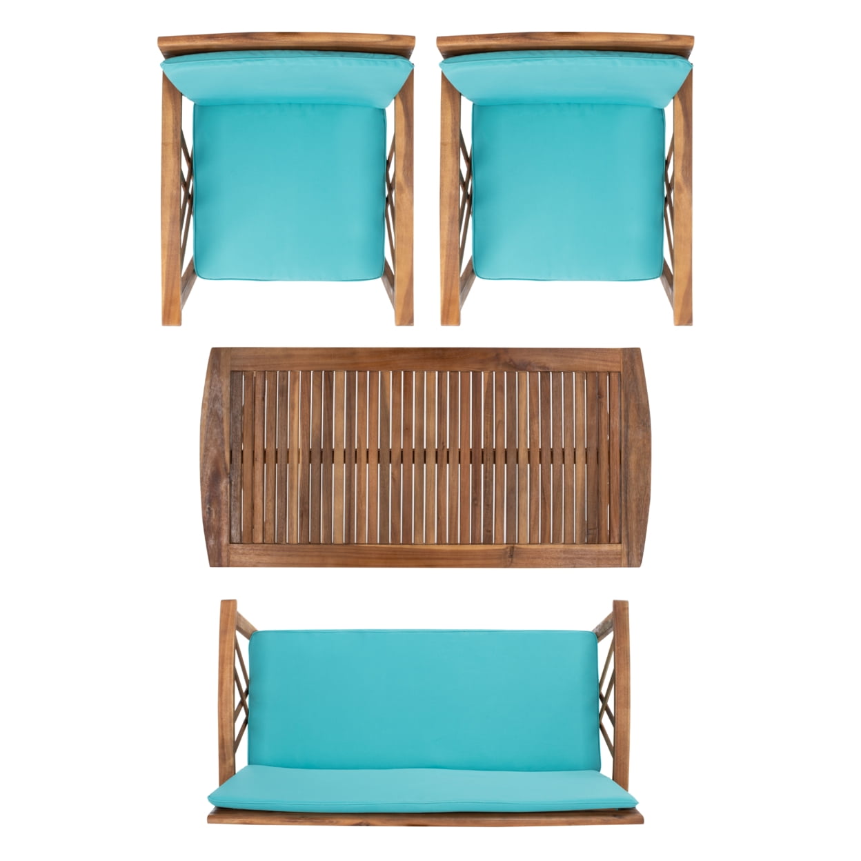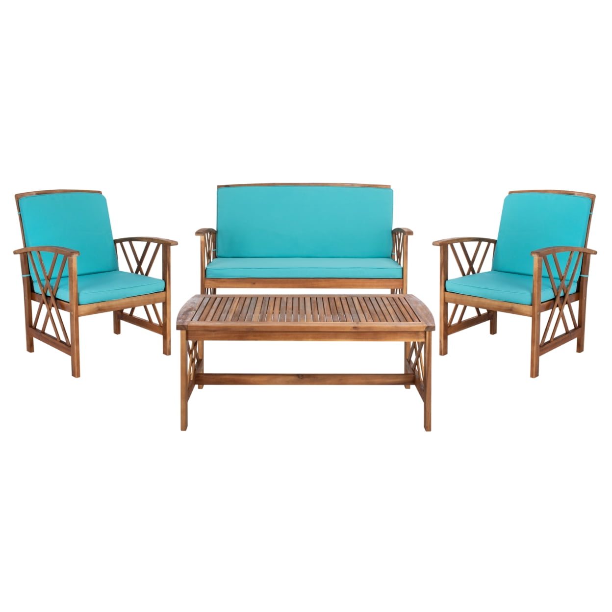 Shop Safavieh at . Save Money. Live Better. SAFAVIEH Fontana Outdoor Patio 4 Pc Conversational Set, Natural/Aqua A distinctive double X motif adorns the sides of this Fontana 4 Piece Outdoor Living Set for a luxe transitional look. Masterfully crafted of sustainable acacia wood in a chic natural finish, this stylish set comes with aqua all-weather cushions. Sit back, relax and make memories with family and friends throughout every season with this set. Add a touch of classic charm to your home with this remarkable piece.