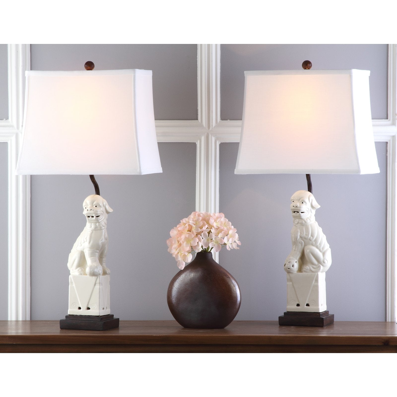 Infuse some classic style into your décor with the Safavieh Foo Dog LIT4137 Table Lamp – Set of 2. The ceramic and polyresin bases resemble blue jade dog figurines positioned on brown museum mounts. White cotton tapered box shades add a mod touch to the design and soften the glow of the provided CFL bulbs.