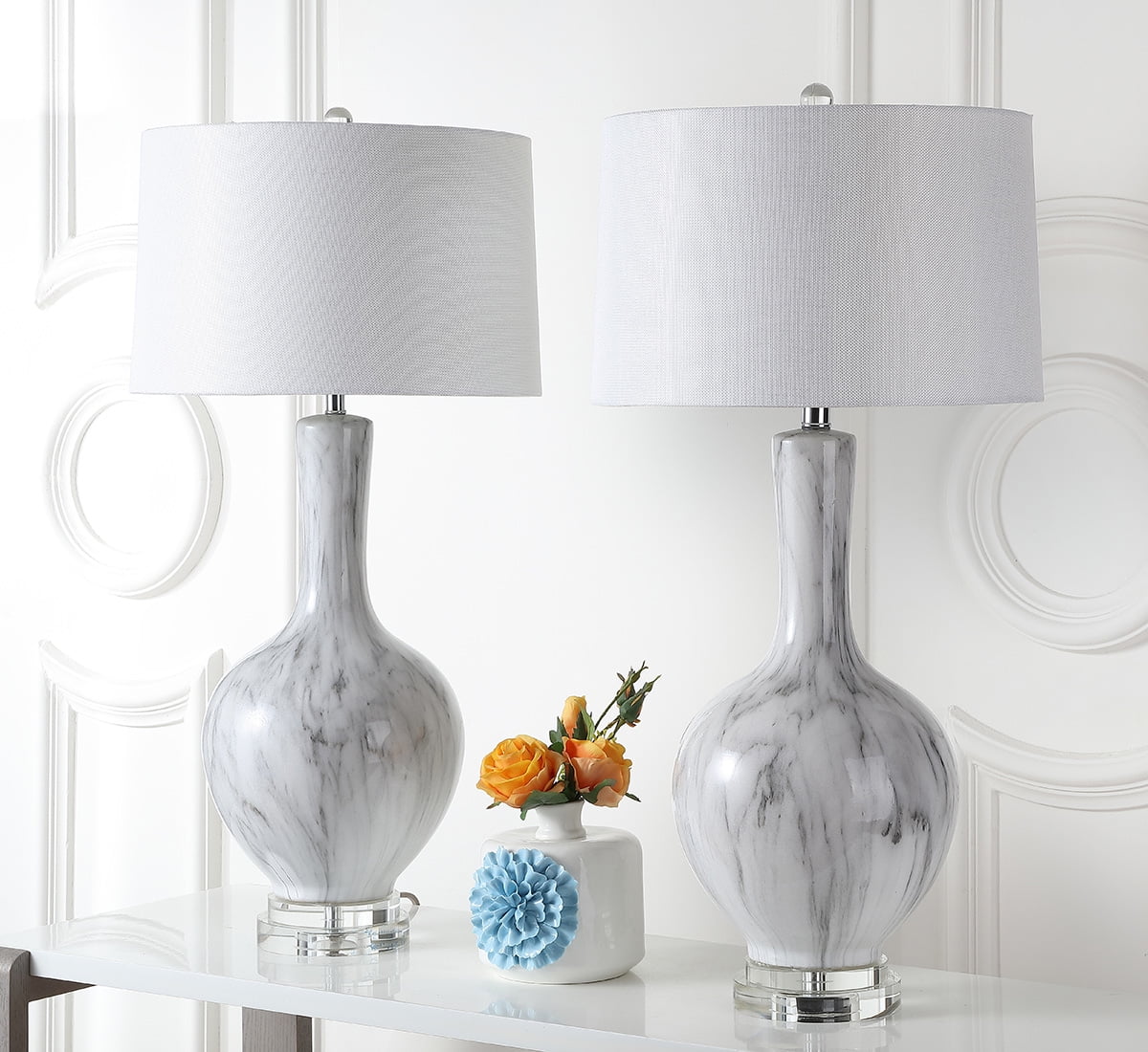 Contemporary design adds a chic look to your home Durable frame for long lasting longevity Easy to clean and maintain Minor assembly needed Color: Blue Shade Color: Off-White Item Dimensions: 14 in. W x 9 in. D x 28 in. H Crafted with Ceramic Shade Material: 100% Cotton Shade Height: 11 in. H Shade Bottom Dimensions: 9 in. L x 14 in. W Shade Top Dimensions: 7 in. W x 12 in. L Traditional Harp Style Harp Color: Gold Harp Height: 8 in. H Cord Color: Light Grey Cord Length: 60 in. Lamp Body Dimensions: 5.5 in. W x 5.5 in. D x 13 in. H Bottom Base Dimension: 5.75 in. W x 5.75 in. D x 1 in. H Pendant Dimension: 60 in. Lamp Certification: UL Light Bulb Base Type: E26 Switch Mechanism: Rotary Switch Type of Bulb Included: CFL Max Wattage: 13W Lumen: 830 Quantity of Bulbs: 2 Accessories in life style photo(s) not included Please note: The images and product dimensions on our website are as accurate as possible. Due to differences in computer monitors, some item’s color may vary slightly. Before cleaning any lamp shade or fixture, disconnect the power source. Wipe with a soft, dry cloth. Avoid the use of chemicals and household cleaners as they may damage the finish.