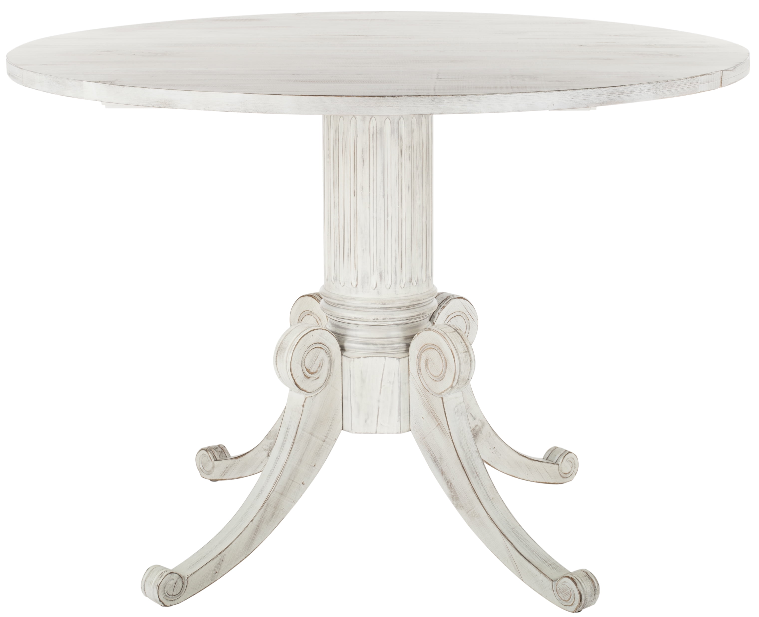 Dimensions: 43.3 diam. x 30.7H in. Crafted from durable pine Your choice of available finish Carved pedestal base Drop-leaf extension Seats up to 4 people