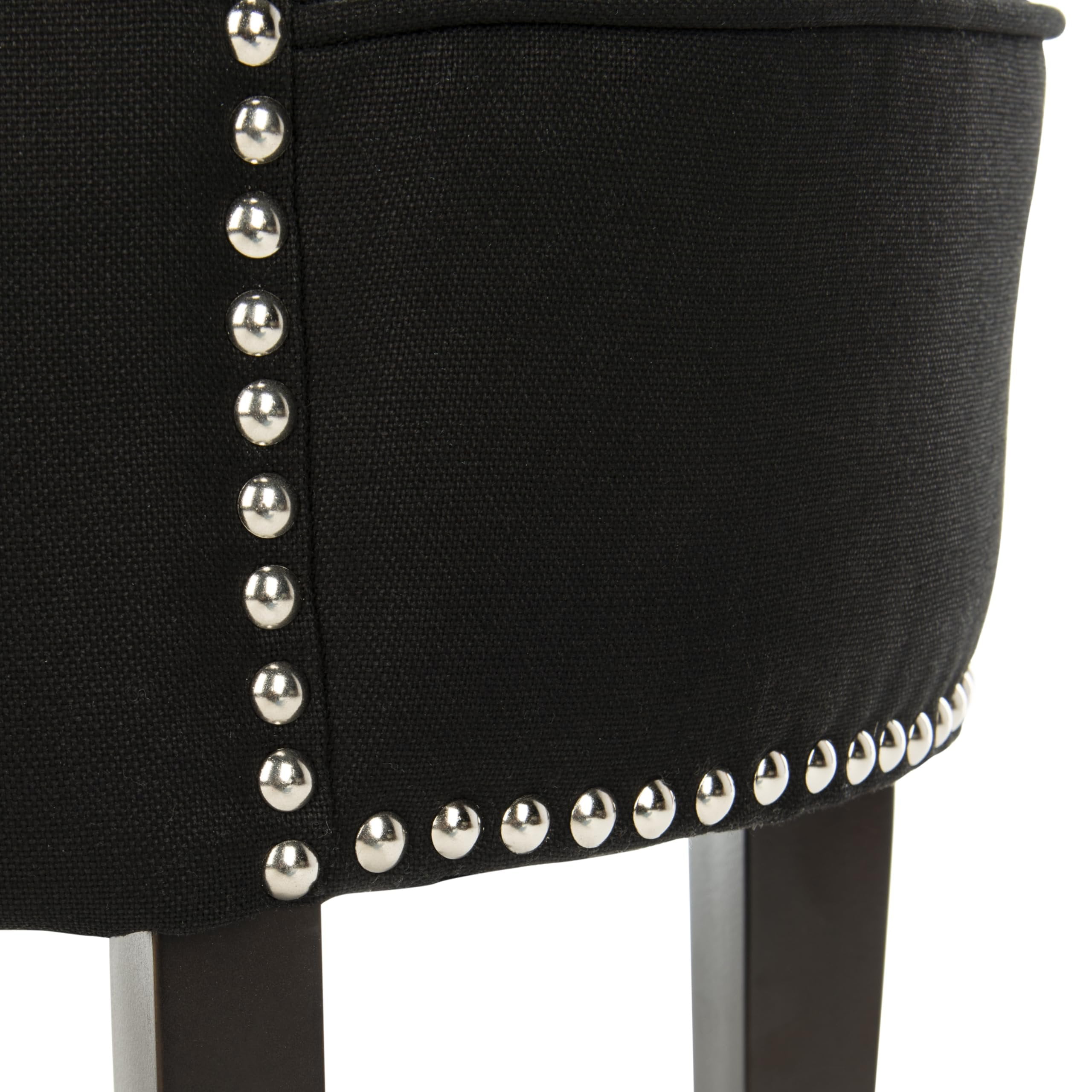 Contemporary design adds a chic look to your home Durable birch wood frame for long lasting longevity Minor assembly needed Color: Black Frame Color: Espresso Assembled dimensions: 22.8 in. H x 17.9 in. W x 19 in. D Seat Dimensions: 17.9 in. H x 17.9 in. W x 13.5 in. D Upholstered with 100% Linen Contains Ca Foam/Polyester Fiber Leg Height: 10.63 in. Contains silver nailheads Item Weight: 12.5 lbs. Weight Capacity: 225 lbs. Accessories in life style photo(s) not included Please note: The images and product dimensions on our website are as accurate as possible. Due to differences in computer monitors, some furniture colors may vary slightly. Lengths and widths may vary from the published dimensions. We do our best to provide you with an exact measurement, but please be advised that some variation exists. To prevent overall soiling, frequent vacuuming or light brushing is recommended. Cushions and pillows should be turned on a weekly basis. Down-filled cushions should be brushed rather than vacuumed. Spot clean, using a mild water-free solvent or dry cleaning product. Only a professional cleaner should undertake a complete overall cleaning. The use of steam or water-based cleaners may cause excessive shrinking or staining.
