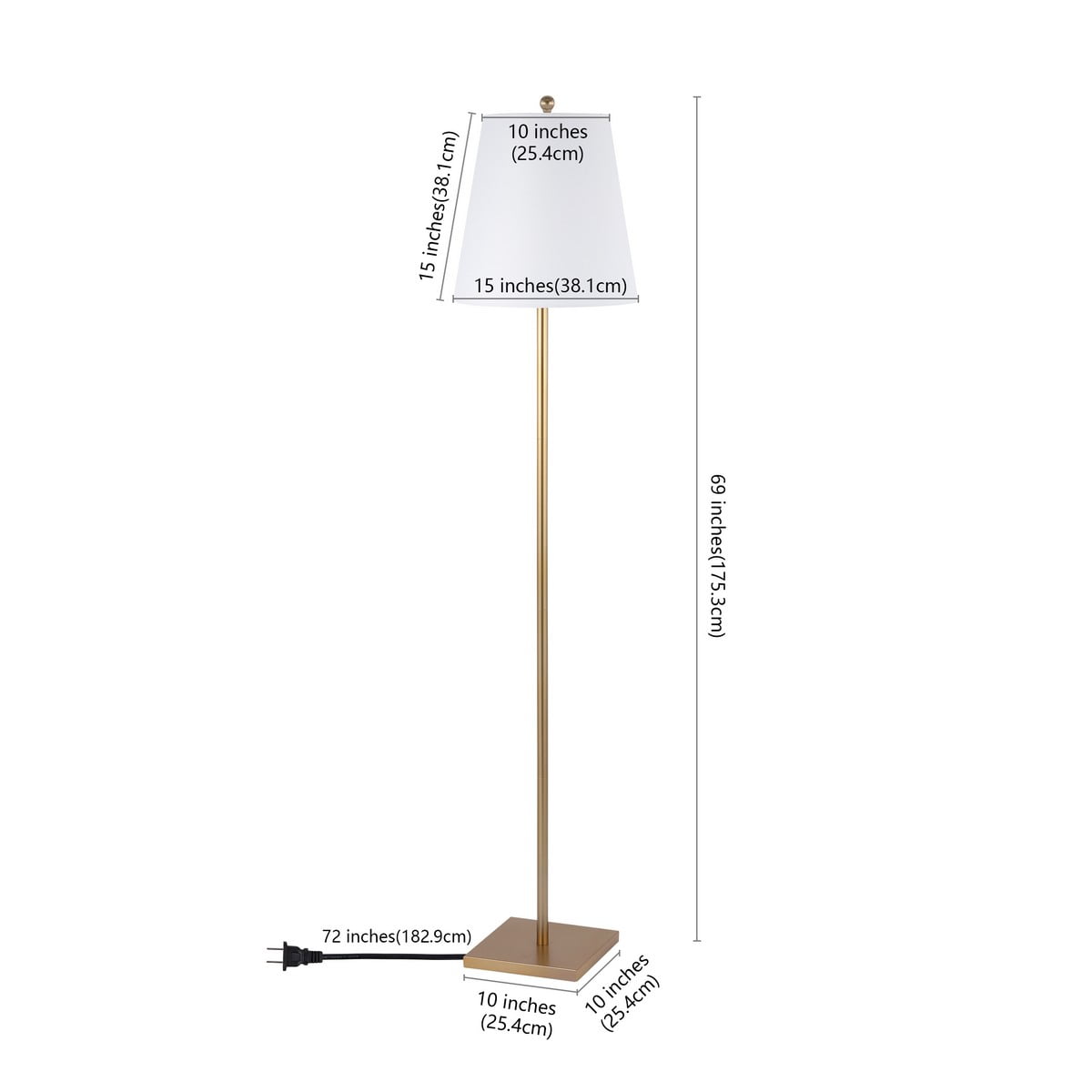 Contemporary design adds a chic look to your home Durable metal frame for long lasting longevity Easy to clean and maintain Minor assembly needed Color: Gold Shade Color: White Item Dimension: 15 in. W x 15 in. D x 69 in. H Crafted with: Metal Shade Material: 100% Cotton Shade Height: 15 in. Shade Bottom Dimension: 15 in. W x 15 in. L Shade Top Dimension: 10 in. W x 10 in. L Harp Height: 9 in. Cord Color: Black Cord Length: 72 in. Lamp Body Dimension: 1 in. W x 1 in. D x 56.5 in. H Bottom Base Dimension: 10 in. W x 10 in. D x 1 in. H Item Weight: 17.6 lbs Lamp Certification: UL Light Bulb Base Type: E26 Switch Mechanism: On/Off Knob Switch Type of Bulb Included: A19-LED Max Wattage: 100W Lumen: 800 Quantity of Bulb(s): 1 Finial Color: Gold Painting Unit Sold: One Accessories in life style photo(s) not included Please note: The images and product dimensions on our website are as accurate as possible. Due to differences in computer monitors, some item’s color may vary slightly. Before cleaning any lamp shade or fixture, disconnect the power source. Wipe with a soft, dry cloth. Avoid the use of chemicals and household cleaners as they may damage the finish.