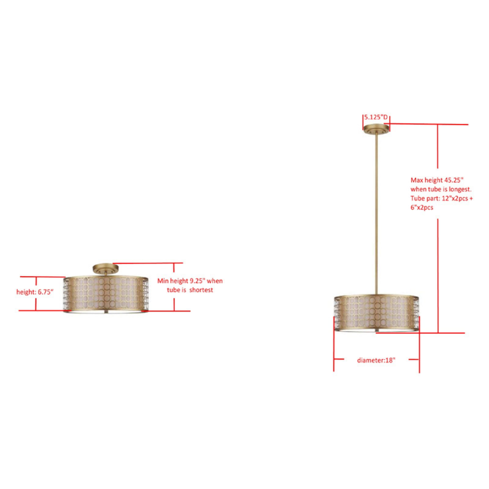 Contemporary design adds a chic look to your home Durable frame for long lasting longevity Easy to clean and maintain Minor assembly needed Color: Antique Gold Shade Color: Cream Item Dimensions: 18 in. W x 18 in. D x 9.25 to 45.25 in. H Crafted with Iron Shade Material: 100% Polyester Shade Height: 6.75 in. H Shade Bottom Dimensions: 16 in. L x 16 in. W Shade Top Dimensions: 16 in. W x 16 in. L Cord Color: Black/White Cord Length: 6 in. Minimum Hanging Length: 9.25 in. H Maximum Hanging Length: 45.25 in. H Pendant Dimension: 6 in. Lamp Certification: UL Canopy Dimensions: 5.125 in W x 5.125 in. D x 0.75 in. H Light Bulb Base Type: E26 Type of Bulb Included: CFL Max Wattage: 13W Lumen: 830 Quantity of Bulbs: 3 Accessories in life style photo(s) not included Please note: The images and product dimensions on our website are as accurate as possible. Due to differences in computer monitors, some item’s color may vary slightly. Before cleaning any lamp shade or fixture, disconnect the power source. Wipe with a soft, dry cloth. Avoid the use of chemicals and household cleaners as they may damage the finish.