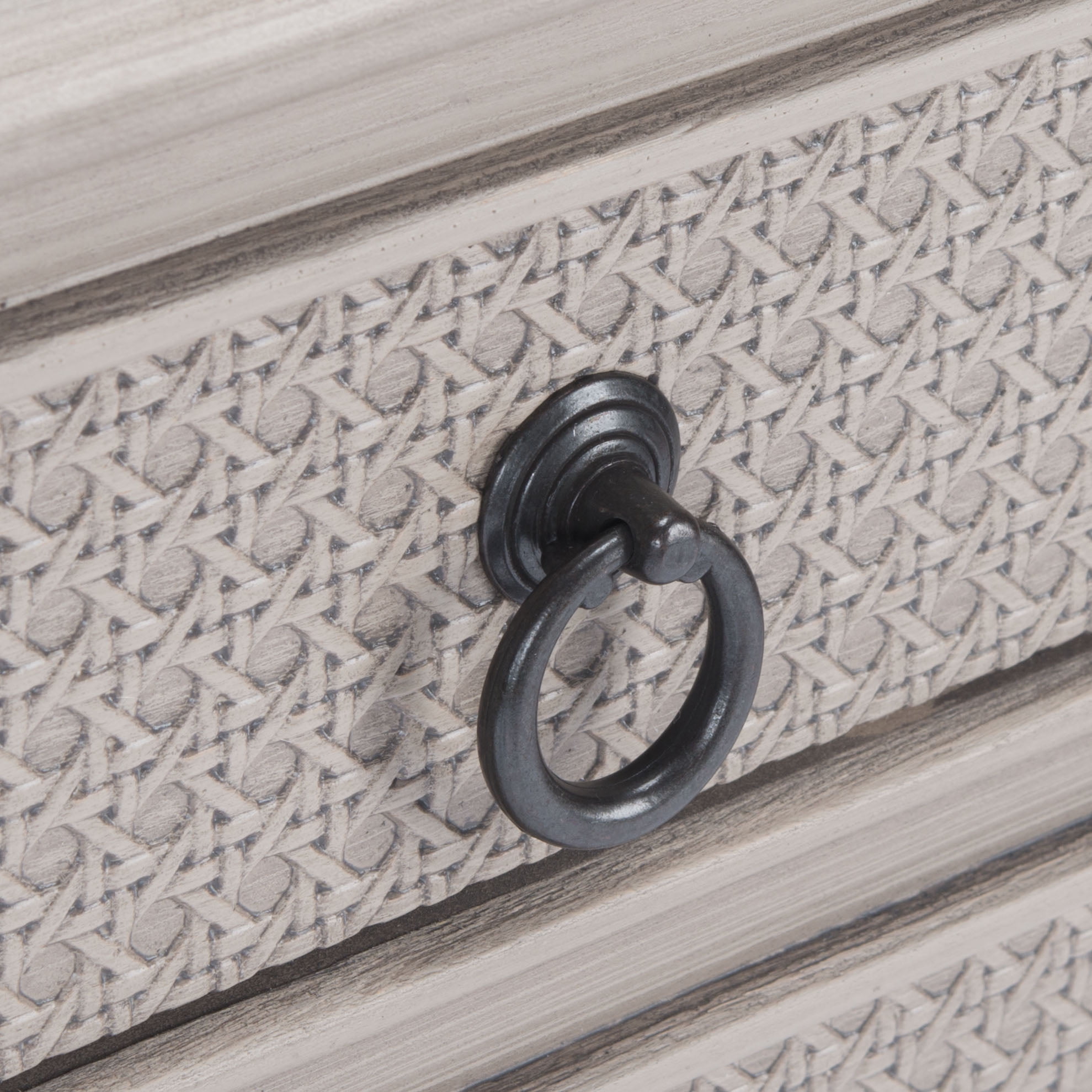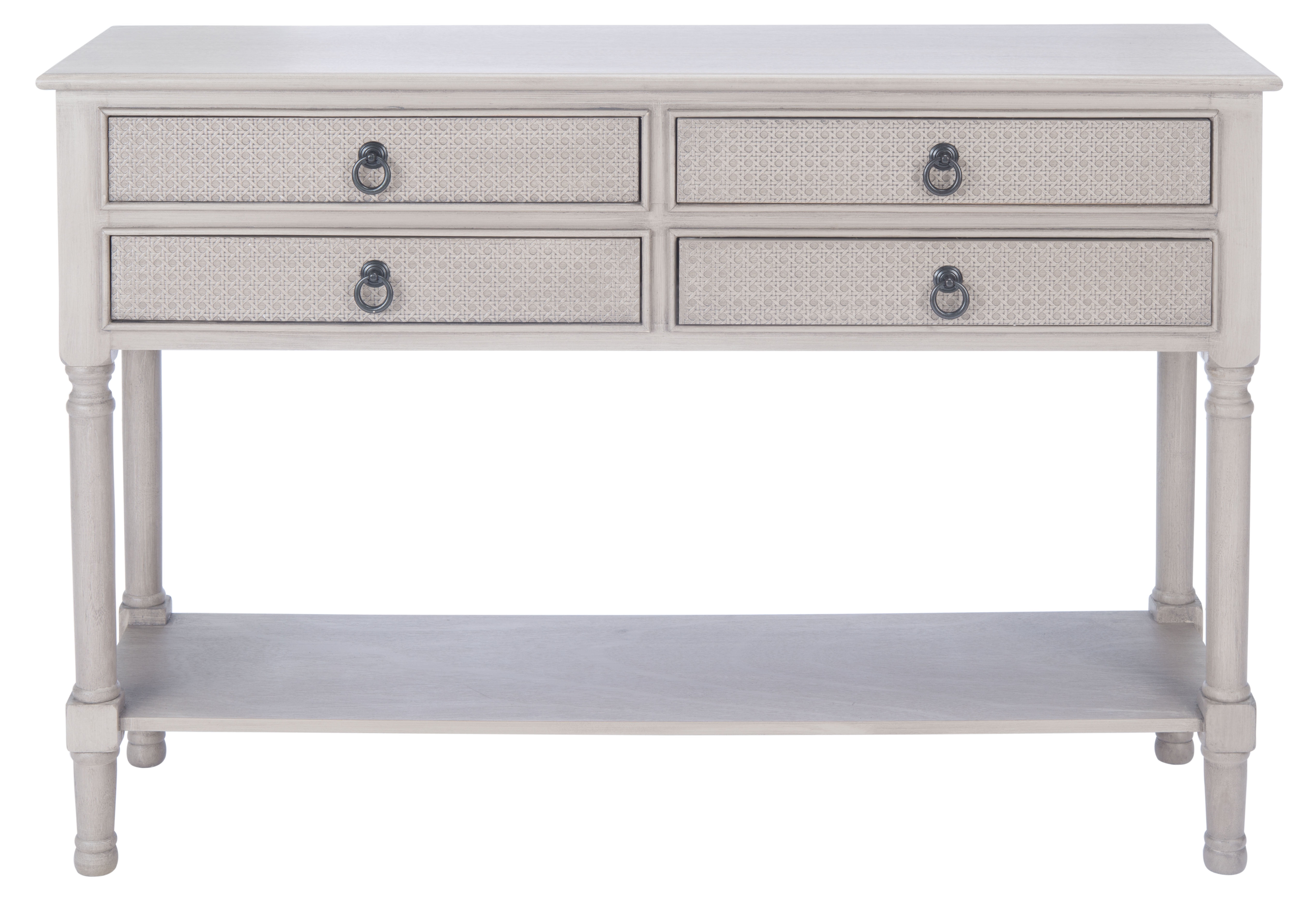 Durable wood frame for long lasting longevity Minor assembly needed Color: Greige Overall Dimension: 42 in. W x 13 in. D x 29.5 in. H Item Weight: 35.2 lbs. Weight Capacity: 40 lbs. Finish Surface Treatment: Water Based Paint Dust regularly with a soft, dry cloth. Never use oiled or treated cloths on lacquered finishes. Some finishes can be wiped with a damp (not wet) cloth, followed at once by rubbing with a dry cloth to remove fingerprints and smudges. For persistent spots, gently clean with a soft cloth and a solution of water and mild soap, make sure to wipe dry. Use adhesive felt pads, coasters and placemats to protect your furniture. Drawer Dimensions: 17.3 in. W x 8.7 in. D x 2.6 in. H Quantity of Drawers: 4 Shelf Dimensions: 37.6 in. W x 8.4 in. D x 12.4 in. H Frame Type: Wood Wood Content: Pine/Mdf Metal Type (Hardware Material)/Embellishment Material: Zinc Alloy