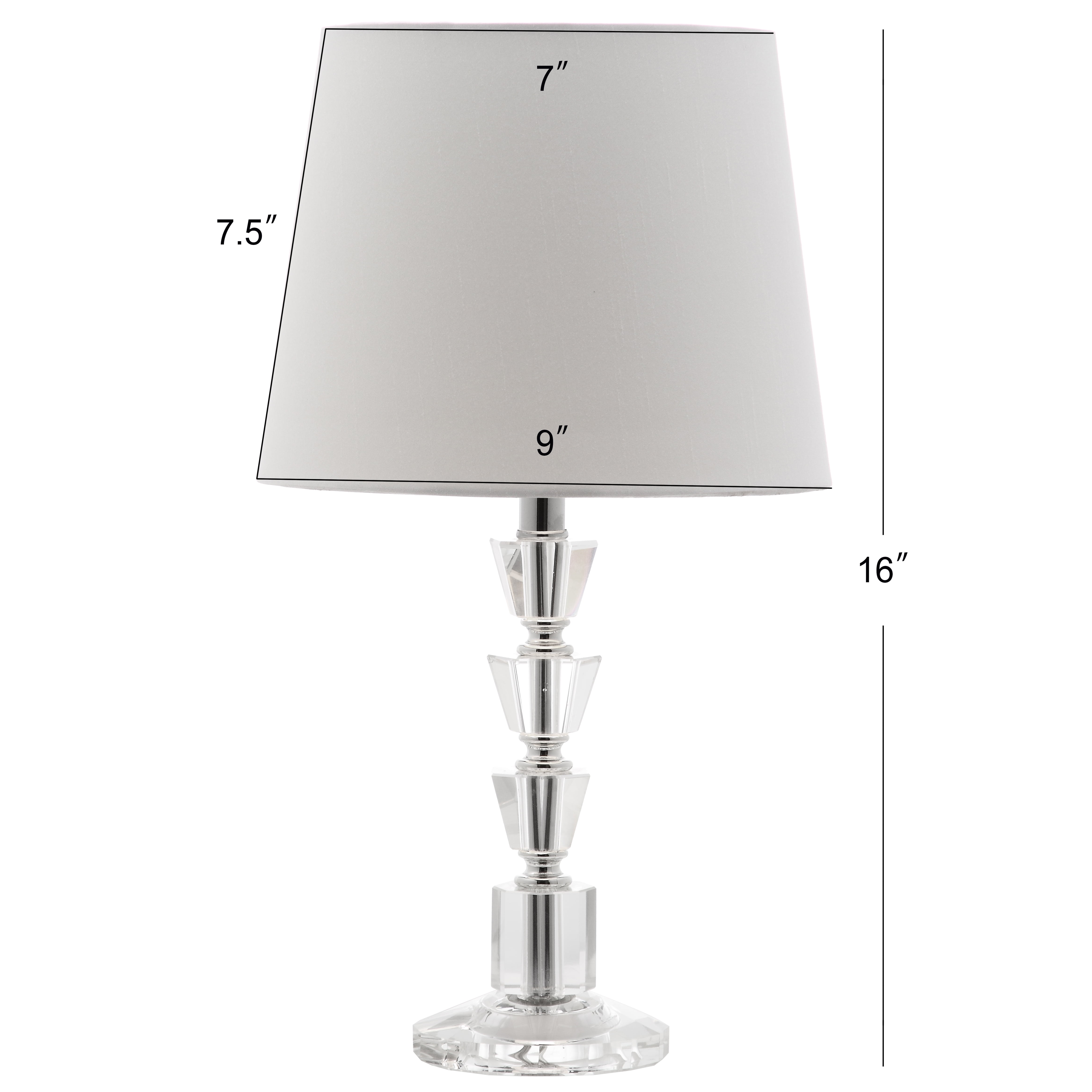 Contemporary design adds a chic look to your home Durable crystal frame for long lasting longevity Easy to clean and maintain Minor assembly needed Color: Clear Metal Finish: Chrome Crafted with: Crystal Item Weight: 4.4 lbs Item Dimensions: 9 in. W x 9 in. D x 16 in. H Shade Color: Off-White Shade Material: 30% Cotton; 70% Polyester Shade Height: 7 in. Shade Bottom Dimension: 9 in. W x 9 in. L Shade Top Dimension: 7 in. W x 7 in. L Shade Shape: Drum Cord Color: Clear Cord Length: 60 in. Lamp Certification: UL Light Bulb Base Type: E26 Screw Terminal Switch Mechanism: Rotary Switch Type of Bulb Included: E26 LED G45 4W Max Wattage: 13W Watt: 9W Lumen: 550 Quantity of Bulb(s): 2 Bulb Size: 46 mm. W x 46 mm. Dx 105 mm. H Bulb Box Size: 48 mm. W x 48 mm. D x 120 mm. H Country of Origin: China