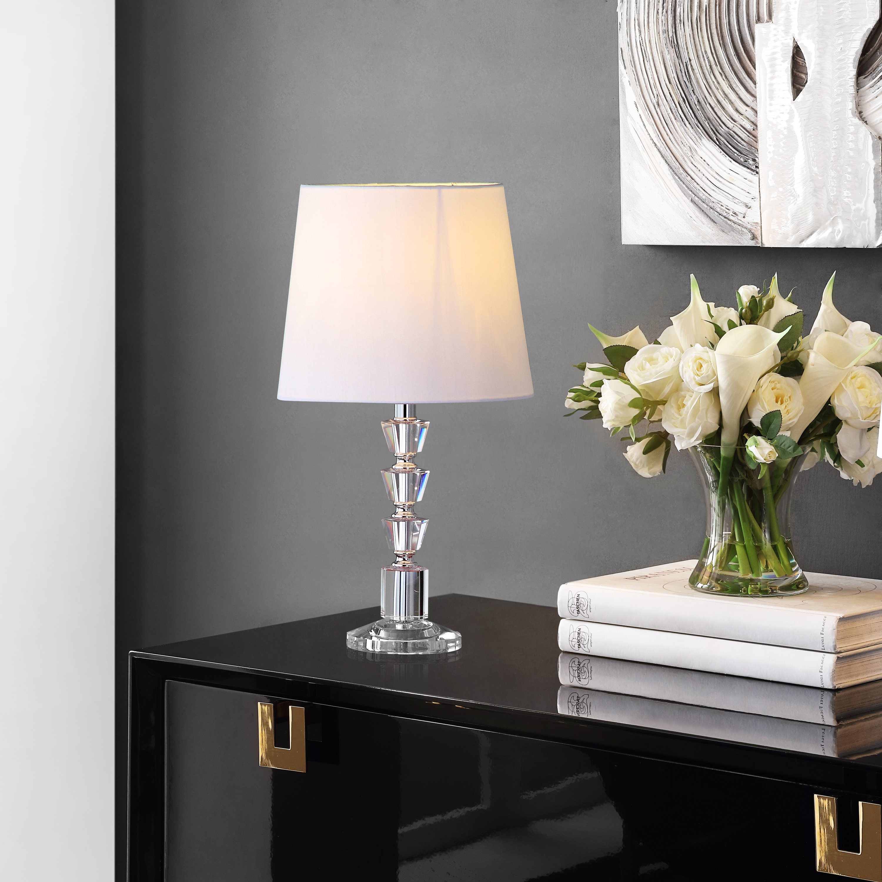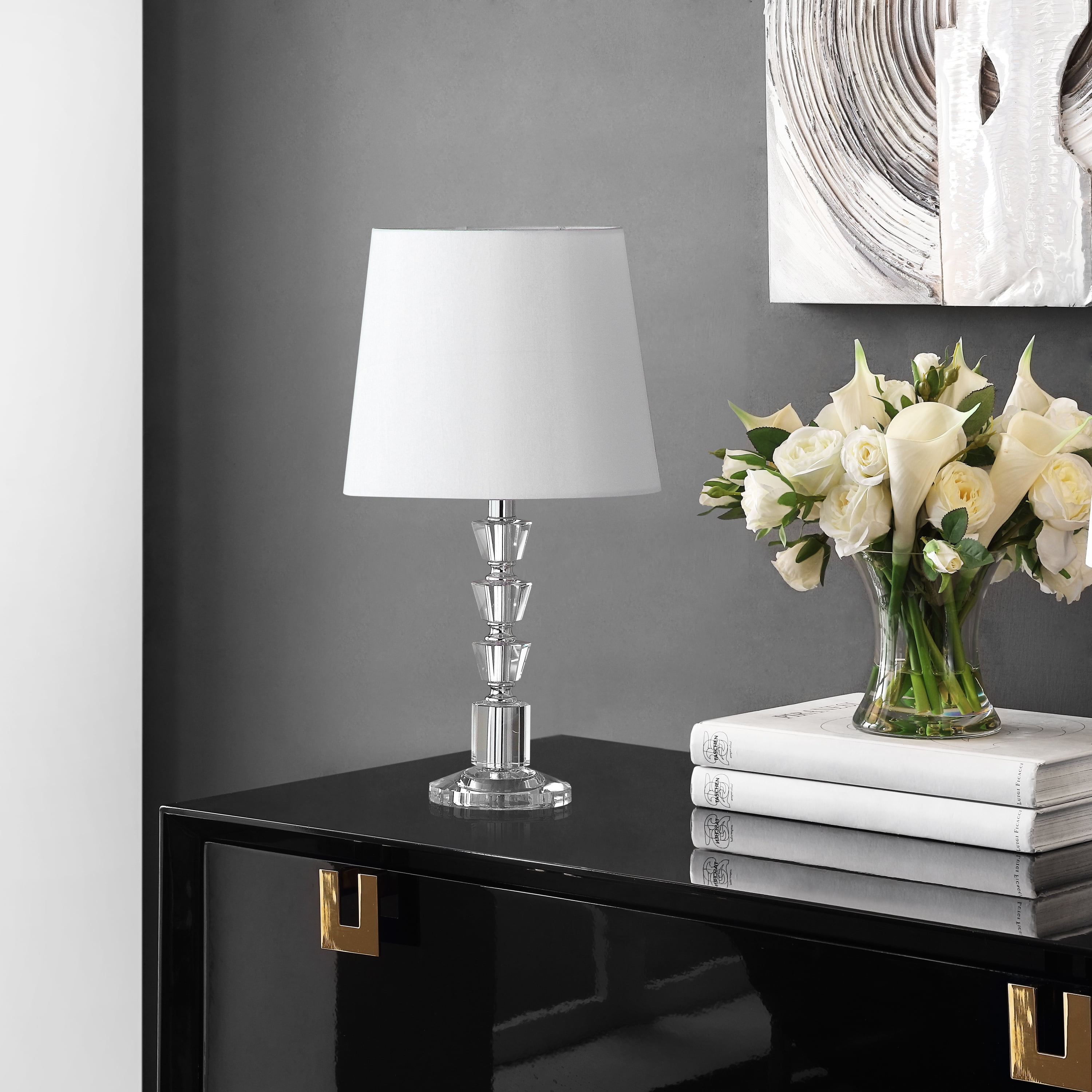 Shop Safavieh at . Save Money. Live Better. SAFAVIEH Harlow 16 in. 2-Lt. Crystal Table Lamp with Off-white Polyester Shade, Set of 2 Brimming with Hollywood glamour, the Harlow Tiered Crystal Orb table lamp evokes luxurious 1920’s style. A base of glimmering crystal forms adds a touch of drama to a console or sofa table, and an off white barrel shade disperses a soft romantic glow. Sold in sets of two.