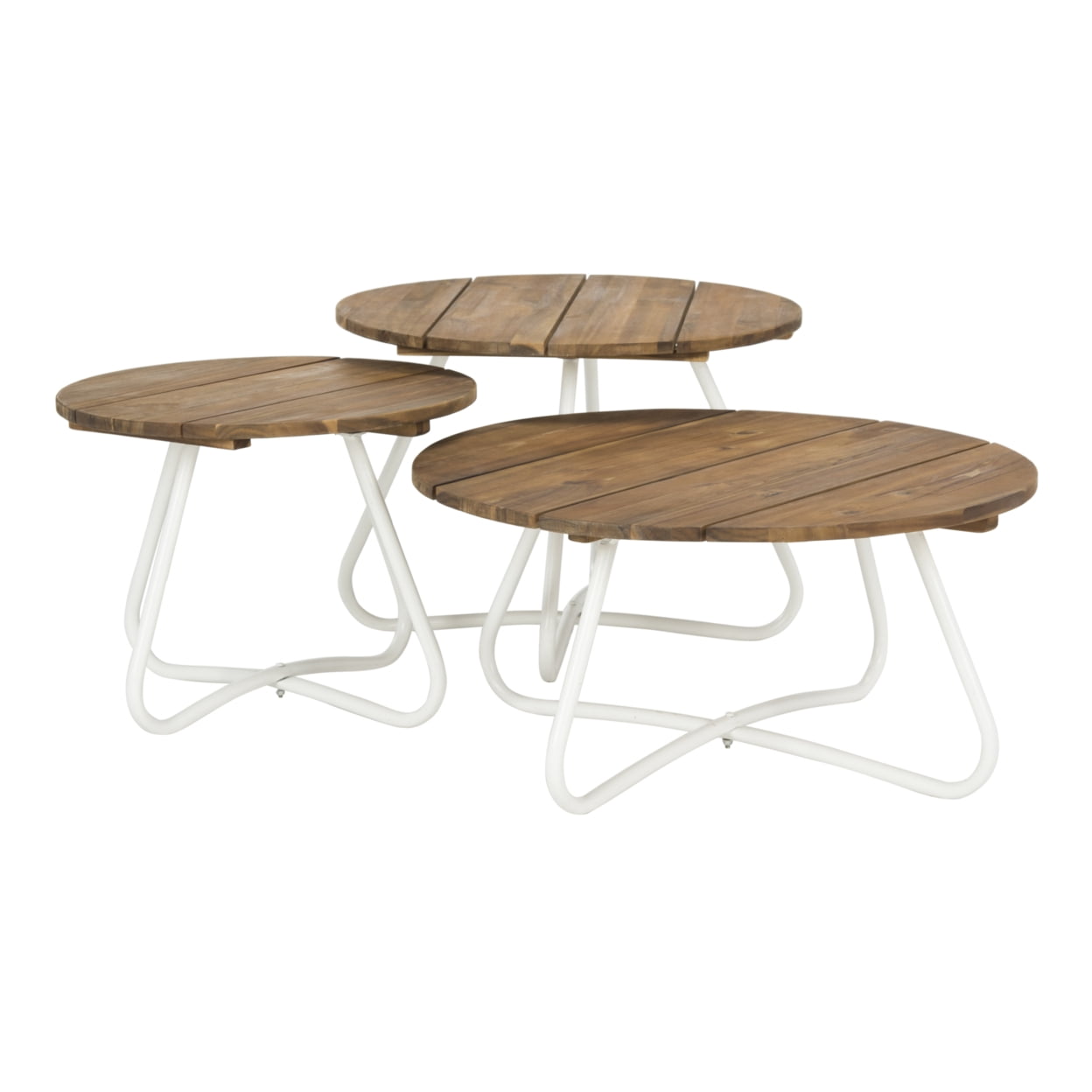 Contemporary design adds a chic look to your home Durable acacia wood frame for long lasting longevity Minor Assembly Required Color: Natural/White Large Dimensions: 27.56 in. W x 27.56 in. D x 14.17 in. H Medium Dimensions: 23.62 in. W x 23.62 in. D x 18.11 in. H Small Dimensions: 19.69 in. W x 19.69 in. D x 15.75 in. H 3 piece set Weight Capacity: 30 lbs each table Accessories in Life Style photo not included Please note: The images and product dimensions on our website are as accurate as possible. Due to differences in computer monitors, some item’s color may vary slightly. Store outdoor furniture indoors or cover well when not in use. Remove wooden furniture from standing water. Dust regularly with small brush or vacuum. Spills should be taken care of immediately before they harden or stain with a slightly dampened sponge.