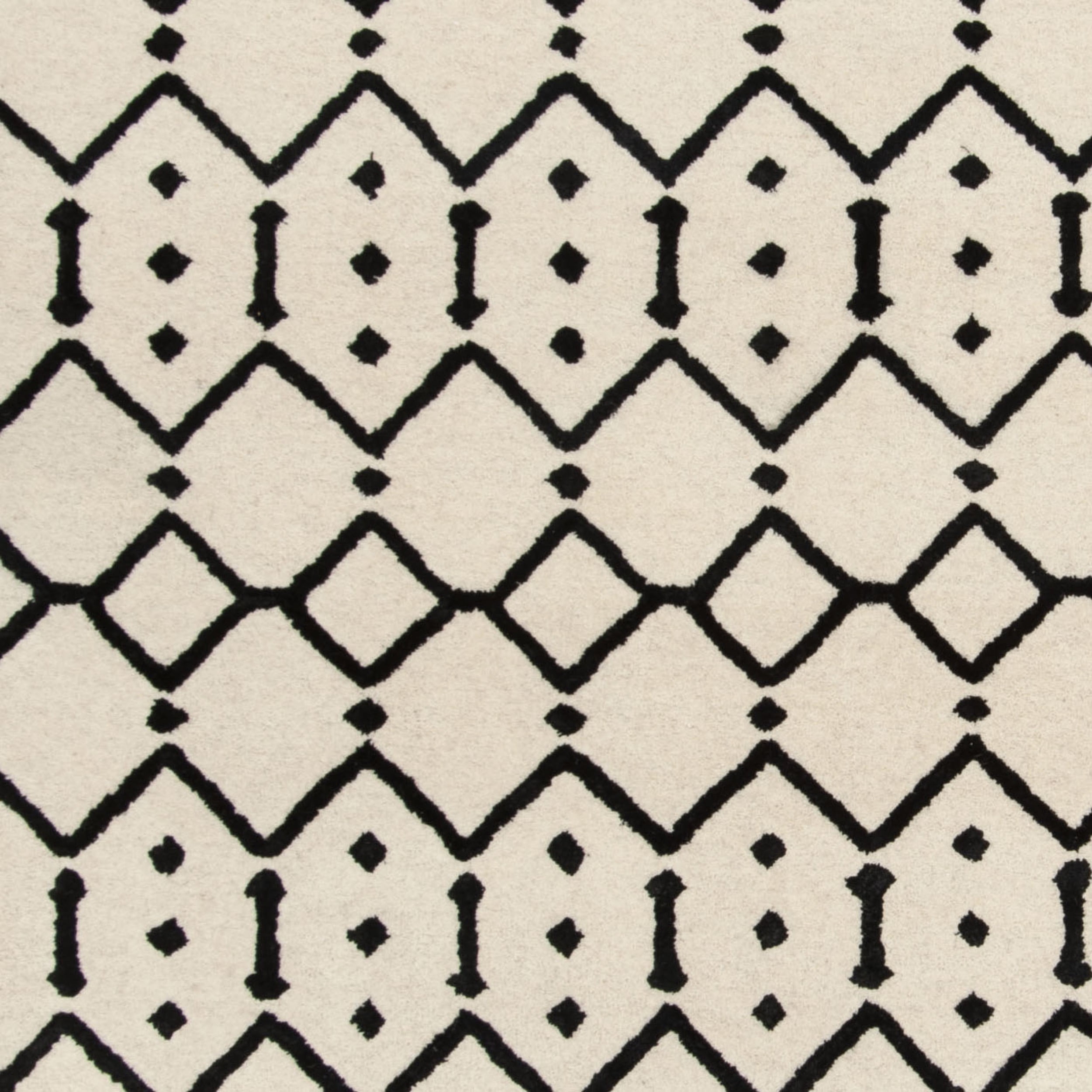 Color: Ivory/Black Size: 9′ x 12′ Hand Tufted in India Pile Height: 0.25 in. Cotton backing, rug pad (sold separately) recommended to help prevent shifting and sliding 100% Wool Stylish addition for any room Accessories in lifestyle photos not included New wool rugs shed as a natural consequence of how they are made; vacuum a new wool rug 1-2 times a week for the first few weeks using a low pressure vacuum cleaner without beater bars; vacuum in the direction of the pile, not against it; do not pull loose ends or stray loops, clip them with scissors to remove Vacuum (preferably one without beater bars) regularly and spot clean; for hard-to-remove stains, professional rug cleaning is recommended; rotating your rugs every 3-6 months will protect against uneven wear from foot traffic and furniture weight Use rug protectors under the legs of heavy furniture to avoid flattening piles Avoid direct sunlight as it will cause the colors in your area rug to fade over time; place your area rug away from direct sunlight whenever possible For an instant decorating makeover, this area rug is one of the easiest and most fashionable ways to refresh a room with character and style. Please note: The images and product dimensions on our website are as accurate as possible. Due to differences in computer monitors, some rug colors may vary slightly. Lengths and widths may vary from the published dimensions. We do our best to provide you with an exact measurement, but please be advised that some variation exists. Patterns may vary slightly according to shape and size selected. Packing and shipping of your rug may cause temporary creases; these surface waves are not imperfections or damages and will gradually recede; back-rolling or reverse rolling is the fastest and easiest way to remove creases in your area rug; allow ample time for your rug to settle, these creases and waves will normally flatten out Available in multiple color and sizes For carpet-to-carpet use, we recommend placing a hold pad in-between for protection
