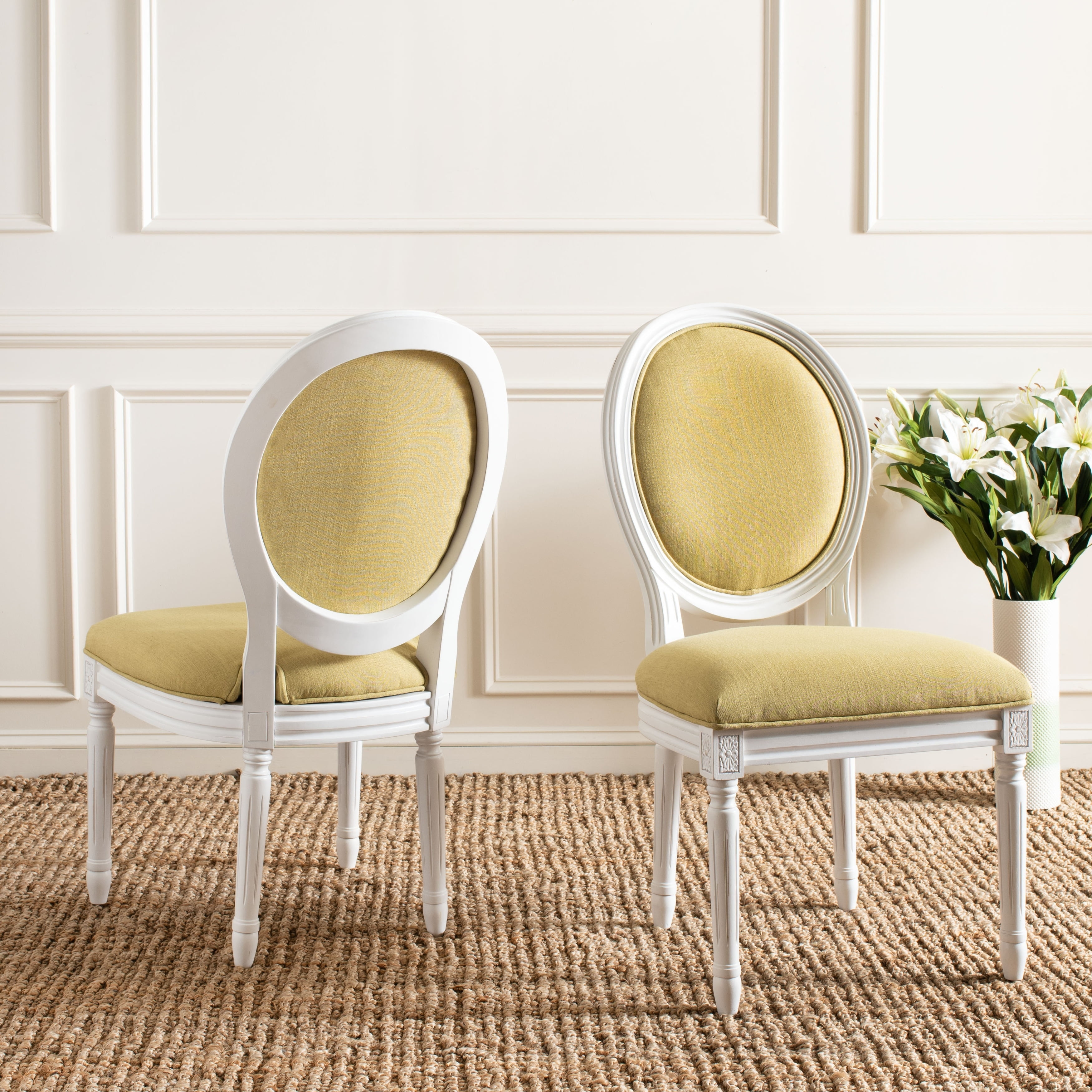 Brimming with French country charm this set of two dining chairs boasts a pretty cream frame spring green linen upholstery and Provencal-style oval back Classic carving adorns these chic side chairs which are scaled to work beautifully in any room Fabric:Linen Material:Rubber Wood