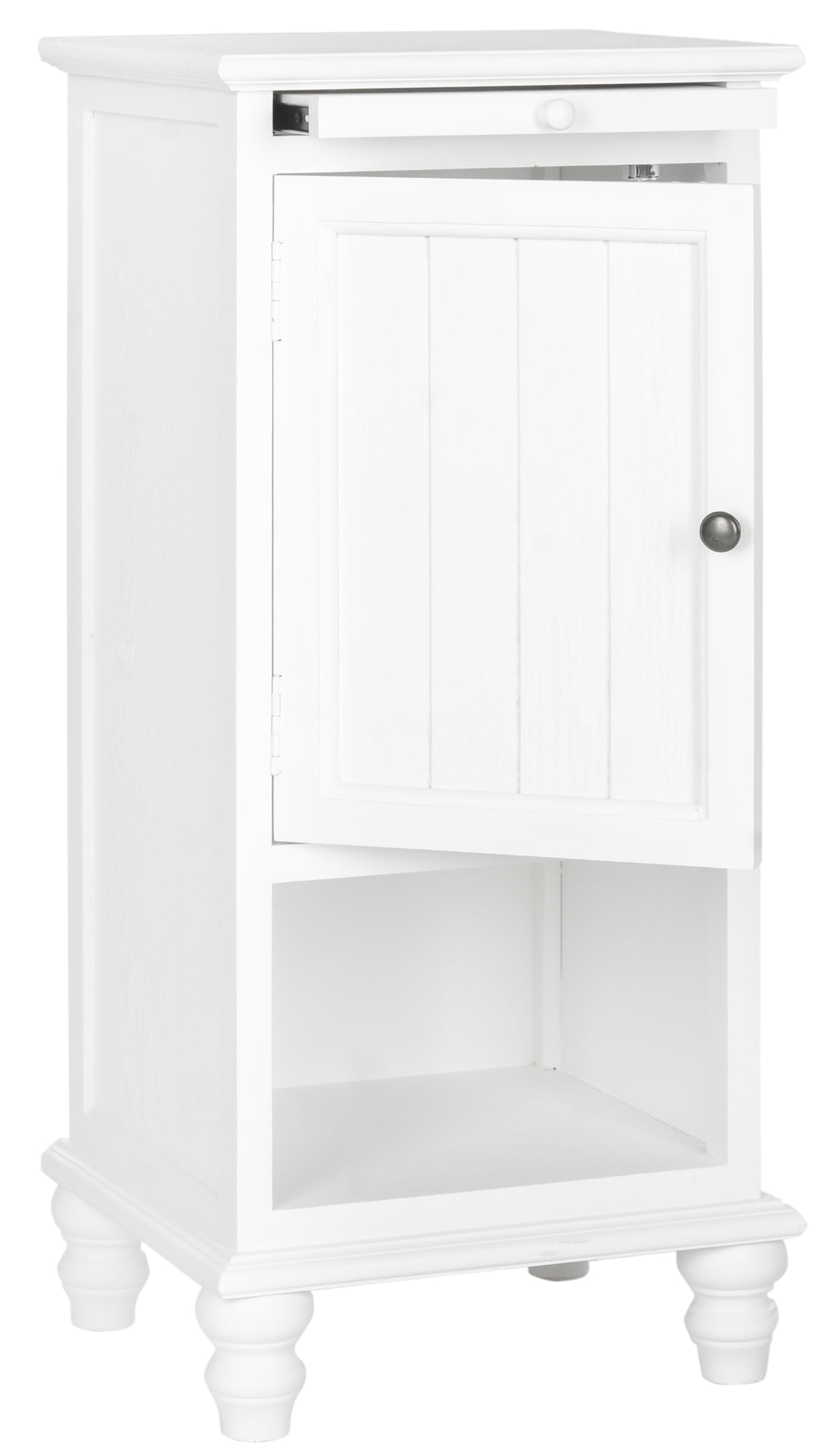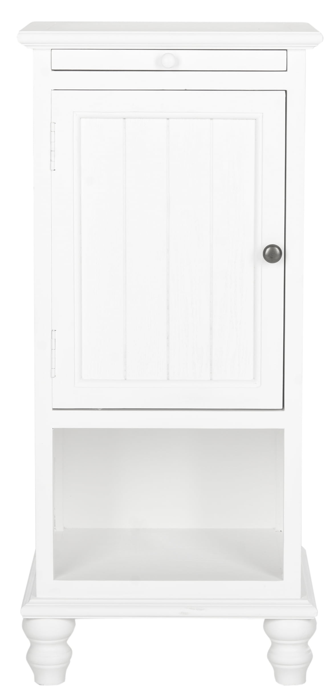Contemporary design adds a chic look to your home Durable poplar wood frame for long lasting longevity No assembly needed Color: White Item Dimensions: 16.1 in. W x 14.2 in. D x 36 in. H Shelf Dimensions: 12.5 in. W x 12.5 in. D x 8.2 in. H Cabinet: 12.5 in. W x 12.5 in. D x 17.2 in. H Item Weight: 17.6 lbs Weight Capacity: 15 lbs. for pull out shelf Accessories in life style photo(s) not included Please note: The images and product dimensions on our website are as accurate as possible. Due to differences in computer monitors, some item’s color may vary slightly. Wood is a natural material with variations of color shade, configuration, streaks, and grain structure. Each individual piece of Safavieh furniture has characteristic markings that will differ from photo and showroom samples. Regular attention and maintenance of fine furniture can ensure its beauty for years to come. Always use felt pads under all articles to prevent discoloration or softening of the lacquer. Plastic and rubber bases on items can discolor wood. Dust regularly with a soft, dry cloth. Never use oiled or treated cloths on lacquered finishes. Some finishes can be wiped with a damp (not wet) cloth, followed at once by rubbing with a dry cloth to remove fingerprints and smudges. For persistent spots, gently clean with a soft cloth and a solution of water and mild soap, make sure to wipe dry. Use adhesive felt pads, coasters and placemats to protect your furniture.