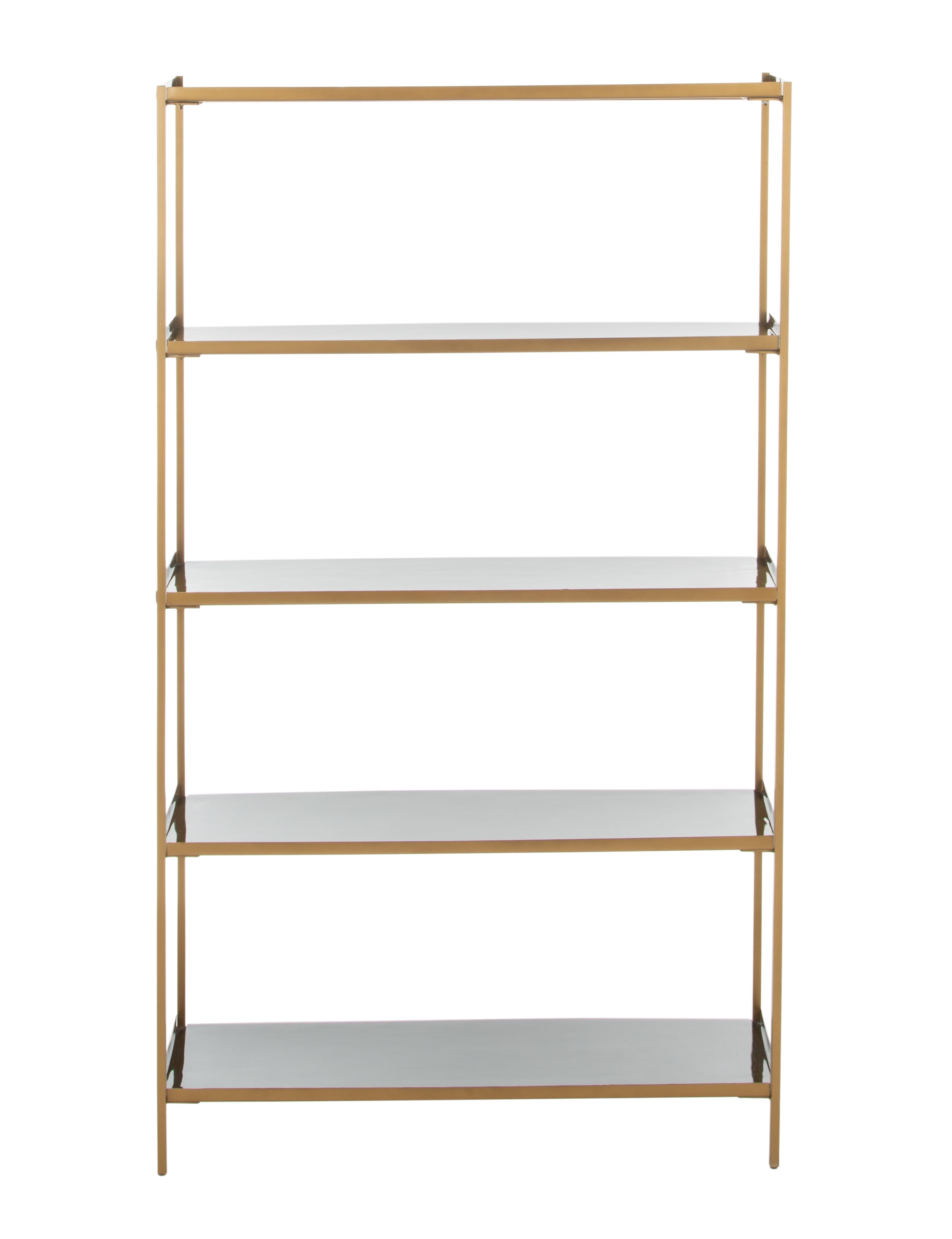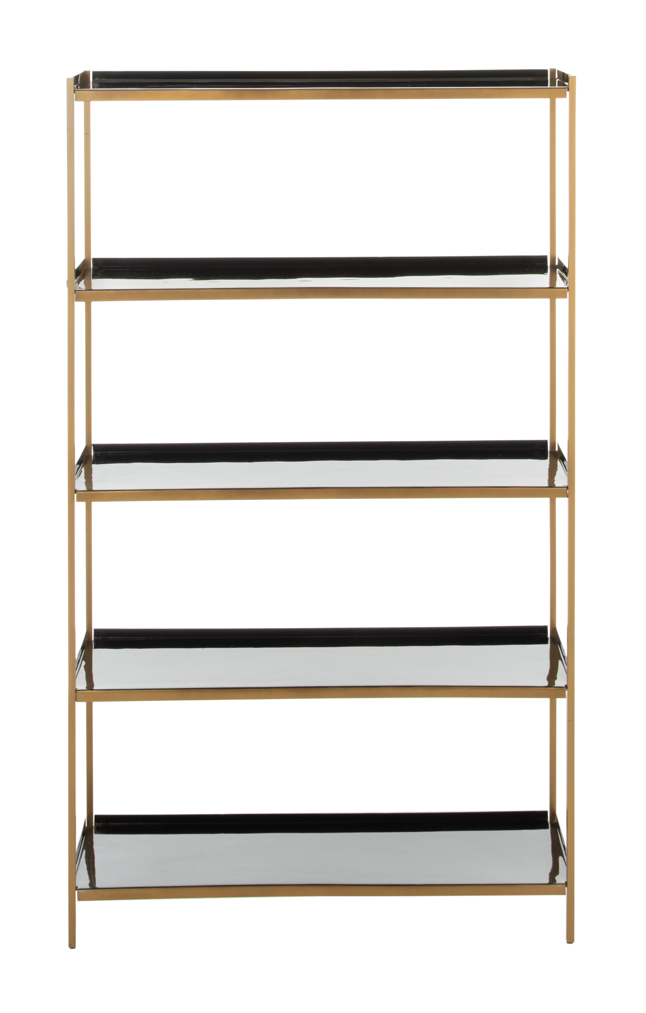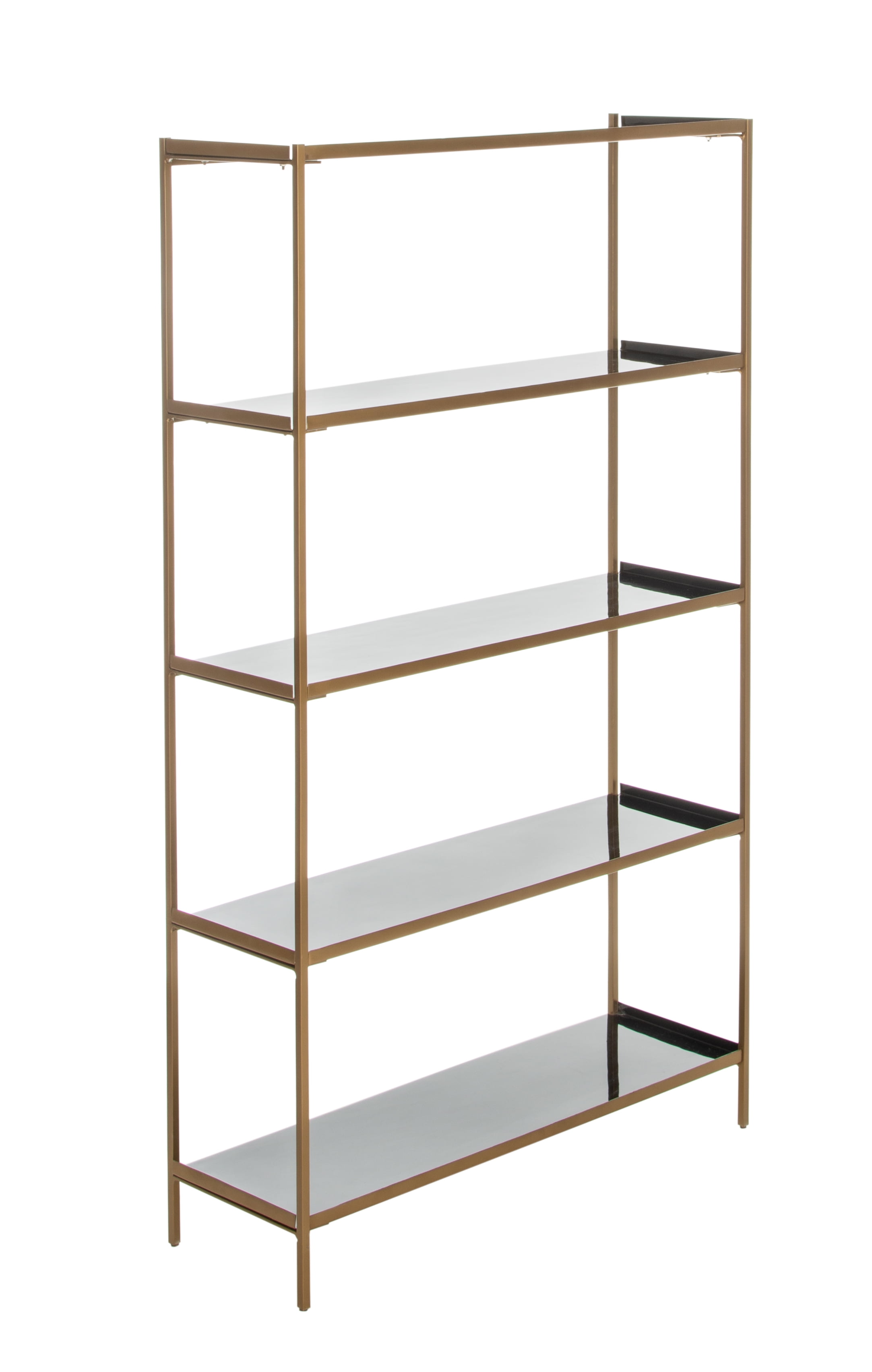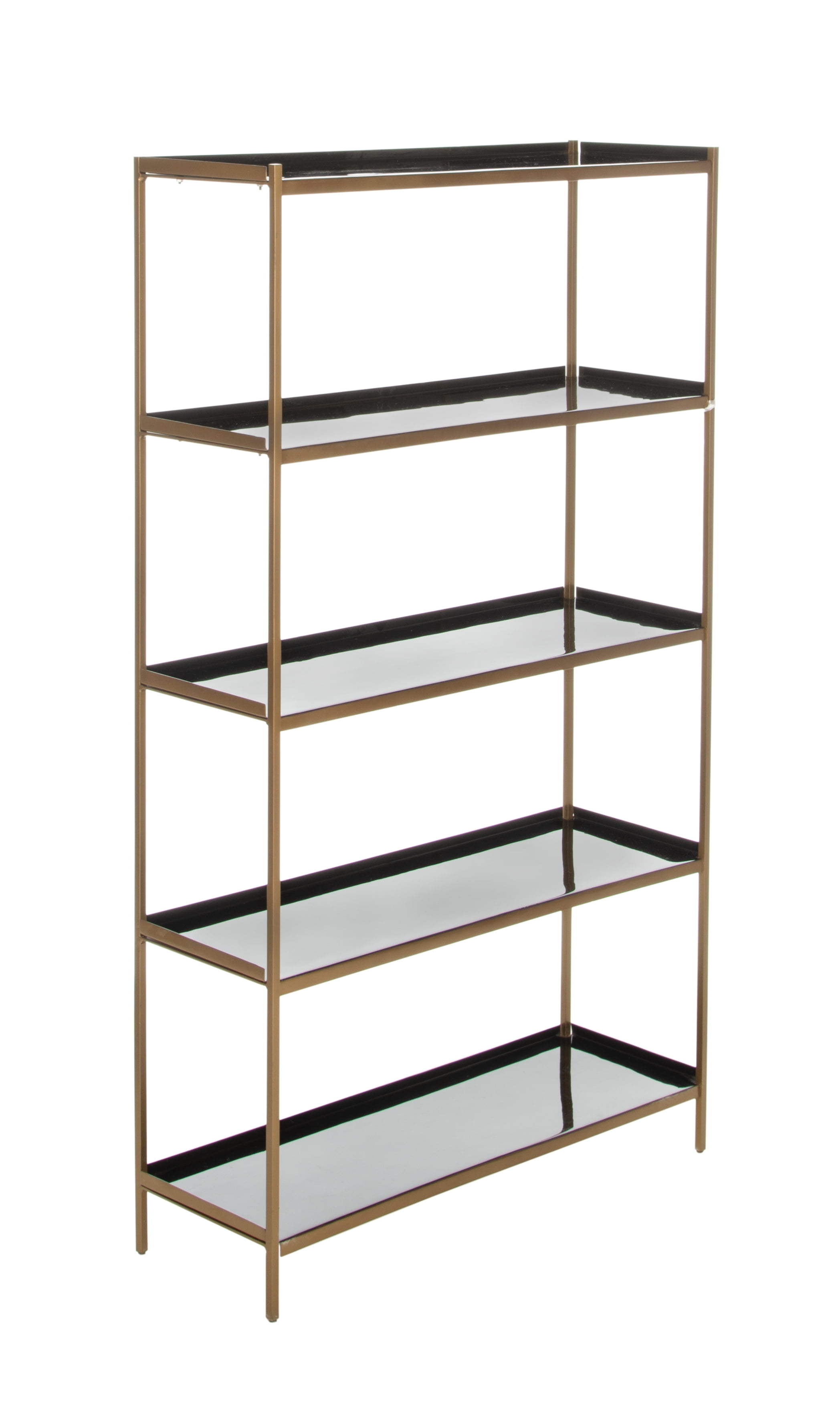 Contemporary design adds a chic look to your home Durable iron frame for long lasting longevity Minor assembly needed Color: Black/Brass Frame Color: Brass Finish Surface Treatment: Enamel/TPR Metal Color: Brass Assembled dimensions: 28 in. W x 10 in. D x 28 in. H Features 5 shelves for ample storage Shelf Dimensions: 30 x 10 Item Weight: 45.1 lbs. Weight capacity: 50 lbs. Accessories in life style photo(s) not included Please note: The images and product dimensions on our website are as accurate as possible. Due to differences in computer monitors, some furniture colors may vary slightly. Lengths and widths may vary from the published dimensions. We do our best to provide you with an exact measurement, but please be advised that some variation exists. Dust regularly with a soft, dry cloth. Never use oiled or treated cloths on lacquered finishes. Some finishes can be wiped with a damp (not wet) cloth, followed at once by rubbing with a dry cloth to remove fingerprints and smudges. For persistent spots, gently clean with a soft cloth and a solution of water and mild soap, make sure to wipe dry. Use adhesive felt pads, coasters and placemats to protect your furniture.