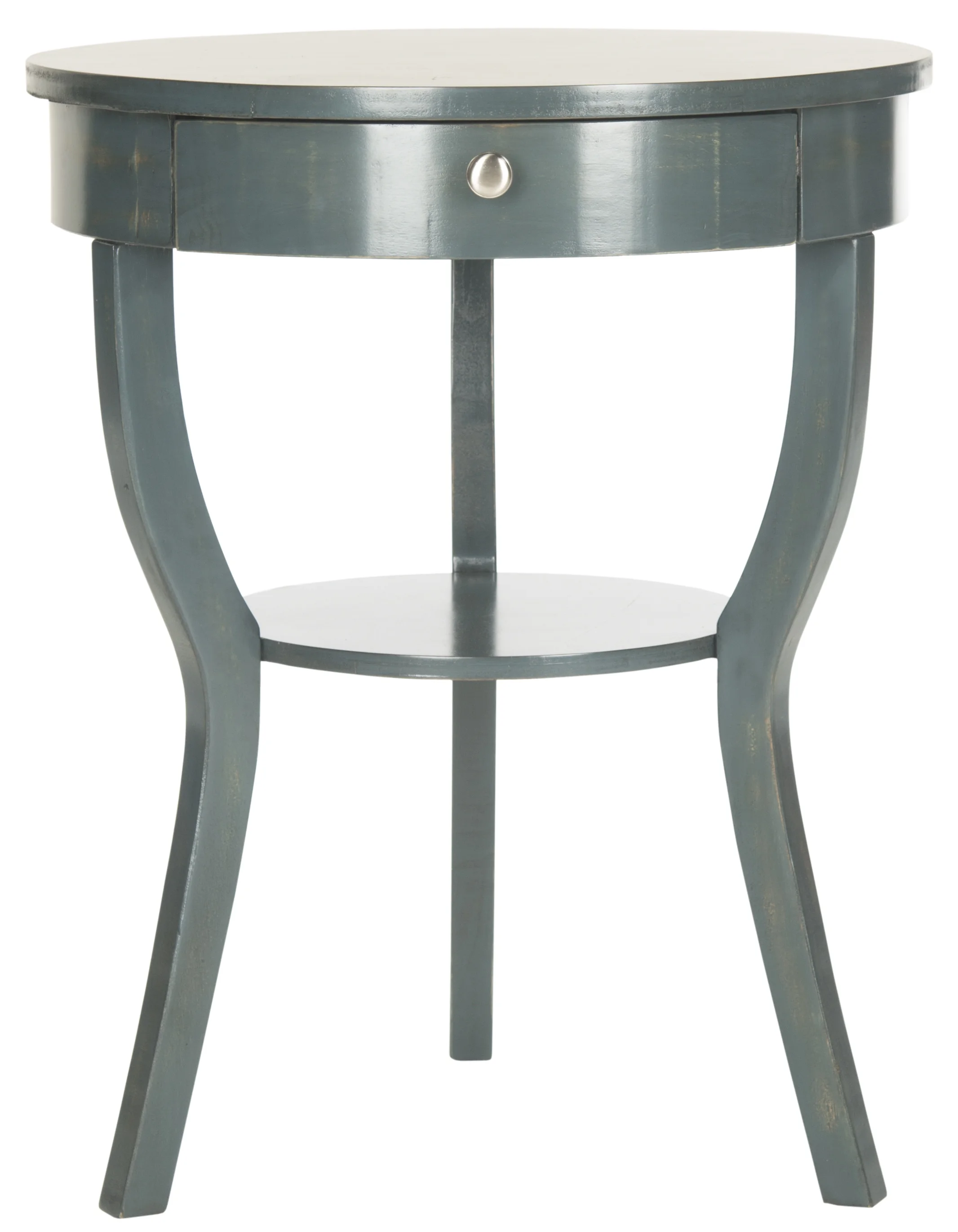 The classically styled Kendra End Table assumes a fashion edge with chic colors and finishes. Its round top and shelf supported by whimsical splayed legs look fresh and new. Great with reading lamps beside a sofa or chair, the Kendra End Table transitions beautifully into the bedroom.