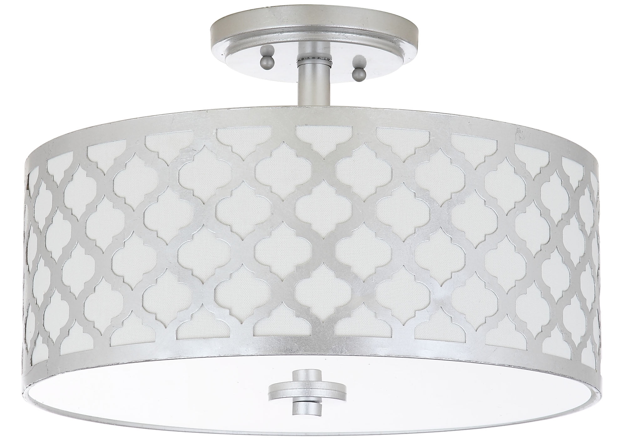 Contemporary design adds a chic look to your home Durable frame for long lasting longevity Easy to clean and maintain Minor assembly needed Color: Silver Shade Color: Off-White Item Dimensions: 15 in. W x 15 in. D x 10.5 in. H Crafted with Iron/Acrylic Shade Material: 100% Cotton Shade Height: 6 in. H Shade Bottom Dimensions: 15 in. L x 15 in. W Shade Top Dimensions: 15 in. W x 15 in. L Cord Color: Black/White Cord Length: 6 in. Pendant Dimension: 6 in. Lamp Certification: UL Canopy Dimensions: 5.5 in W x 5.5 in. D x 1 in. H Light Bulb Base Type: E12 Type of Bulb Included: C26 Max Wattage: 40W Lumen: 200 Quantity of Bulbs: 3 Accessories in life style photo(s) not included Please note: The images and product dimensions on our website are as accurate as possible. Due to differences in computer monitors, some item’s color may vary slightly. Before cleaning any lamp shade or fixture, disconnect the power source. Wipe with a soft, dry cloth. Avoid the use of chemicals and household cleaners as they may damage the finish.