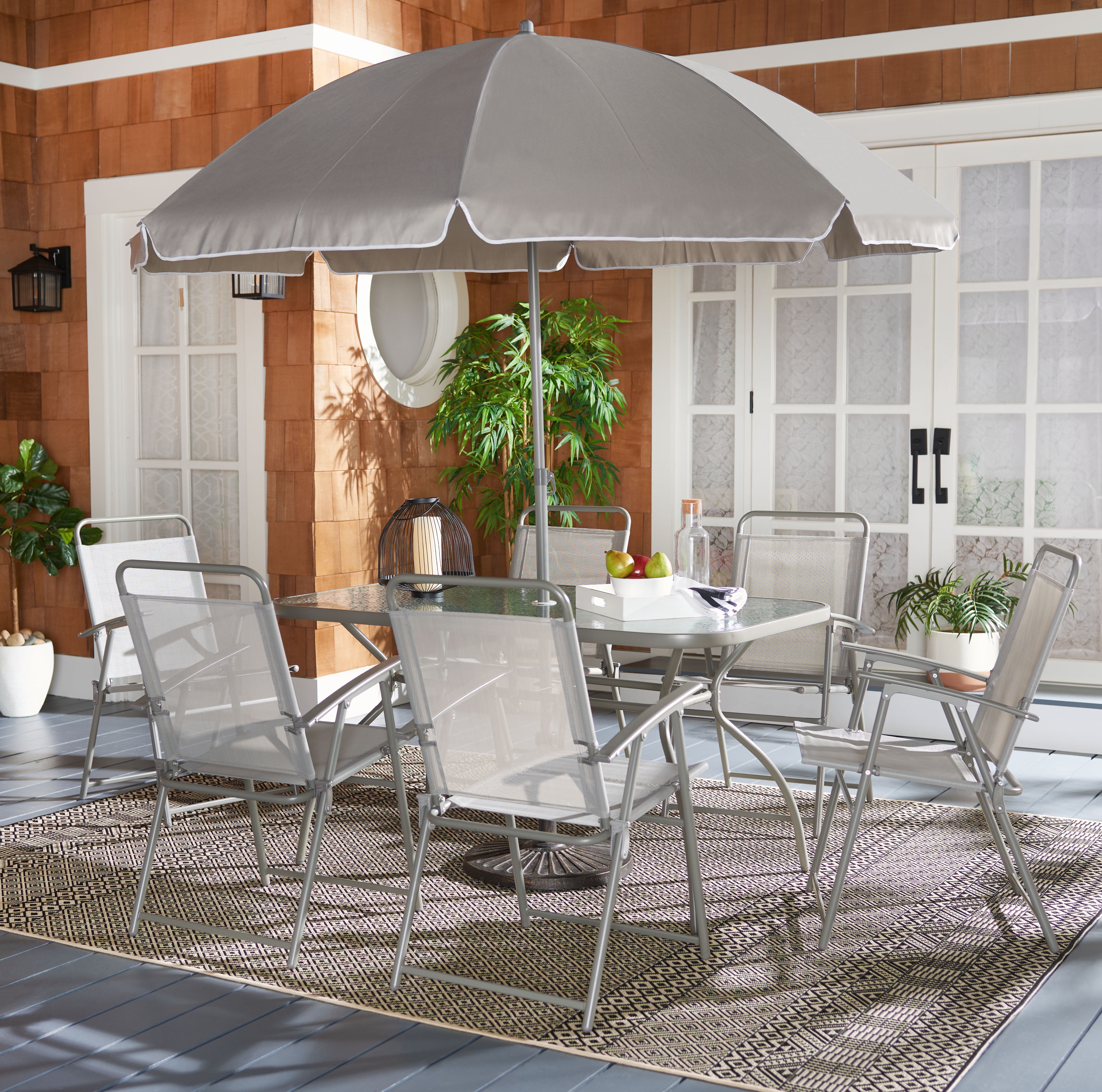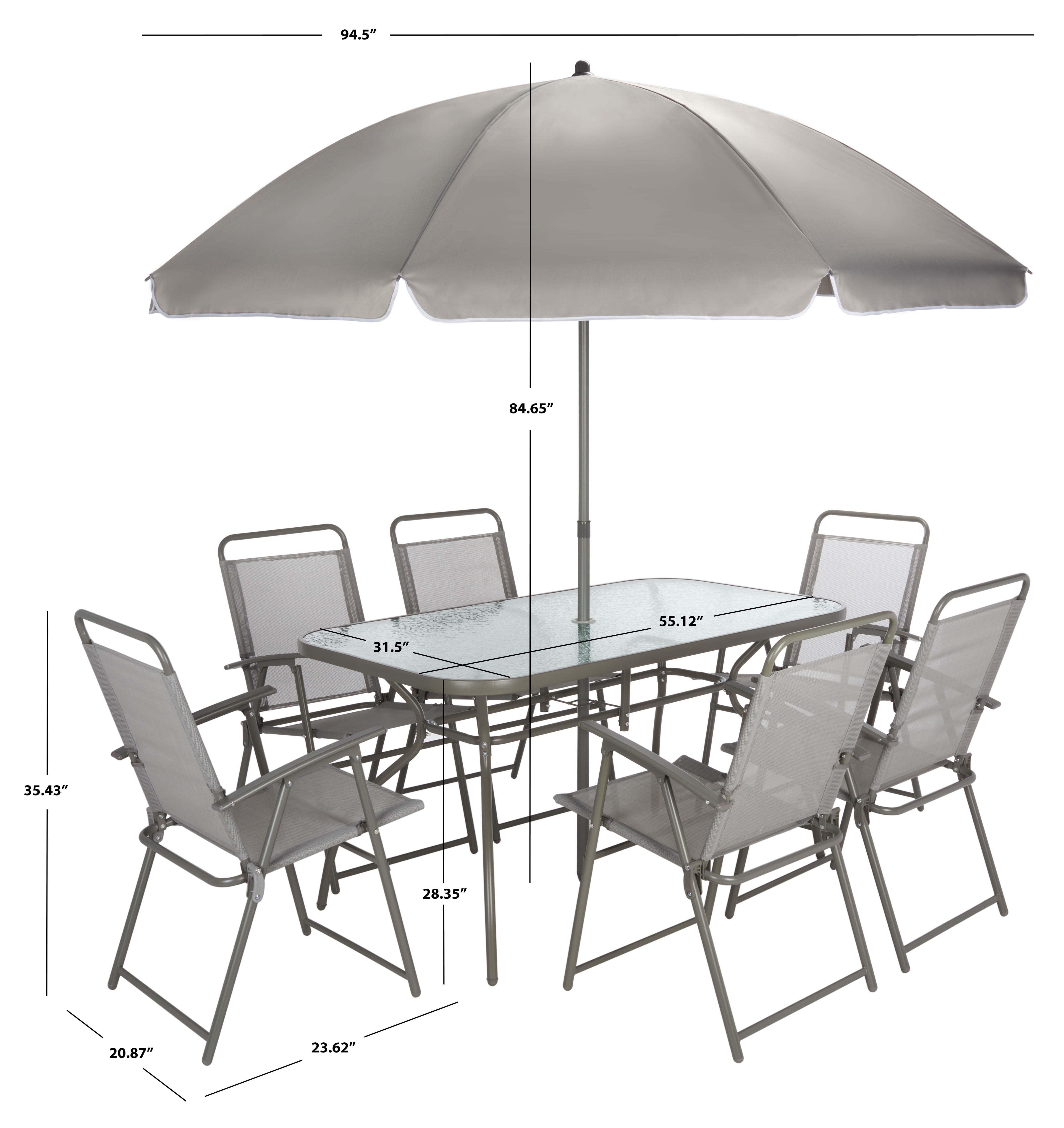 Shop Safavieh at . Save Money. Live Better. SAFAVIEH Laurenti Outdoor Patio 8 Piece Dining Set with Umbrella, Grey This utterly contemporary Laurenti Dining Set brings a wOPTION new level of style to casual outdoor décor. With a glass-topped dining table, six grey foldaway chairs, and chic matching umbrella, Laurenti is a must-have for today’s relaxed outdoor living areas. Add a touch of classic charm to your home with this remarkable piece. Sit back, relax and make memories with family and friends throughout every season with this set.