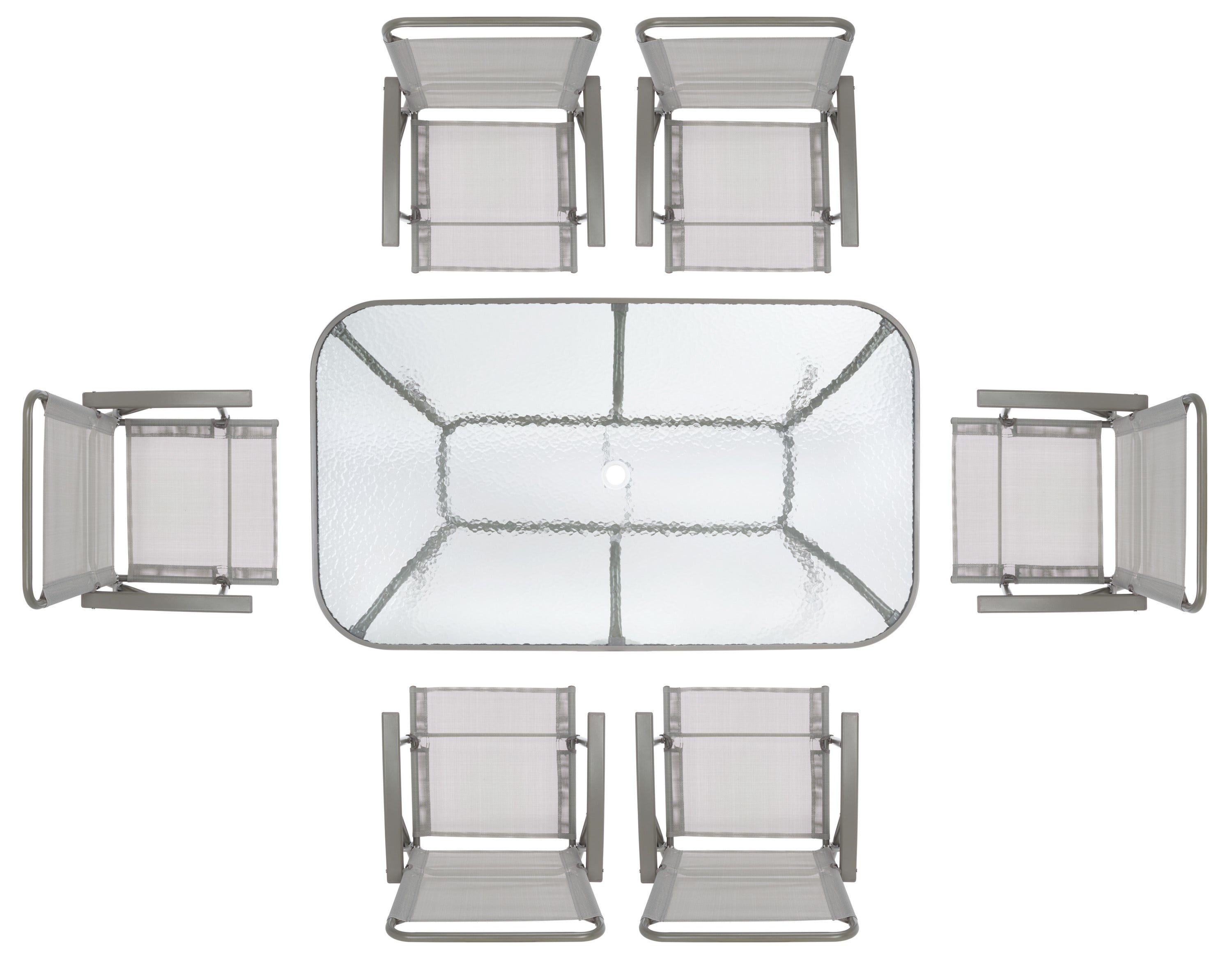 Material: Steel/Textilene/Polyester Minor Assembly Required Color: Grey Frame Material: Steel Polyester Upholstery Item Weight: 79.37 lbs Weight Capacity: 265 lbs Table Dimensions: 15.75 in. W x 15.75 in. D x 27.56 in. H Chair Dimensions: 20.87 in. W x 23.62 in. D x 35.43 in. H Umbrella Dimensions: 74.8 in. W x 74.8 in. x 70.86 in. H Full Seat Dimensions: 20.47 in. W x 23.62 in. D x 17.72 in. H Seat Back Height: 21.65 in. Backrest Height: 35.04 in. Armrest Height: 27.16 in. Backrest Height: 35.04 in. 7 piece set Umbrella Pole: 28 mm. W x 32 mm. D x 0.5 mm H Umbrella Rib Quantity: 8 Finished Surface Treatment: Powder Coating