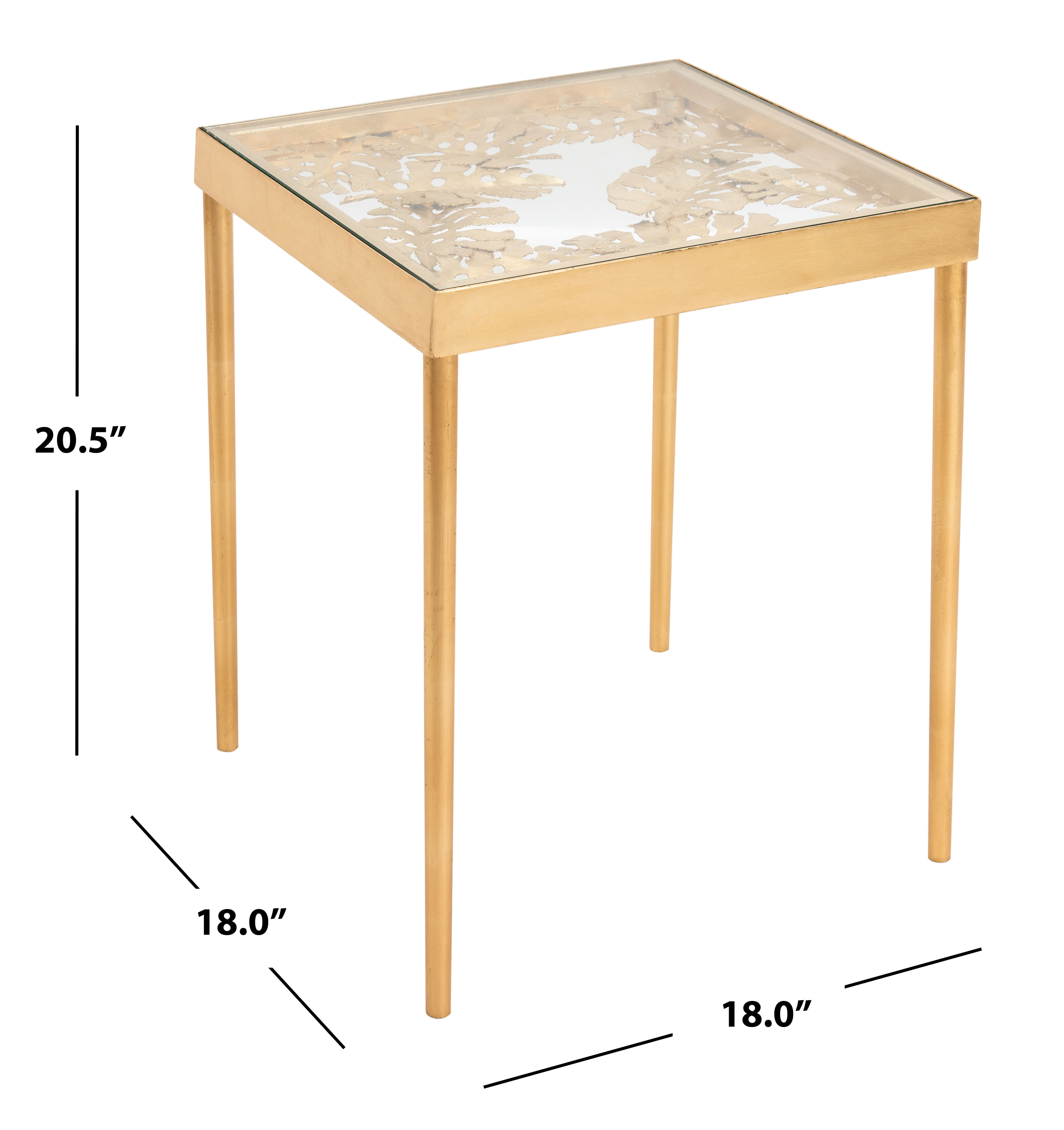 Contemporary design adds a chic look to your home Durable iron frame for long lasting longevity No assembly needed Color: Gold Leaf Frame Color: Gold Table Top Color: Clear Metal Color: Gold Assembled dimensions: 18 in. W x 18 in. D x 18 in. H Item Weight: 17.92 lbs. Weight capacity: 30 lbs. Accessories in life style photo(s) not included Please note: The images and product dimensions on our website are as accurate as possible. Due to differences in computer monitors, some furniture colors may vary slightly. Lengths and widths may vary from the published dimensions. We do our best to provide you with an exact measurement, but please be advised that some variation exists. Dust regularly with a soft, dry cloth. Never use oiled or treated cloths on lacquered finishes. Some finishes can be wiped with a damp (not wet) cloth, followed at once by rubbing with a dry cloth to remove fingerprints and smudges. For persistent spots, gently clean with a soft cloth and a solution of water and mild soap, make sure to wipe dry. Use adhesive felt pads, coasters and placemats to protect your furniture.