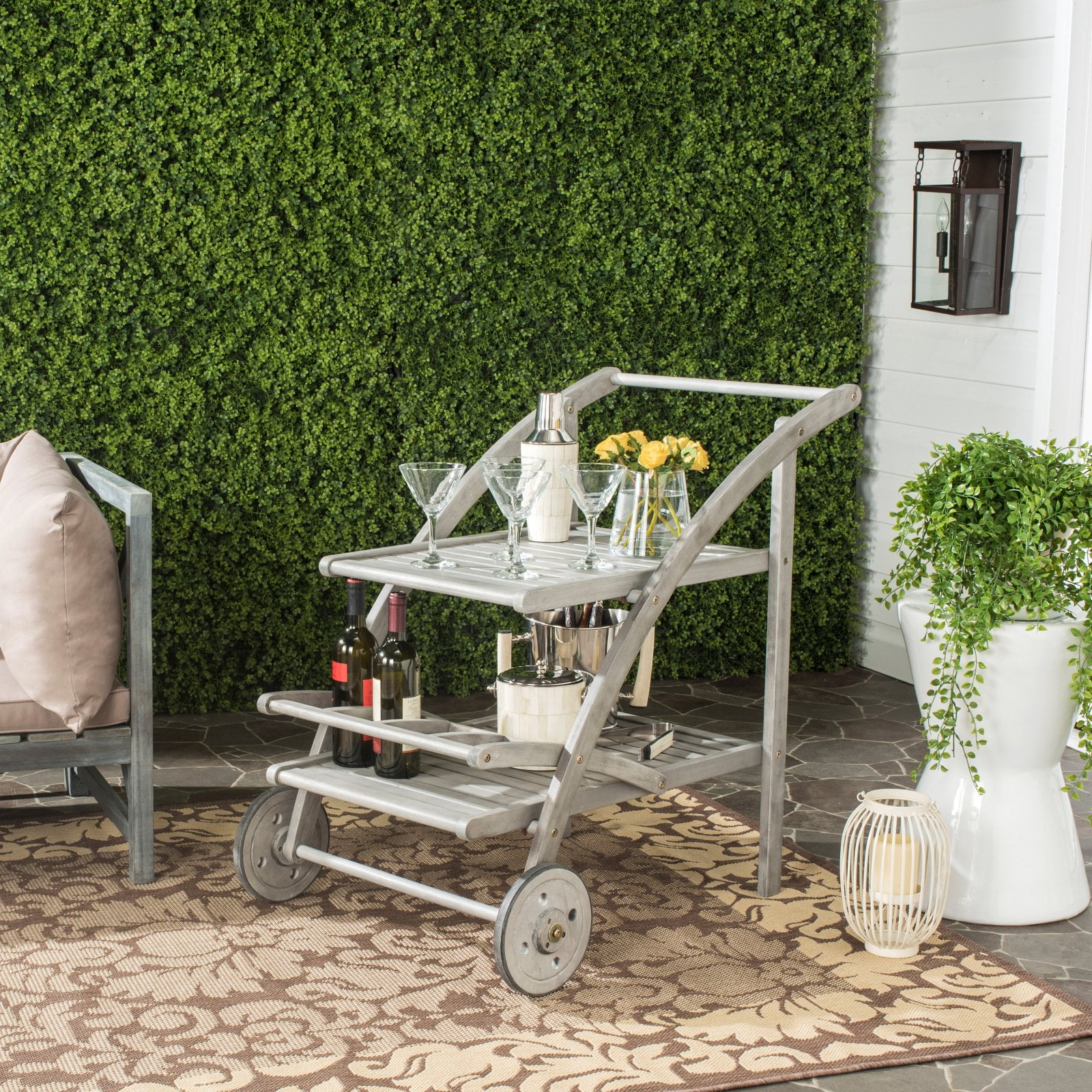 Shop Safavieh at . Save Money. Live Better. Safavieh Lodi Indoor/Outdoor Contemporary Tea Cart The focal point of any backyard dinner party, the highly portable Lodi outdoor tea cart is as functional as it is good looking. Perfect for transporting and displaying goodies, Lodi is crafted of eco-friendly acacia wood in a grey wash finish.