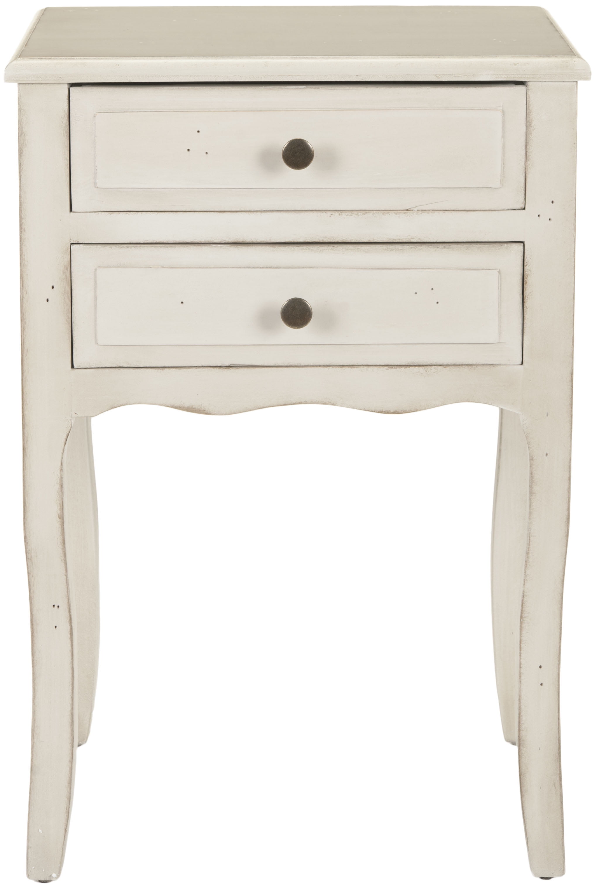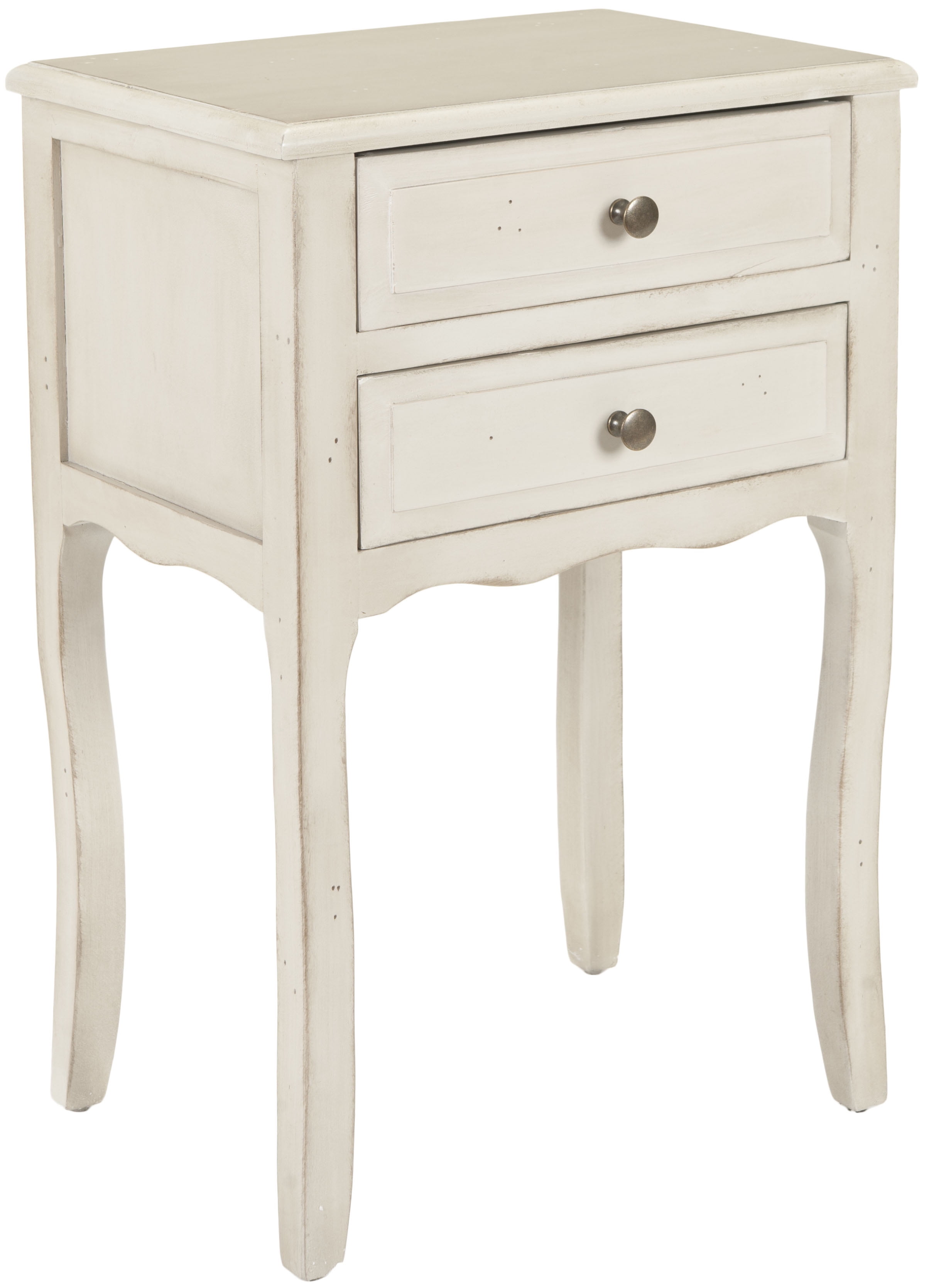 Contemporary design adds a chic look to your home Durable poplar wood frame for long lasting longevity No assembly needed Color: White Item Dimensions: 18.1 in. W x 13 in. D x 26.8 in. H Drawer Dimensions: 14.17 in. W x 11.61 in. D x 3.94 in. H 2 drawers for ample storage Item Weight: 15.4 lbs Weight Capacity: 20 lbs. each drawer Wood is a natural material with variations of color shade, configuration, streaks, and grain structure. Each individual piece of Safavieh furniture has characteristic markings that will differ from photo and showroom samples. Regular attention and maintenance of fine furniture can ensure its beauty for years to come. Always use felt pads under all articles to prevent discoloration or softening of the lacquer. Plastic and rubber bases on items can discolor wood. Accessories in life style photo(s) not included Please note: The images and product dimensions on our website are as accurate as possible. Due to differences in computer monitors, some furniture colors may vary slightly. Lengths and widths may vary from the published dimensions. We do our best to provide you with an exact measurement, but please be advised that some variation exists. Dust regularly with a soft, dry cloth. Never use oiled or treated cloths on lacquered finishes. Some finishes can be wiped with a damp (not wet) cloth, followed at once by rubbing with a dry cloth to remove fingerprints and smudges. For persistent spots, gently clean with a soft cloth and a solution of water and mild soap, make sure to wipe dry. Use adhesive felt pads, coasters and placemats to protect your furniture.