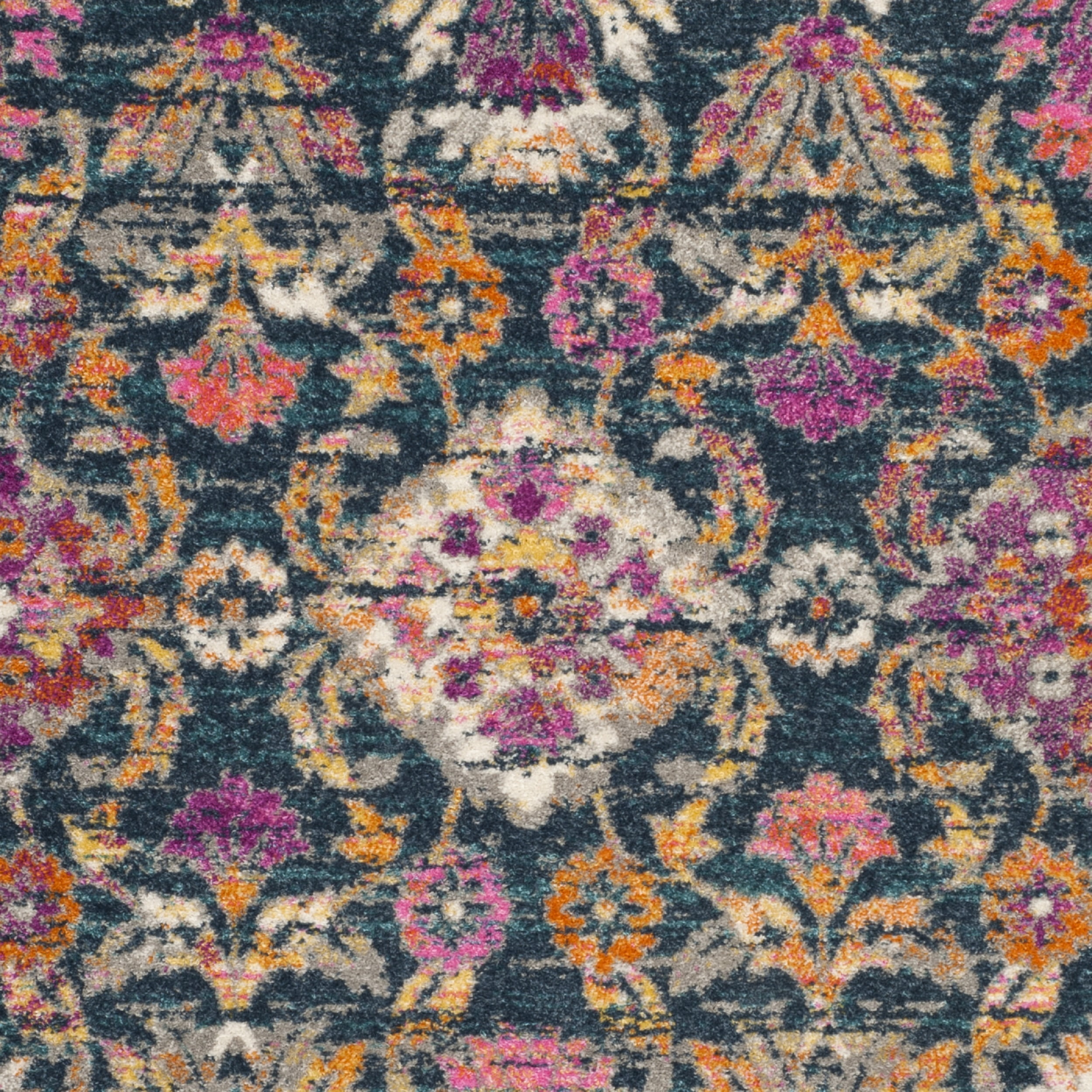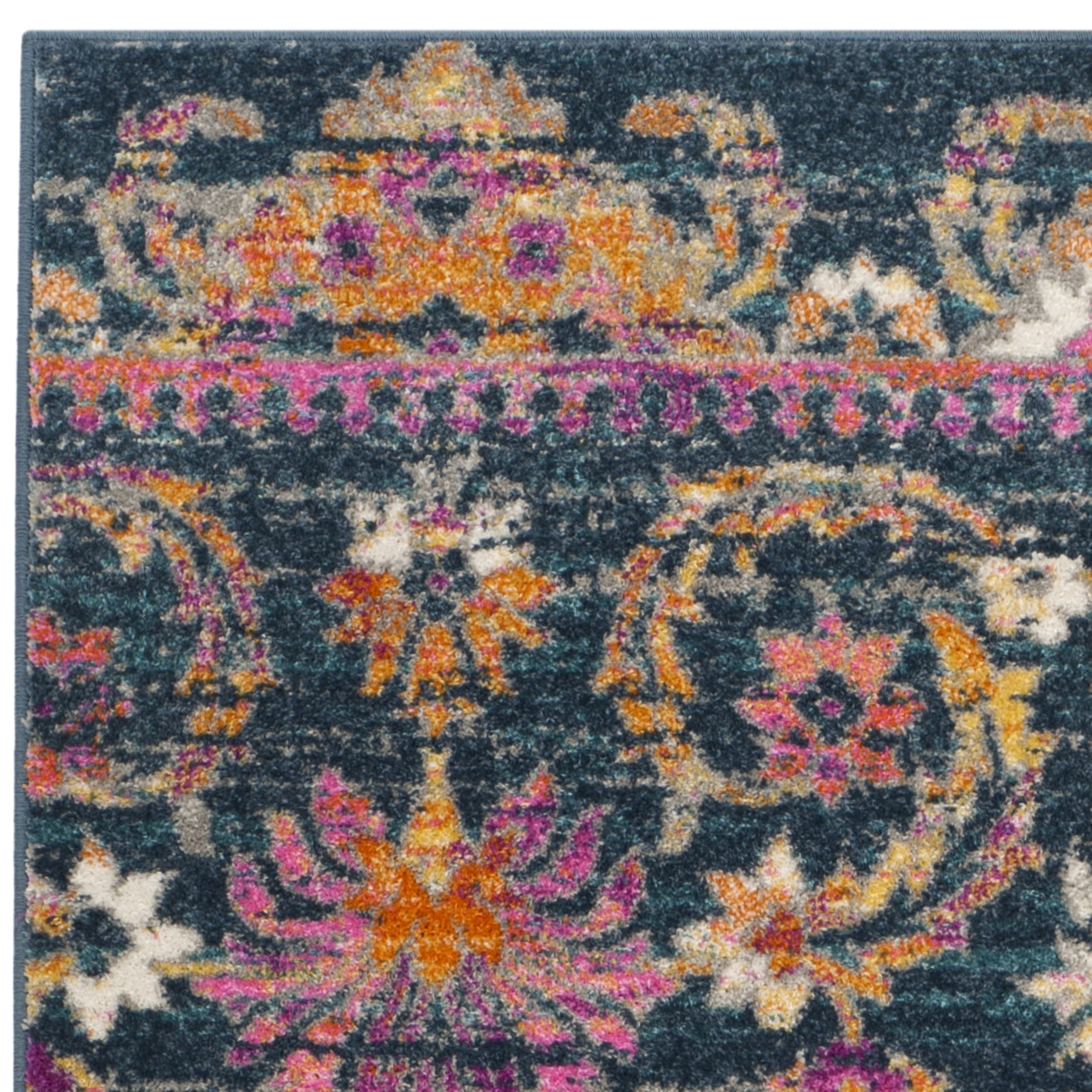 Color: Blue/Fuchsia Size: 5’1″ x 7’6″ Power Loomed in Turkey Pile Height: 0.35 in. Polypropylene Backing contains jute and latex, rug pad (sold separately) recommended to help prevent shifting and sliding Indoor Use Accessories in lifestyle photos not included Vacuum regularly (preferably one without beater bars) and spot clean; for hard-to-remove stains, professional rug cleaning is recommended; rotating your rugs every 3-6 months will protect against uneven wear from foot traffic and furniture weight Use rug protectors under the legs of heavy furniture to avoid flattening piles Avoid direct sunlight as it will cause the colors in your area rug to fade over time; place your area rug away from direct sunlight whenever possible For an instant decorating makeover, this area rug is one of the easiest and most fashionable ways to refresh a room with character and style. Please note: The images and product dimensions on our website are as accurate as possible. Due to differences in computer monitors, some rug colors may vary slightly. Lengths and widths may vary from the published dimensions. We do our best to provide you Packing and shipping of your rug may cause temporary creases; these surface waves are not imperfections or damages and will gradually recede; back-rolling or reverse rolling is the fastest and easiest way to remove creases in your area rug; allow ample ti Available in multiple sizes For carpet-to-carpet use, we recommend placing a hold pad in-between for protection