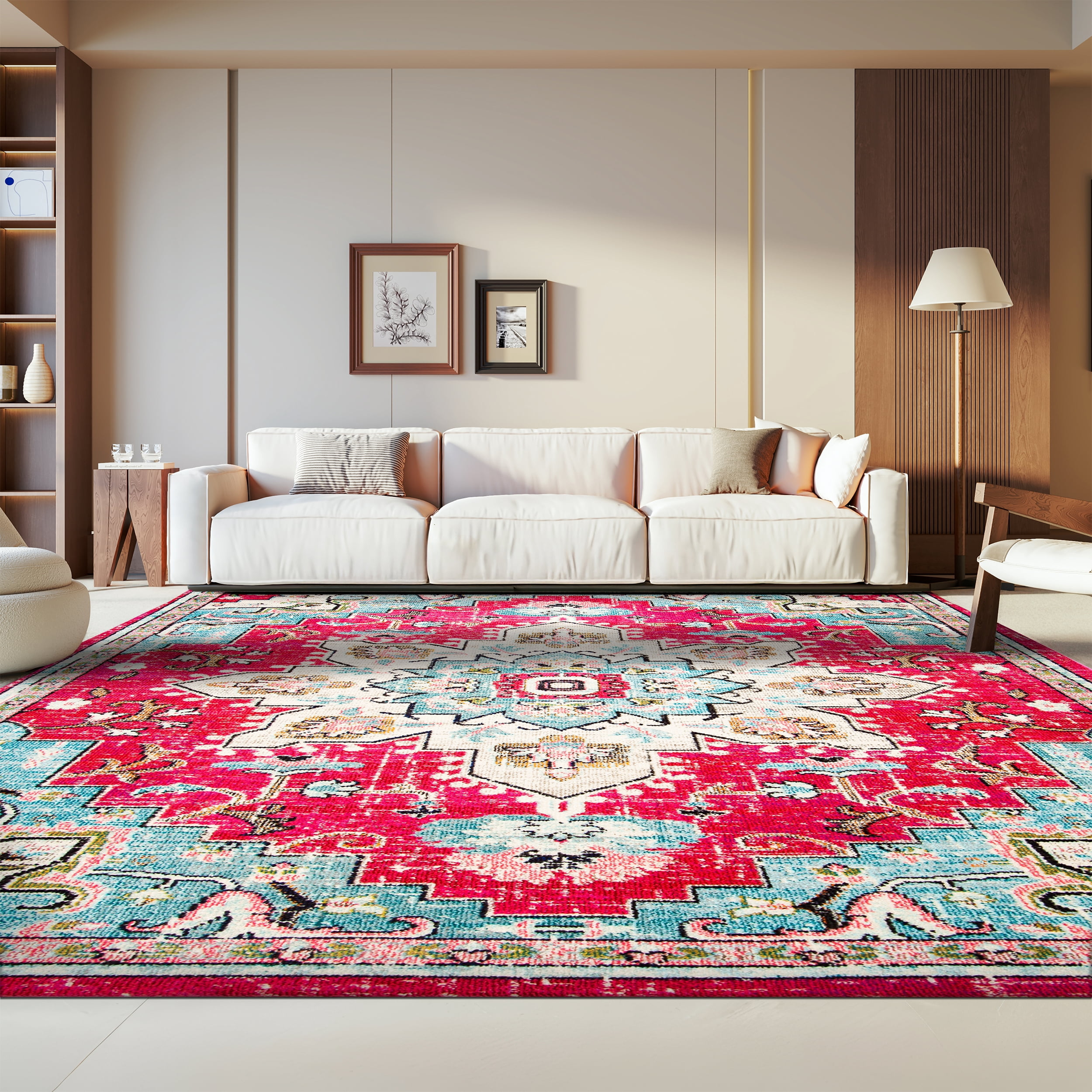 Color: Fuchsia/Blue Size: 8′ x 10′ Power Loomed in Turkey Pile Height: 0.35 in. Polypropylene Backing contains jute and latex, rug pad (sold separately) recommended to help prevent shifting and sliding Indoor Use Accessories in lifestyle photos not included Vacuum regularly (preferably one without beater bars) and spot clean; for hard-to-remove stains, professional rug cleaning is recommended; rotating your rugs every 3-6 months will protect against uneven wear from foot traffic and furniture weight Use rug protectors under the legs of heavy furniture to avoid flattening piles Avoid direct sunlight as it will cause the colors in your area rug to fade over time; place your area rug away from direct sunlight whenever possible For an instant decorating makeover, this area rug is one of the easiest and most fashionable ways to refresh a room with character and style. Please note: The images and product dimensions on our website are as accurate as possible. Due to differences in computer monitors, some rug colors may vary slightly. Lengths and widths may vary from the published dimensions. We do our best to provide you Packing and shipping of your rug may cause temporary creases; these surface waves are not imperfections or damages and will gradually recede; back-rolling or reverse rolling is the fastest and easiest way to remove creases in your area rug; allow ample ti Available in multiple sizes For carpet-to-carpet use, we recommend placing a hold pad in-between for protection