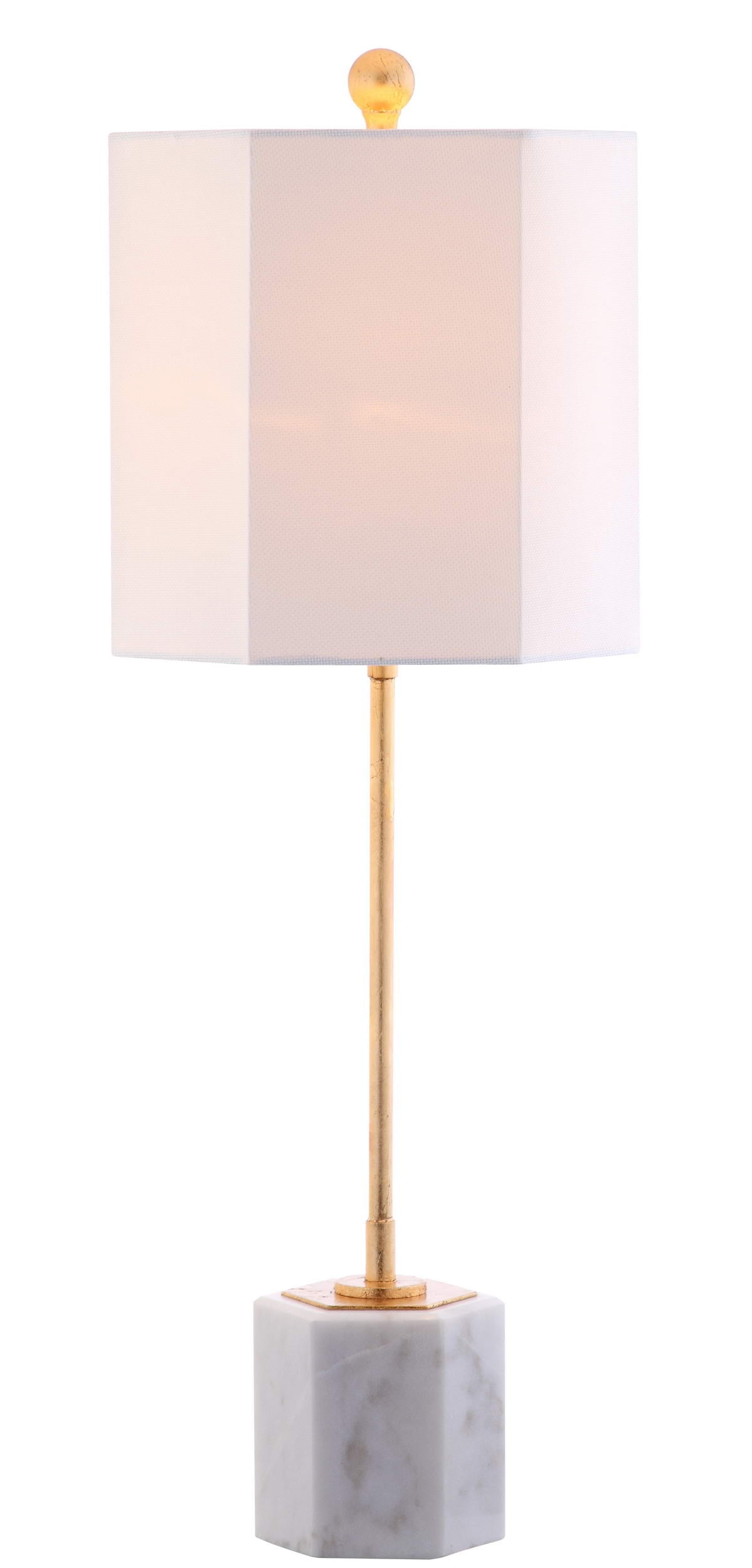 Contemporary design adds a chic look to your home Durable frame for long lasting longevity Easy to clean and maintain Minor assembly needed Color: White/Gold Leaf Shade Color: Off-White Item Dimensions: 10 in. W x 10 in. D x 29 in. H Crafted with Marble/Iron Shade Material: 100% Cotton Shade Height: 10 in. H Shade Bottom Dimensions: 10 in. L x 10 in. W Shade Top Dimensions: 10 in. W x 10 in. L Traditional Harp Style Harp Color: Gold Harp Height: 8 in. H Cord Color: Light Grey Cord Length: 60 in. Bottom Base Dimension: 4.75 in. W x 4.75 in. D x 4.75 in. H Pendant Dimension: 60 in. Lamp Certification: ETL Light Bulb Base Type: E26 Switch Mechanism: On/Off Switch Online Type of Bulb Included: LED A19 Max Wattage: Type “A” 60W or CFL 13W or LED 9W Lumen: 800 Quantity of Bulbs: 2 Accessories in life style photo(s) not included Please note: The images and product dimensions on our website are as accurate as possible. Due to differences in computer monitors, some item’s color may vary slightly. Before cleaning any lamp shade or fixture, disconnect the power source. Wipe with a soft, dry cloth. Avoid the use of chemicals and household cleaners as they may damage the finish.