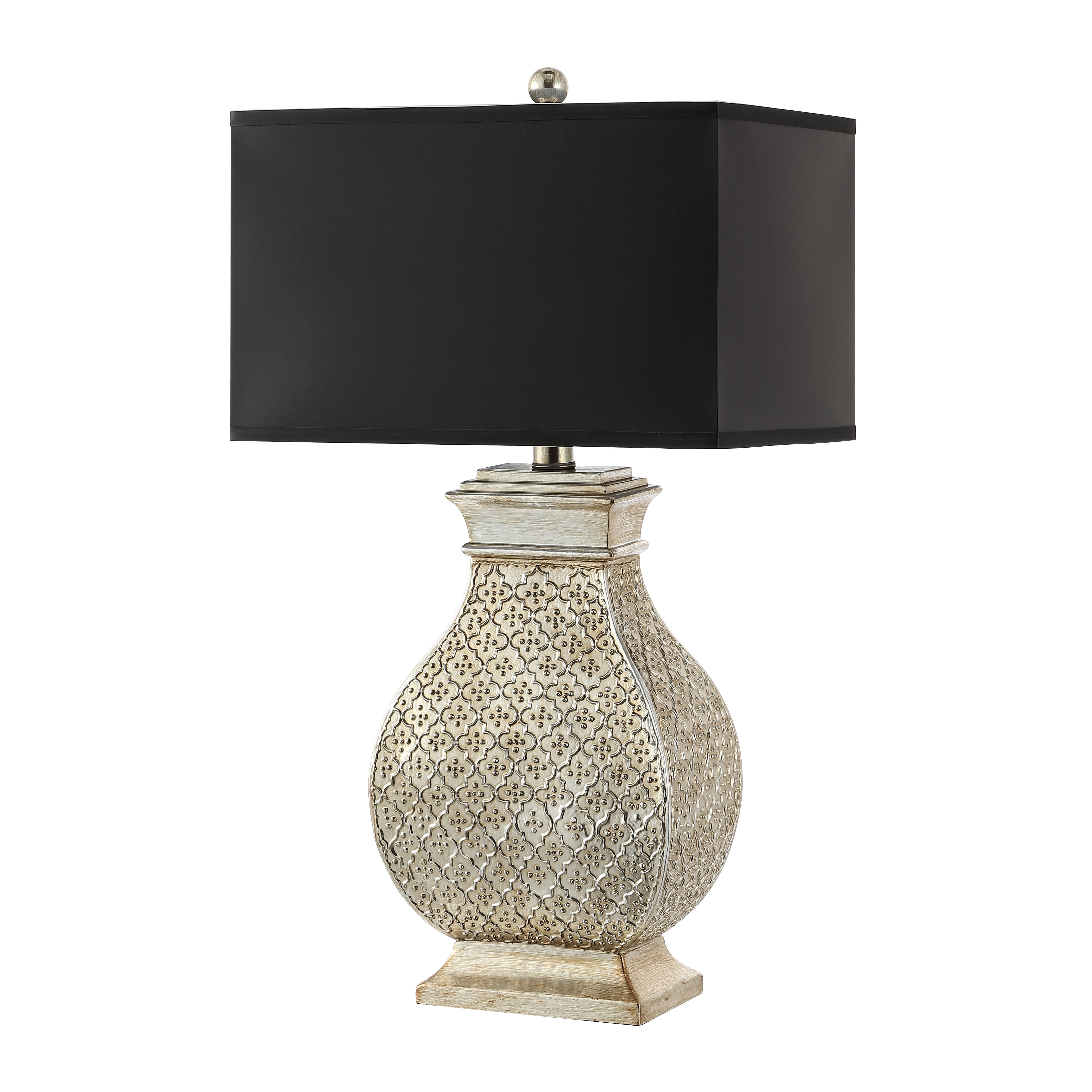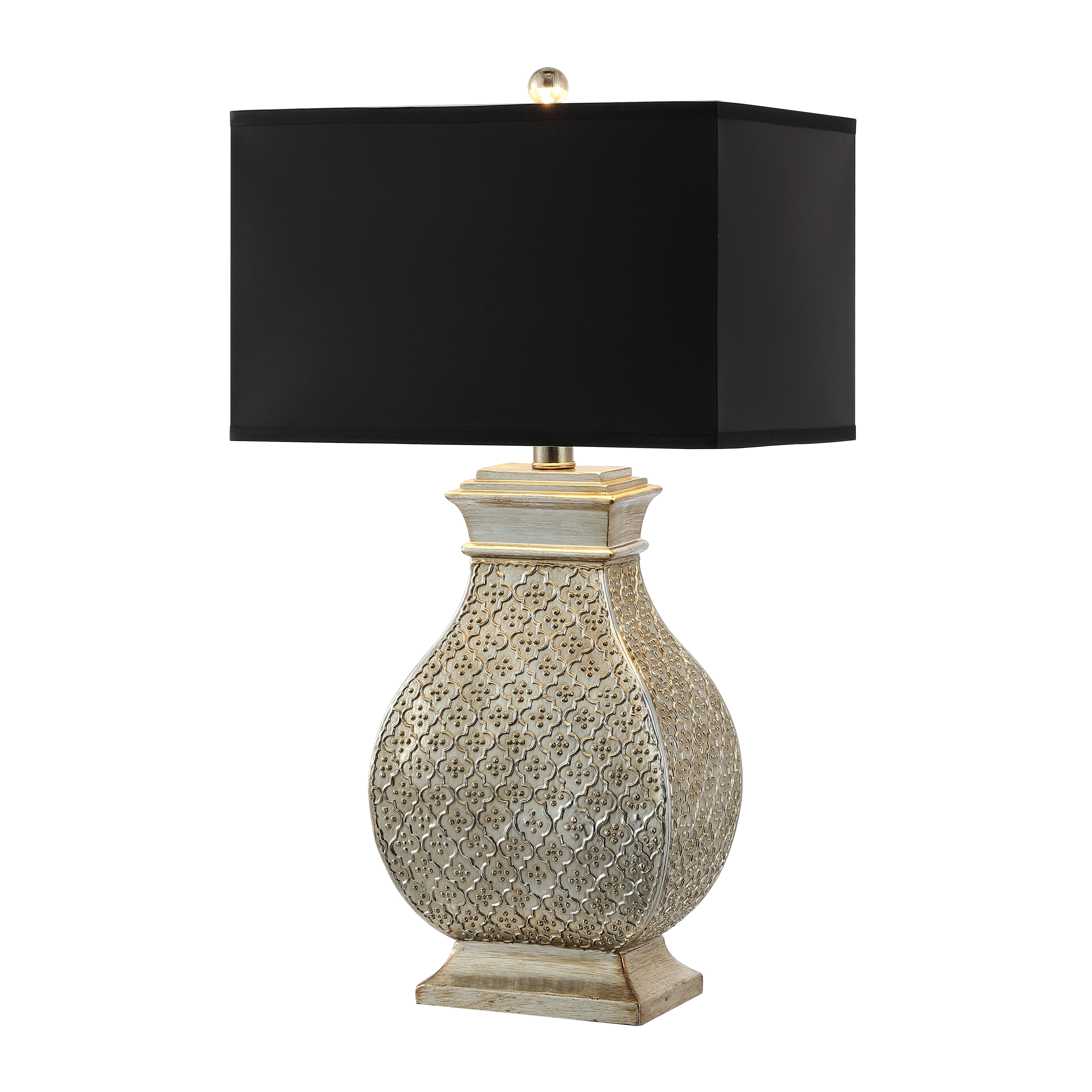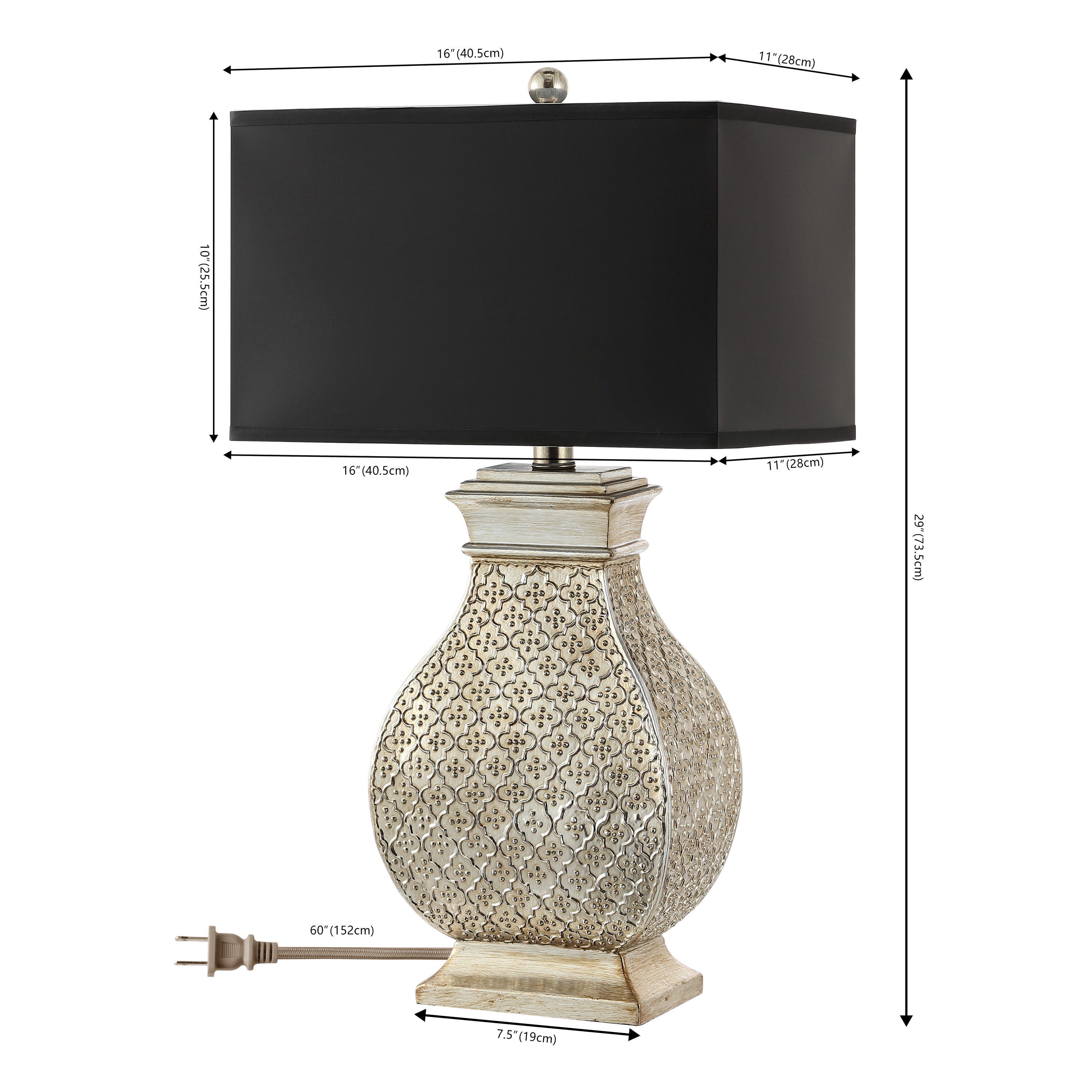 Contemporary design adds a chic look to your home Durable resin frame for long lasting longevity Easy to clean and maintain Minor assembly needed Color: Silver Champagn Metal Finish: Silver Champagn Crafted with: Resin Final Color: Champagne Item Weight: 11.4 lbs Item Dimensions: 16 in. W x 11 in. D x 29 in. H Lamp Body Dimensions: 10 in. W x 6.5 in. D x 16.5 in. H Shade Color: Black Shade Material: 100% Polyester Shade Height: 10 in. Shade Bottom Dimension: 11 in. W x 16 in. L Shade Top Dimension: 11 in. W x 16 in. L Shade Shape: Square Harp Color: Silver Harp Height: 7.5 in. Cord Color: Light Grey Cord Length: 60 in. Lamp Certification: UL Light Bulb Base Type: E26 Screw Terminal Switch Mechanism: Rotary Switch Type of Bulb Included: E26 LED A19 9W Max Wattage: 13W Watt: 13W Lumen: 830 Quantity of Bulb(s): 2 Bulb Size: 46 mm. W x 46 mm. Dx 105 mm. H Bulb Box Size: 48 mm. W x 48 mm. D x 120 mm. H Country of Origin: China