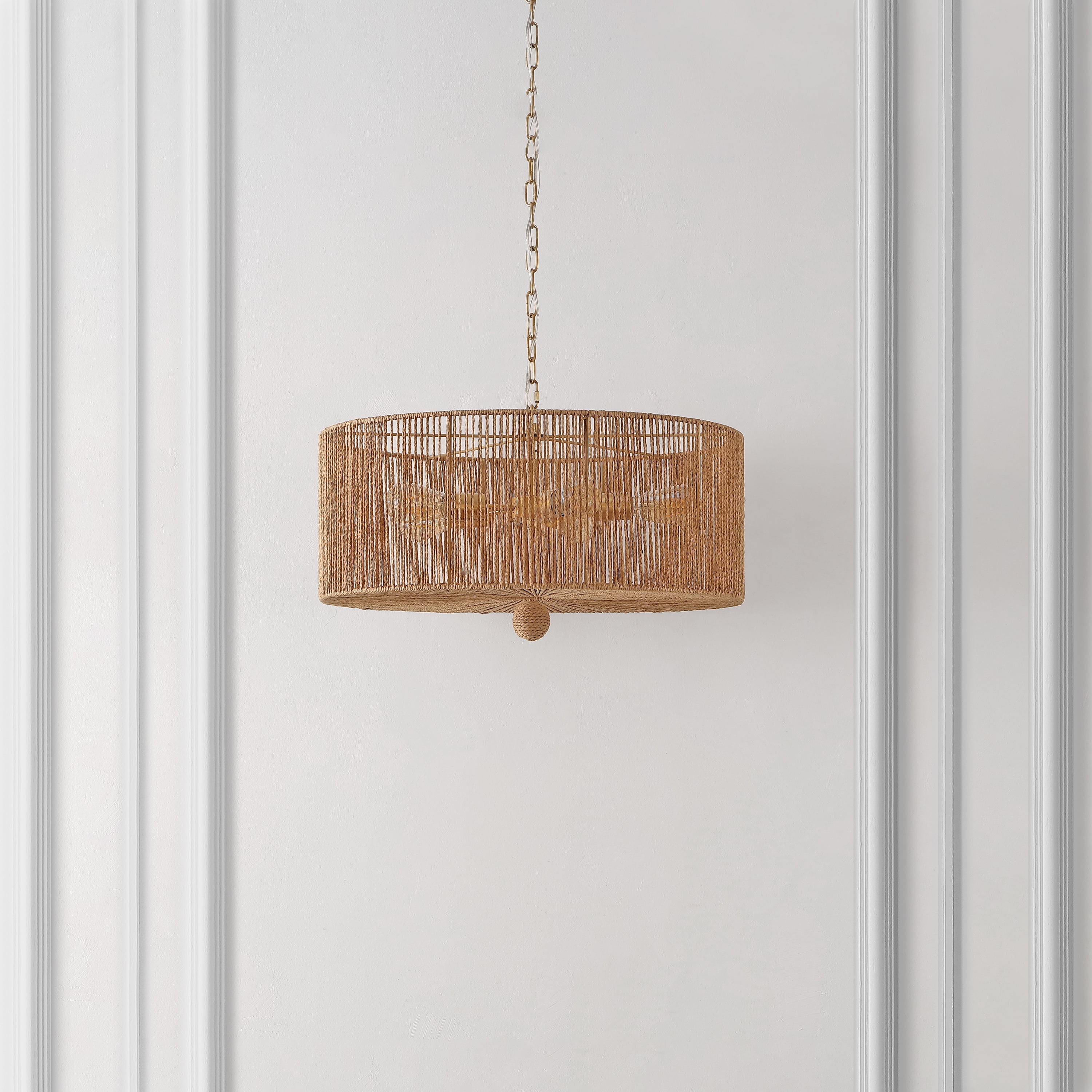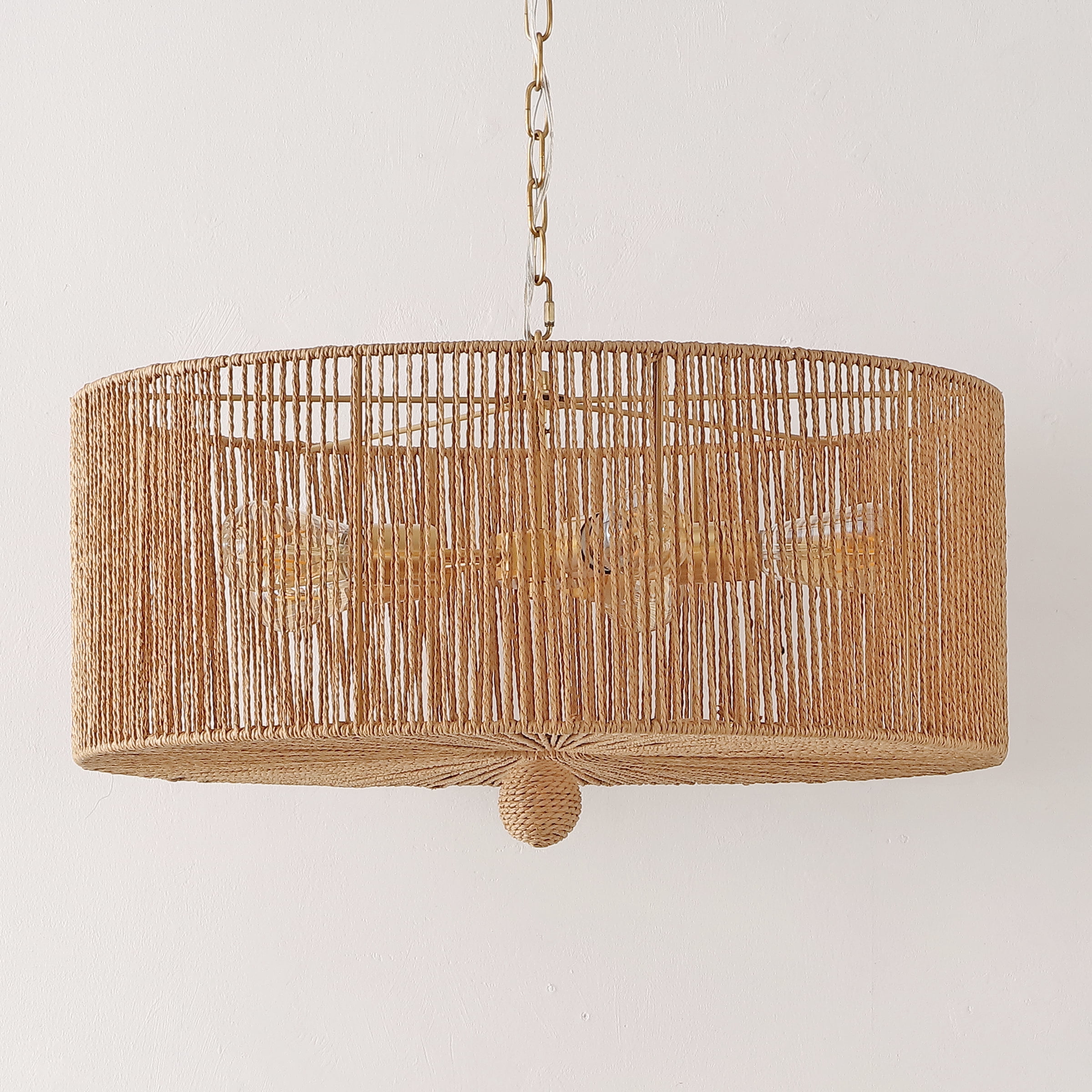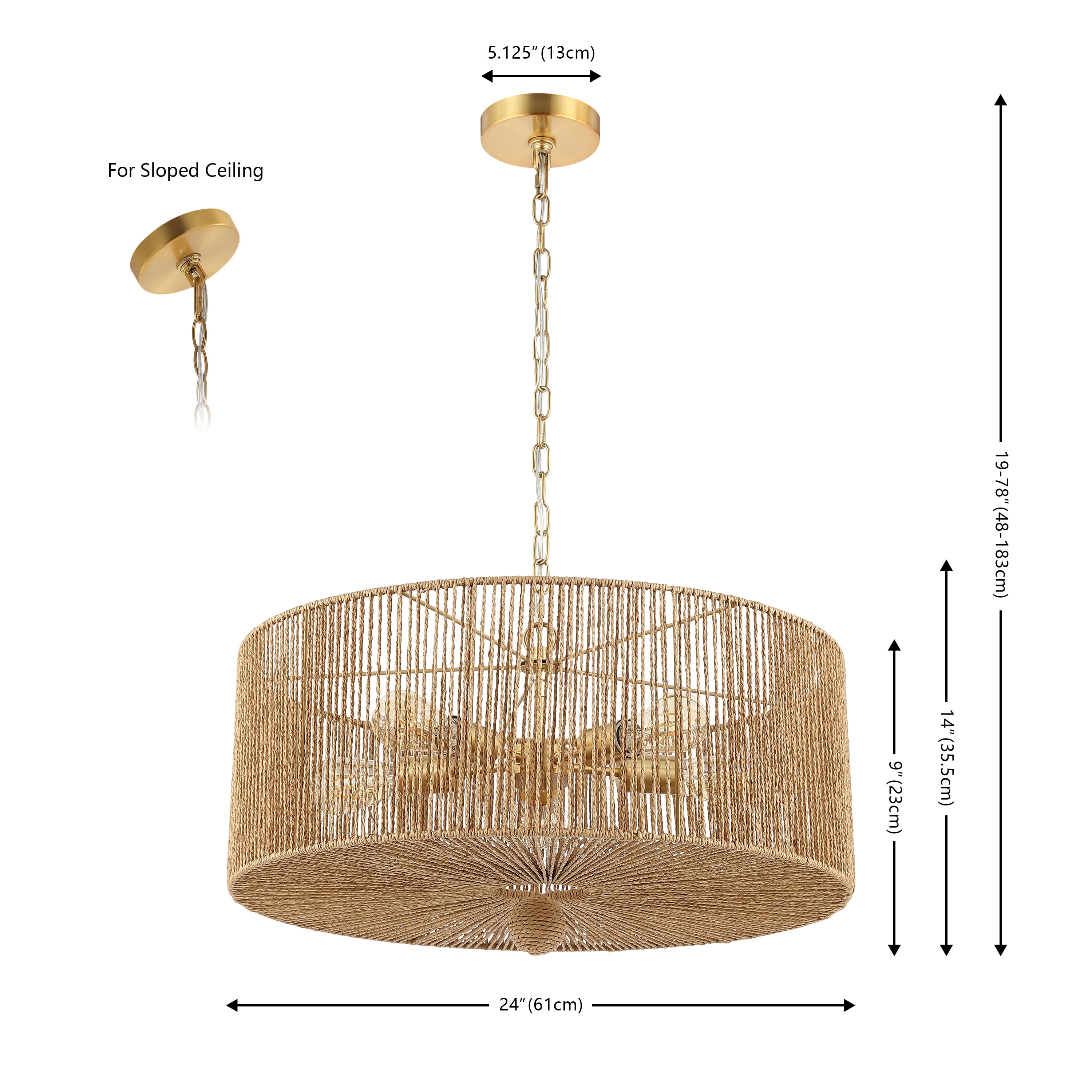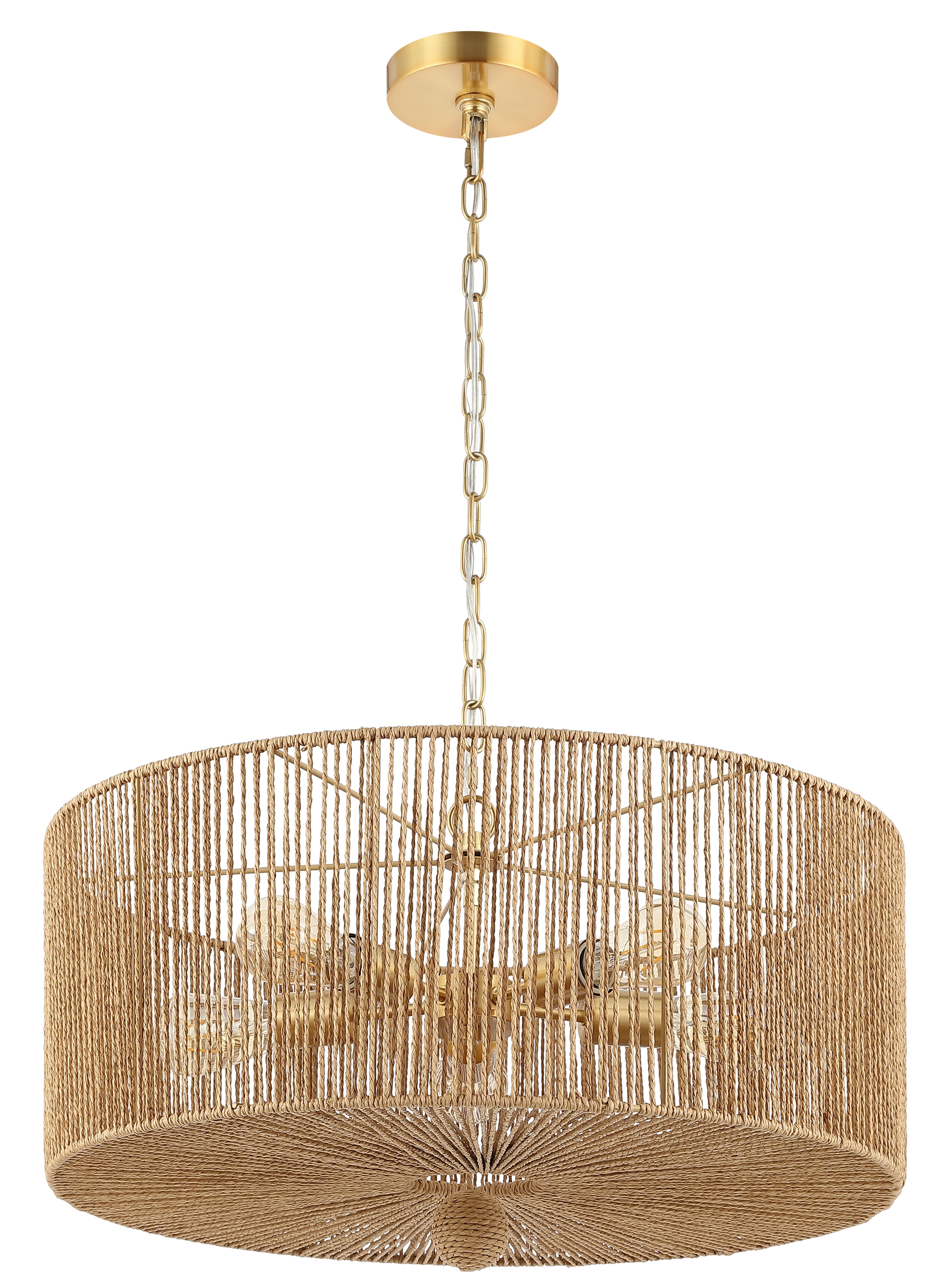 Contemporary design adds a chic look to your home Durable paper frame for long lasting longevity Easy to clean and maintain Minor assembly needed Color: Natural/Gold Metal Finish: Brass Gold Crafted with: Paper Item Weight: 5.3 lbs Item Dimensions: 24 in. W x 24 in. D x 19-78 in. H Lamp Body Dimensions: 24 in. W x 24 in. D x 14 in. H Maximum Hanging Length: 78 in. Minimum Hanging Length: 19 in. Shade Color: Natural Shade Material: Paper Shade Height: 9 in. Shade Shape: Cylinder Cord Color: Clear Cord Length: 72 in. Cord Material: Plastic Lamp Certification: UL Light Bulb Base Type: E26 Bulb Shape: ST19 Bulb Color: Amber Max Wattage: 40W Watt: 4W Lumen: 420 Quantity of Bulb(s): 5 Bulb Size: 2.25 in. W x 2.25 in. D x 5.125 in. H Bulb Box Size: 2.5 in. W x 2.5 in. D x 5.5 in. H Country of Origin: China