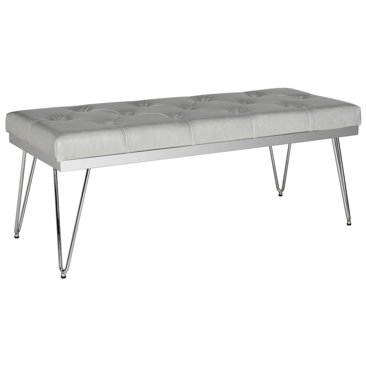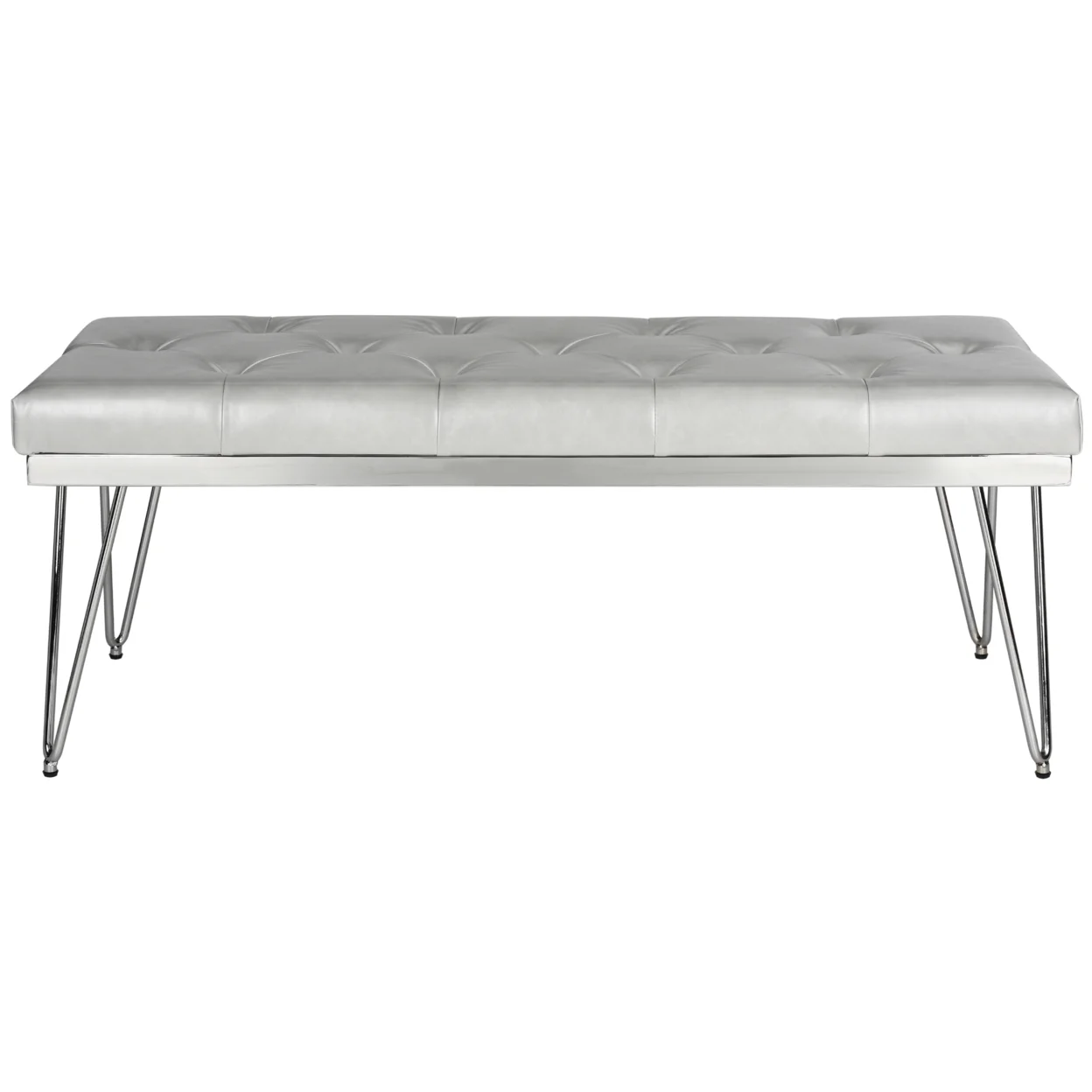 Shop SAFAVIEH at . Save Money. Live Better. SAFAVIEH Marcella Contemporary Mid-Century Tufted Bench, Grey/Chrome Sleek and sculptural, this chic new design takes the viewing bench to a new level of sophistication. With grey PU leather upholstery and chrome hairpin legs, it offers extra seating in the living room or bedroom, and a bit of architectural interest. For over 100 years, SAFAVIEH has set the standard for finely crafted rugs and home furnishings. Begin your rug, furniture, lighting, outdoor, and home decor search and discover over 100,000 SAFAVIEH products today.