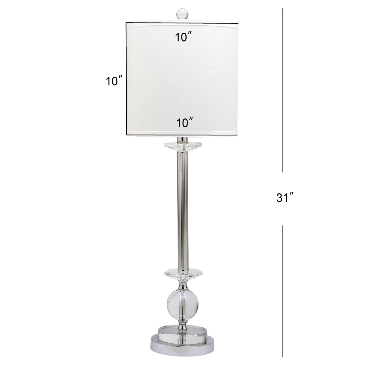 Contemporary design adds a chic look to your home Durable frame for long lasting longevity Easy to clean and maintain Minor assembly needed Color: Clear Shade Color: White Item Dimensions: 10 in. W x 10 in. D x 31 in. H Crafted with Crystal/Iron Shade Material: 50% Cotton; 50% Polyester Shade Height: 10 in. H Shade Bottom Dimensions: 10 in. L x 10 in. W Shade Top Dimensions: 10 in. W x 10 in. L Traditional Harp Style Harp Color: Silver Harp Height: 8 in. H Cord Color: Light Grey Cord Length: 60 in. Lamp Body Dimensions: 4.5 in. W x 4.5 in. D x 17 in. H Bottom Base Dimension: 6 in. W x 6 in. D x 1 in. H Pendant Dimension: 60 in. Lamp Certification: UL Light Bulb Base Type: E26 Switch Mechanism: Rotary Switch Type of Bulb Included: CFL Max Wattage: 13W Lumen: 830 Quantity of Bulbs: 2 Accessories in life style photo(s) not included Please note: The images and product dimensions on our website are as accurate as possible. Due to differences in computer monitors, some item’s color may vary slightly. Before cleaning any lamp shade or fixture, disconnect the power source. Wipe with a soft, dry cloth. Avoid the use of chemicals and household cleaners as they may damage the finish.