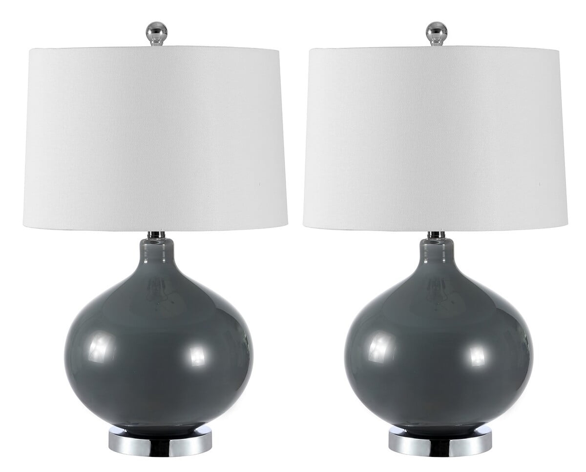 Contemporary design adds a chic look to your home Durable glass frame for long lasting longevity Easy to clean and maintain Minor assembly needed Color: Grey Shade Color: White Item Dimension: 15 in. W x 15 in. D x 25 in. H Crafted with: Glass Shade Material: 100% Cotton Shade Height: 10 in. Shade Bottom Dimension: 15 in. W x 15 in. L Shade Top Dimension: 14 in. W x 14 in. L Traditional Harp Style Harp Color: Silver Harp Height: 7.5 in. Cord Color: Light Grey Cord Length: 60 in. Lamp Body Dimension: 10.5 in. W x 10.5 in. D x 11 in. H Bottom Base Dimension: 6 in. W x 6 in. D x 1 in. H Item Weight: 9.46 lbs Lamp Certification: UL Light Bulb Base Type: E26 Screw Terminal Switch Mechanism: On/Off Rotary Switch Type of Bulb Included: LED A19 9W Max Wattage: 100W Lumen: 805 Quantity of Bulb(s): 1 Finial Color: Chrome Sold in a Set of 2 Accessories in life style photo(s) not included Please note: The images and product dimensions on our website are as accurate as possible. Due to differences in computer monitors, some item’s color may vary slightly. Before cleaning any lamp shade or fixture, disconnect the power source. Wipe with a soft, dry cloth. Avoid the use of chemicals and household cleaners as they may damage the finish.