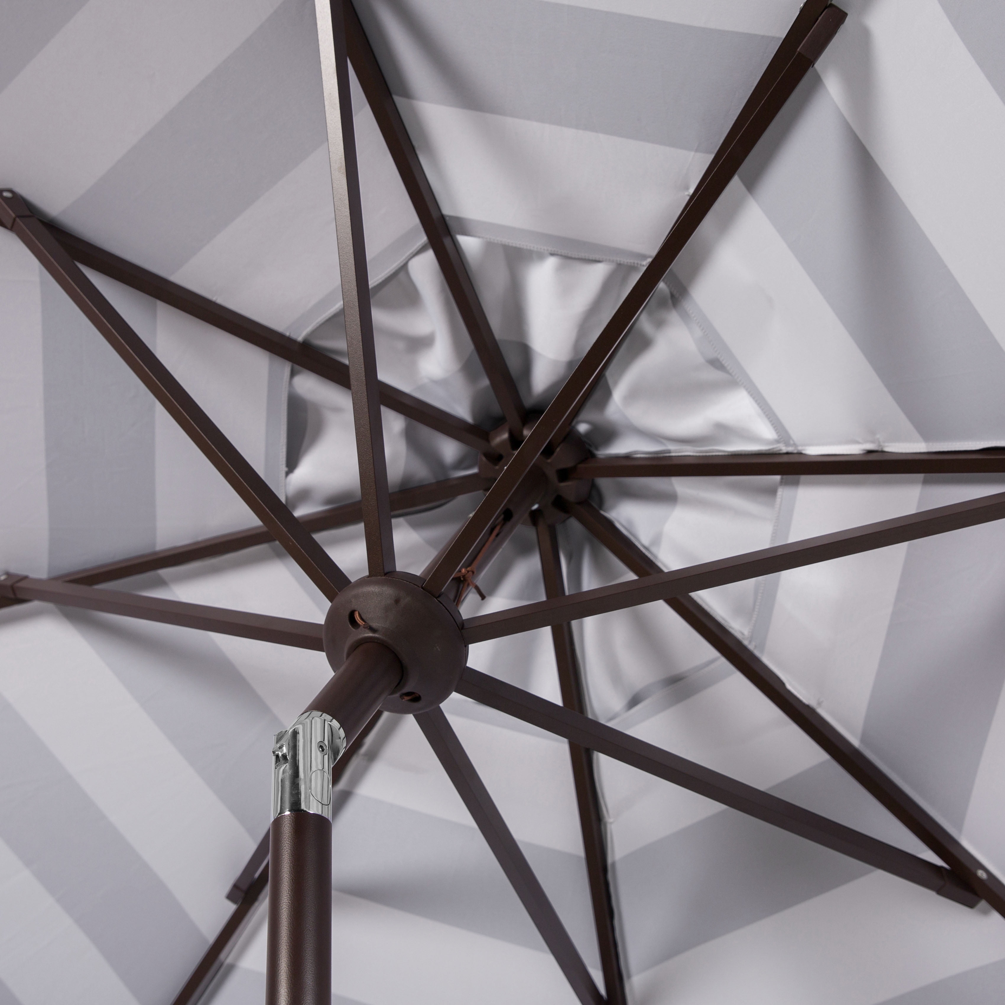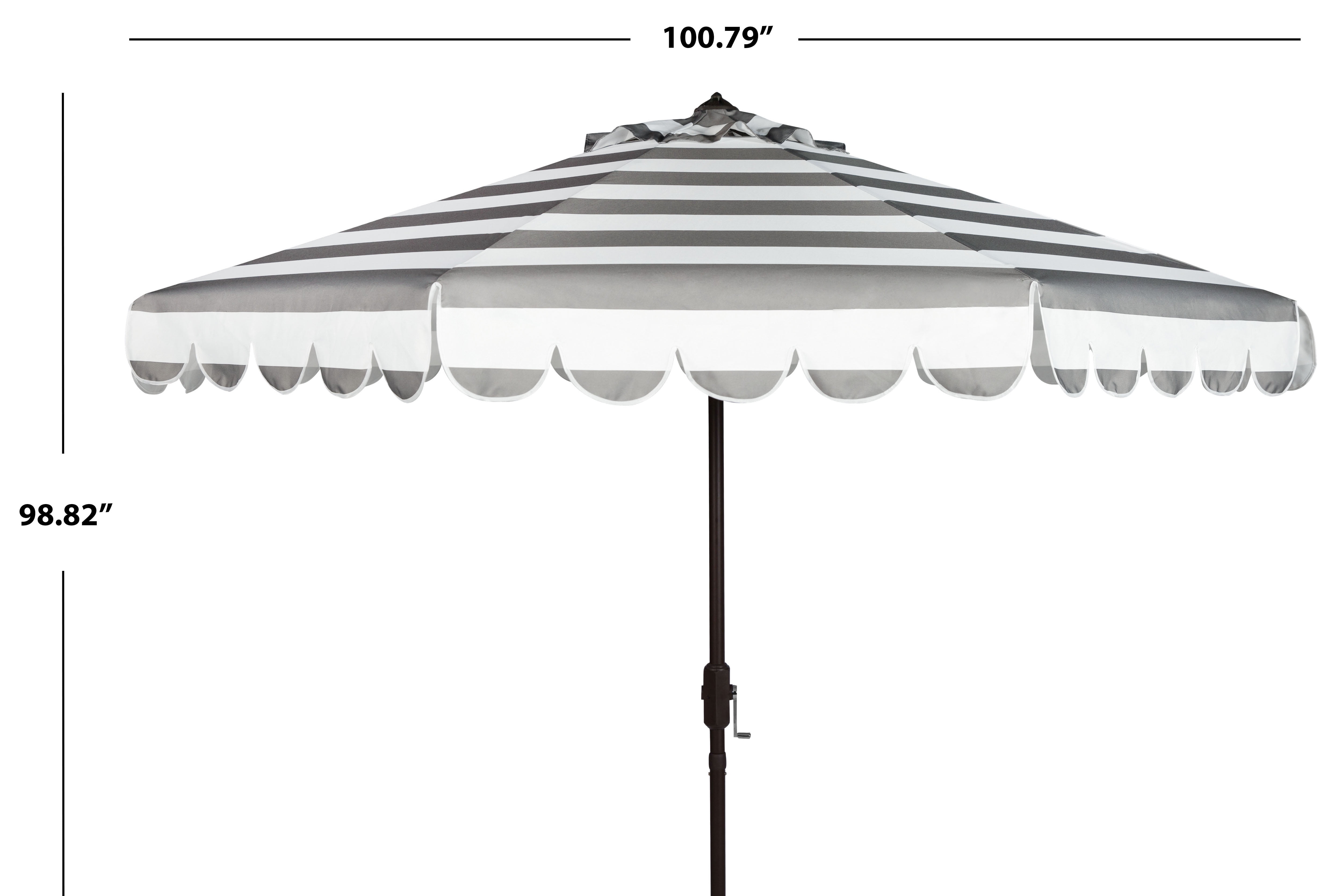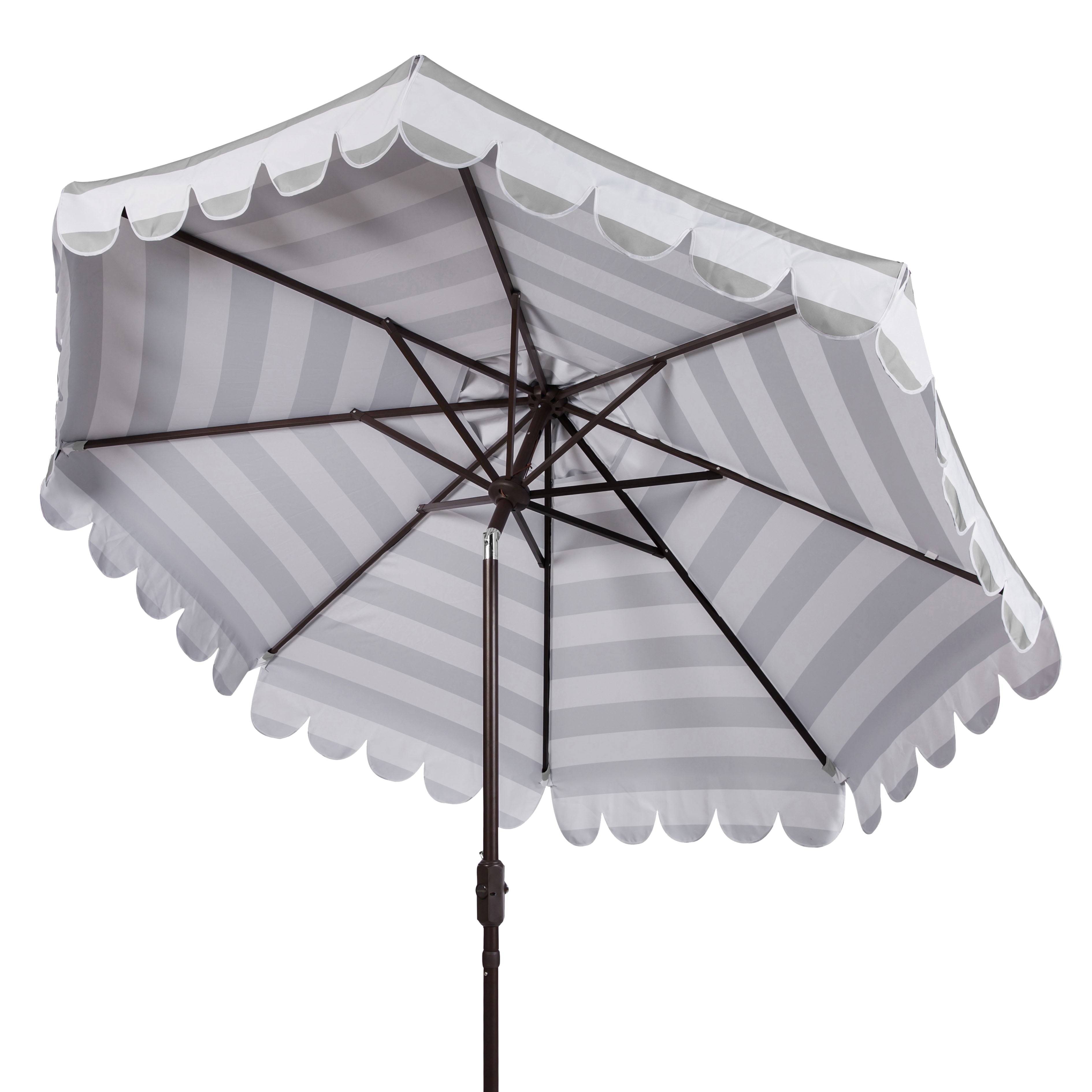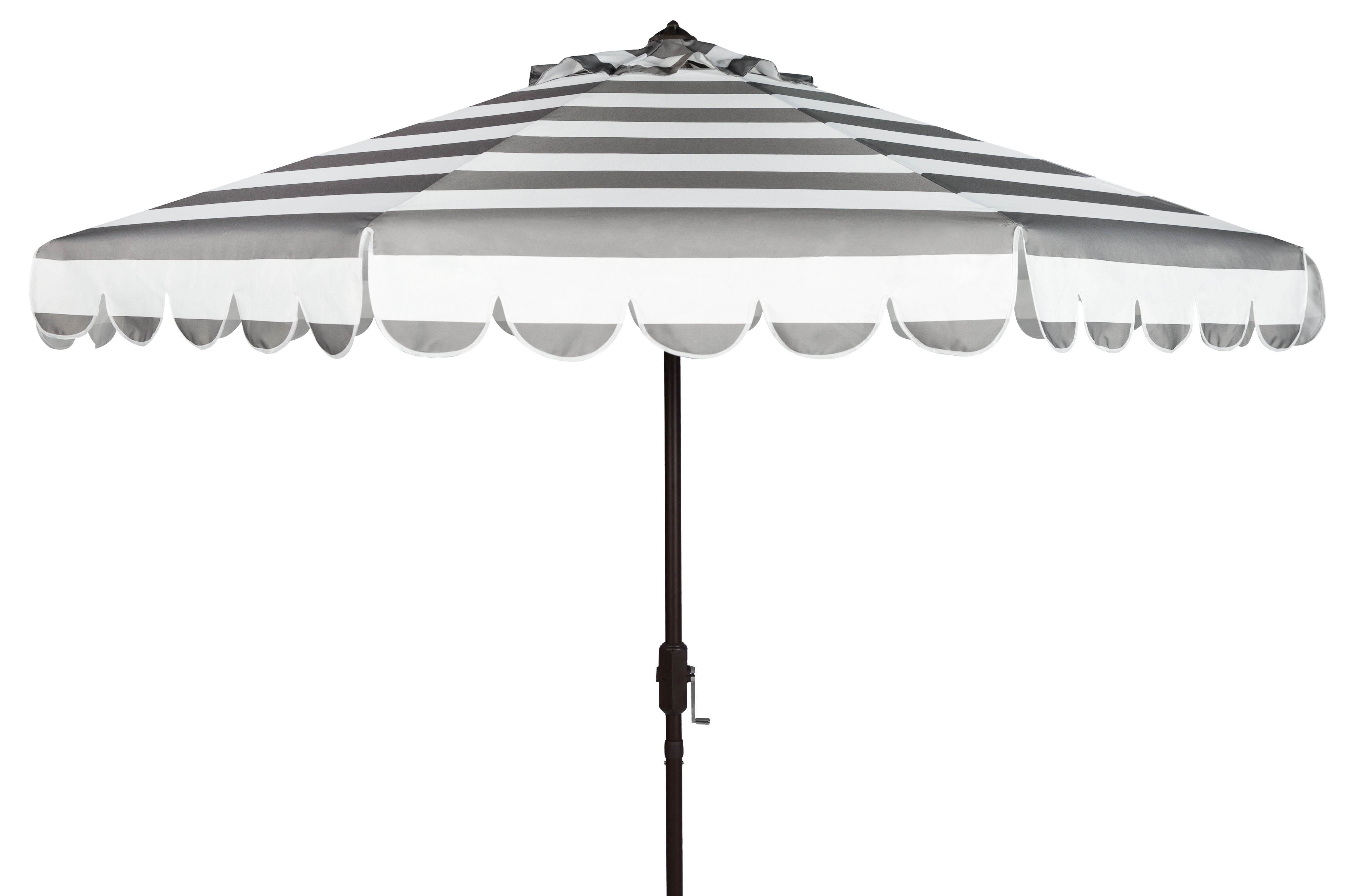 Shop Safavieh at . Save Money. Live Better. Safavieh Maui 9′ Market Crank Striped Tilt Patio Umbrella, Grey/White Whether you’re swaying to a beachside samba in Brazil or sipping a mojito by the pool, this nine-foot crank umbrella is an instant haven. Designed with a touch of glamour, its grey and white stripe pattern is continued through its single scallop detail.