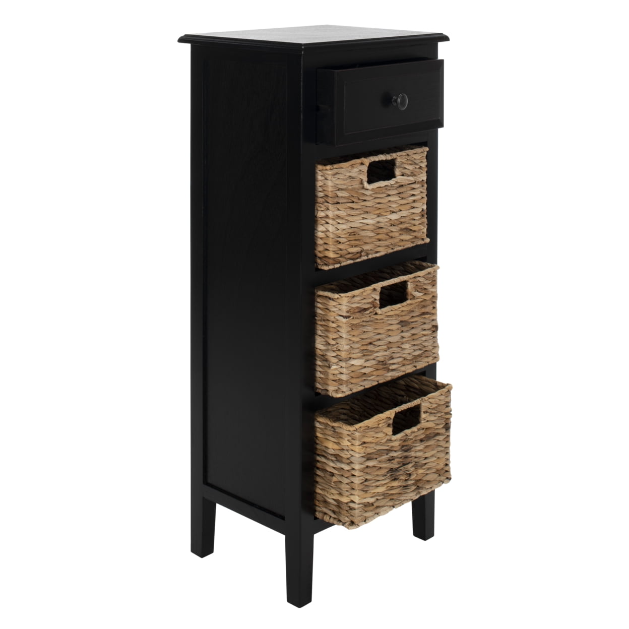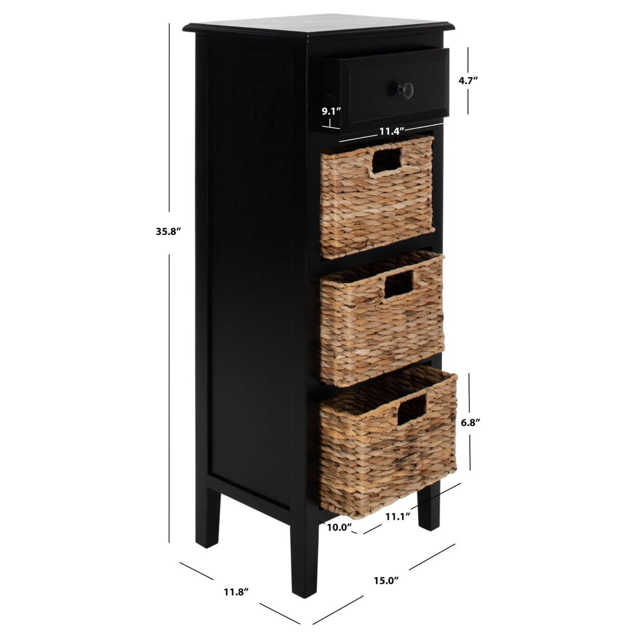 Contemporary design adds a chic look to your home Durable pine wood frame for long lasting longevity No Assembly Required Color: Distressed Black Assembled Dimensions: 35.8 in. H x 15 in. W x 11.8 in. D Features 1 Drawer & 3 removable drawers Item Weight: 23.1 lbs. Weight Capacity: 150 lbs Wood is a natural material with variations of color shade, configuration, streaks, and grain structure. Each individual piece of Safavieh furniture has characteristic markings that will differ from photo and showroom samples. Regular attention and maintenance of fine furniture can ensure its beauty for years to come. Always use felt pads under all articles to prevent discoloration or softening of the lacquer. Plastic and rubber bases on items can discolor wood. Accessories in life style photo(s) not included Please note: The images and product dimensions on our website are as accurate as possible. Due to differences in computer monitors, some furniture colors may vary slightly. Lengths and widths may vary from the published dimensions. We do our best to provide you with an exact measurement, but please be advised that some variation exists. Dust regularly with a soft, dry cloth. Never use oiled or treated cloths on lacquered finishes. Some finishes can be wiped with a damp (not wet) cloth, followed at once by rubbing with a dry cloth to remove fingerprints and smudges. For persistent spots, gently clean with a soft cloth and a solution of water and mild soap, make sure to wipe dry. Use adhesive felt pads, coasters and placemats to protect your furniture.