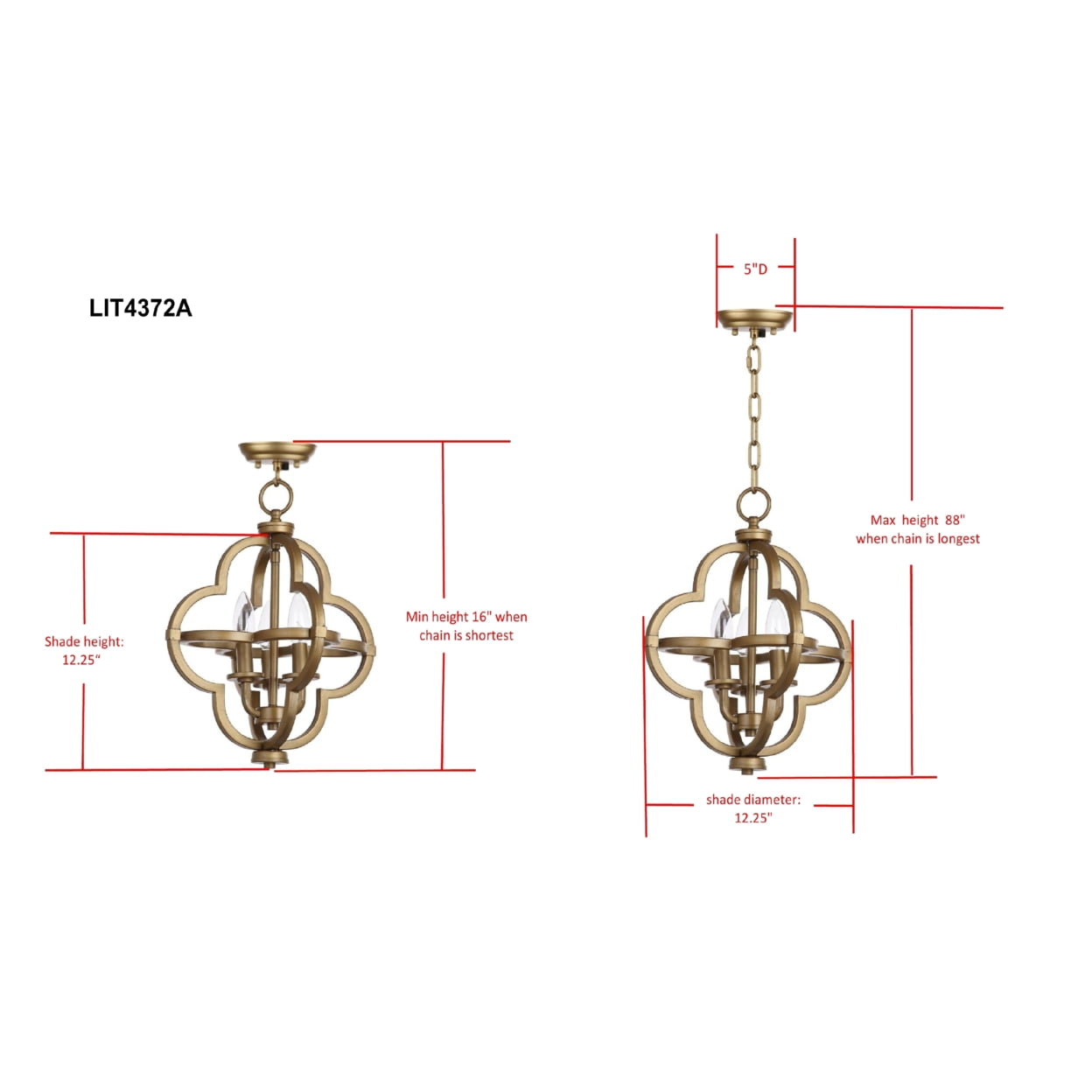 Contemporary design adds a chic look to your home Durable frame for long lasting longevity Easy to clean and maintain Minor assembly needed Color: Gold Shade Color: None Item Dimension: 12.25 in. W x 12.25 in. D x 16 -88 in. H Cord Length: 144 in. Max Hanging: 88 in. Min Hanging: 16 in. Canopy Dimension: 5 X 5 X 1 in. Chain: 72 in. Lighting Switch Type: On/Off Light Bulb Base Type: E12 Screw Terminal Type of Bulb Included:C26 Max Watt: 40W Watt: 25W Lumen: 200 Bulb Size: 26 x 26 x 73 mm Qty of Bulbs: 3 Cord Color: Clear Lamp Certification: UL Accessories in life style photo(s) not included Please note: The images and product dimensions on our website are as accurate as possible. Due to differences in computer monitors, some item’s color may vary slightly. Before cleaning any lamp shade or fixture, disconnect the power source. Wipe with a soft, dry cloth. Avoid the use of chemicals and household cleaners as they may damage the finish.