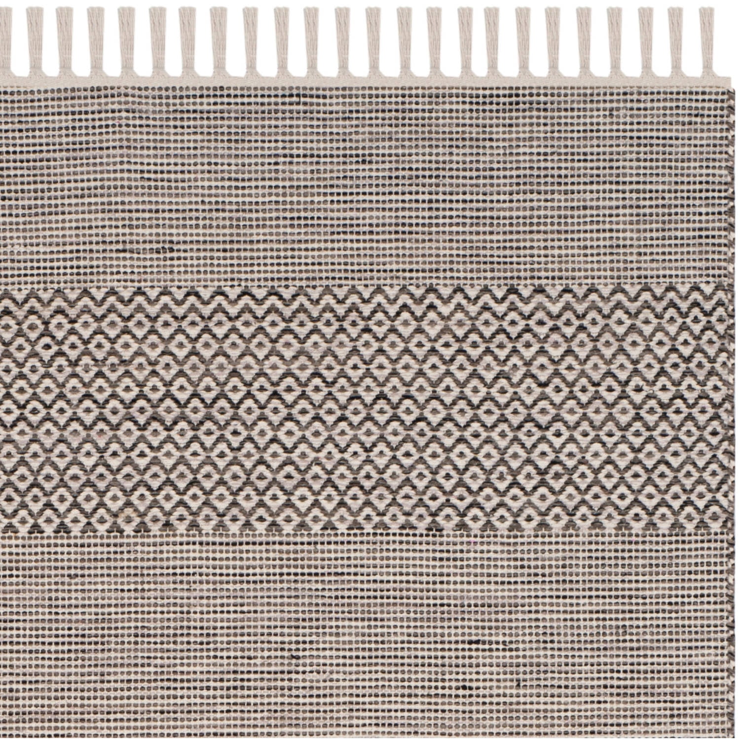 Color: Ivory/Anthracite Size: 5′ x 8′ Hand Woven in India Pile Height: 0.25 in. No backing, rug pad (sold separately) recommended to help prevent shifting and sliding 100% Cotton Stylish addition for any room Accessories in lifestyle photos not included Vacuum regularly (preferably one without beater bars) and spot clean; for hard-to-remove stains, professional rug cleaning is recommended; rotating your rugs every 3-6 months will protect against uneven wear from foot traffic and furniture weight Use rug protectors under the legs of heavy furniture to avoid flattening piles Avoid direct sunlight as it will cause the colors in your area rug to fade over time; place your area rug away from direct sunlight whenever possible For an instant decorating makeover, this area rug is one of the easiest and most fashionable ways to refresh a room with character and style. Please note: The images and product dimensions on our website are as accurate as possible. Due to differences in computer monitors, some rug colors may vary slightly. Lengths and widths may vary from the published dimensions. We do our best to provide you with an exact measurement, but please be advised that some variation exists. Patterns may vary slightly according to shape and size selected. Packing and shipping of your rug may cause temporary creases; these surface waves are not imperfections or damages and will gradually recede; back-rolling or reverse rolling is the fastest and easiest way to remove creases in your area rug; allow ample time for your rug to settle, these creases and waves will normally flatten out Available in multiple sizes For carpet-to-carpet use, we recommend placing a hold pad in-between for protection
