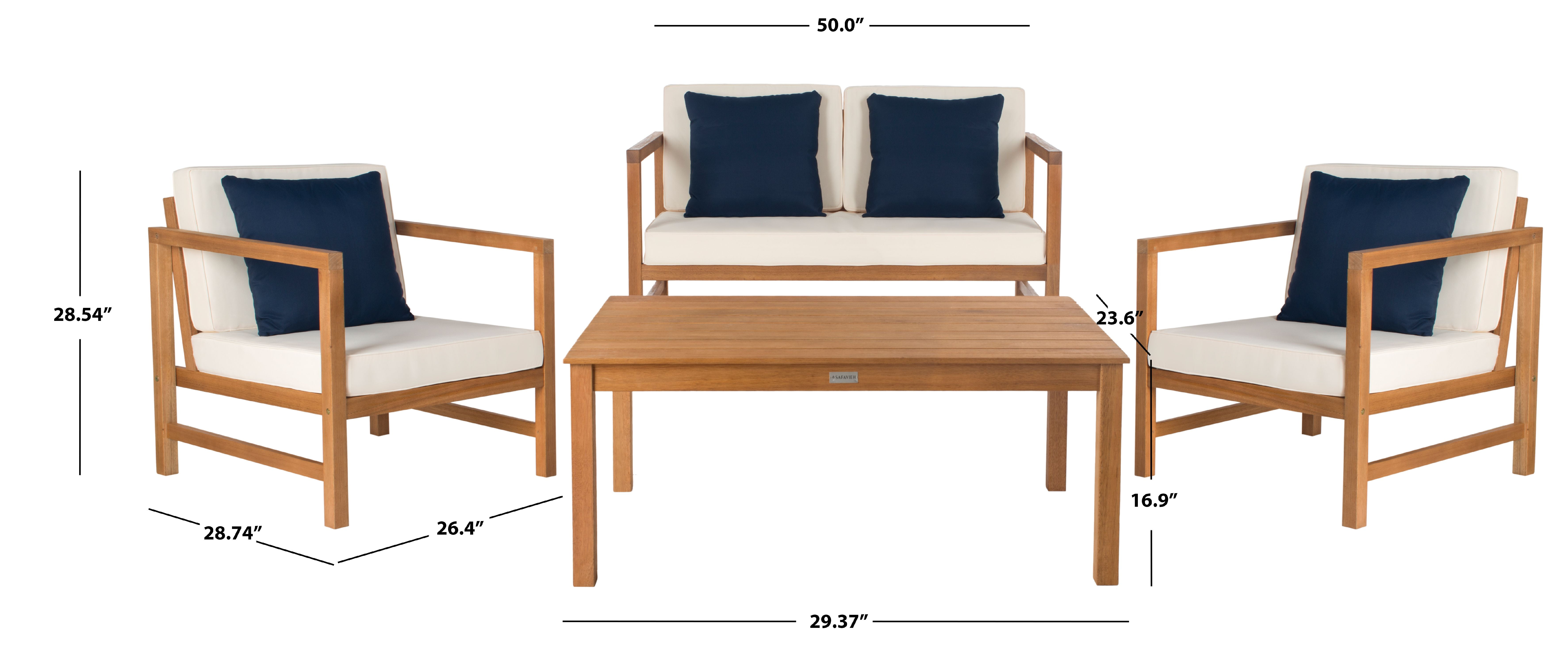 The perfect pairing of form and function, this contemporary 4-piece outdoor set was inspired by the home of LA’s top interior designer. Crafted in a teak hue, its sleek lines are illuminated with white upholstery that pops with complementary accent pillows. Features: Material: Eucalyptus wood Finish: Teak brown, beige Assembly needed: Yes Weather resistant Specifications: Product Dimensions: (Bench) 28.5″H x 50″W x 28.74″D; (Armchair) 28.5″H x 26.4″W x 28.74″D; (Table) 16.9″H x 29.4″W x 23.6″D Product Weight: (Table) 18.04 lbs; (Bench) 38.5 lbs; (1 Chair) 25.74 lbs Seat Height: 13.4″ Seat Depth: 25″