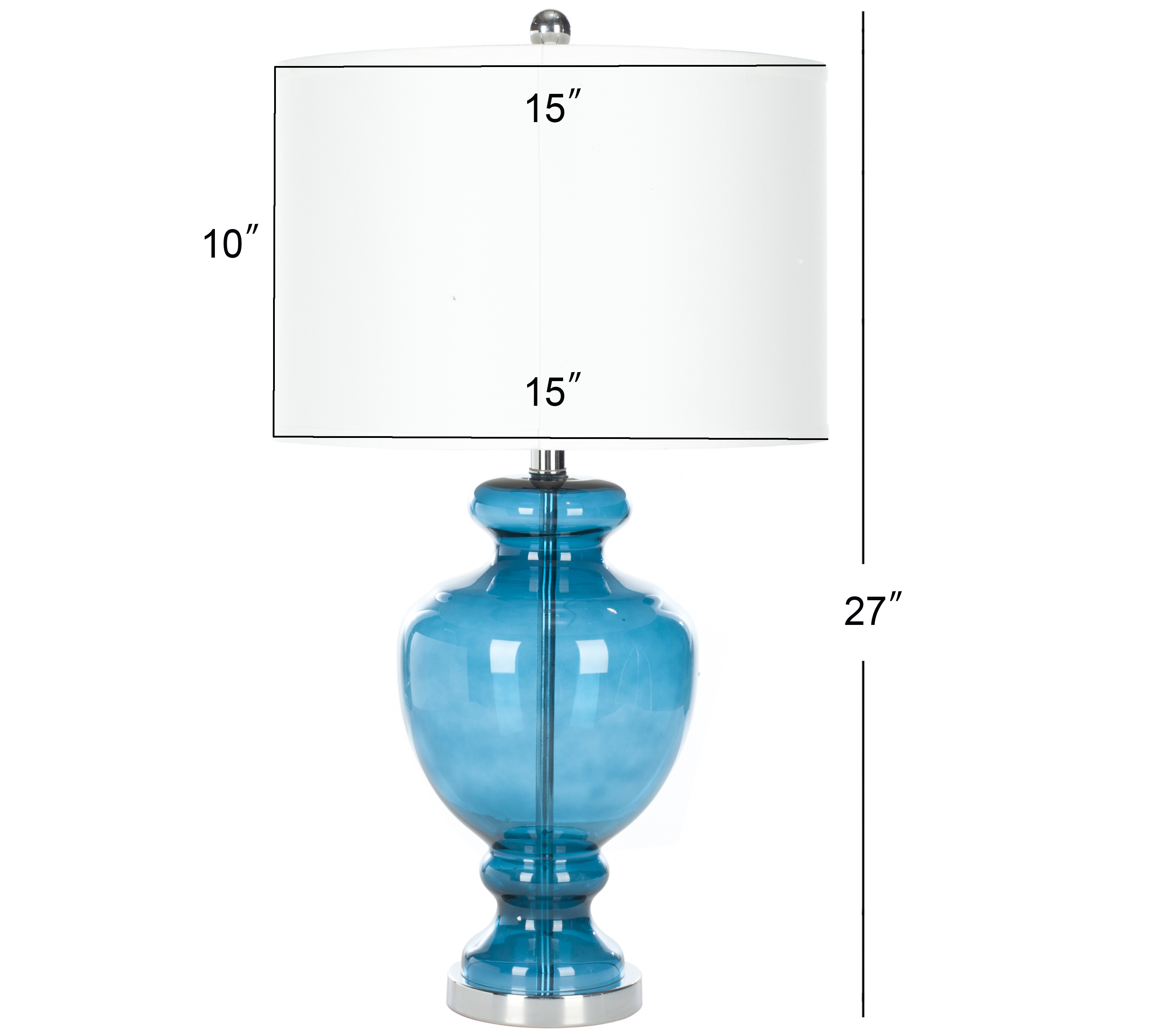Contemporary design adds a chic look to your home Durable frame for long lasting longevity Easy to clean and maintain Minor assembly needed Color: Morocco Blue Shade Color: Off-White Item Dimensions: 15 in. W x 15 in. D x 28 in. H Crafted with Glass Shade Material: 100% Cotton Shade Height: 10 in. H Shade Bottom Dimensions: 15 in. L x 15 in. W Shade Top Dimensions: 15 in. W x 15 in. L Traditional Harp Style Harp Color: Silver Harp Height: 8 in. H Cord Color: Light Grey Cord Length: 60 in. Lamp Body Dimensions: 8 in. W x 8 in. D x 14 in. H Bottom Base Dimension: 5.5 in. W x 5.5 in. D x 1 in. H Pendant Dimension: 60 in. Lamp Certification: UL Light Bulb Base Type: E26 Switch Mechanism: Rotary Switch Type of Bulb Included: CFL Max Wattage: 13W Lumen: 830 Quantity of Bulbs: 2