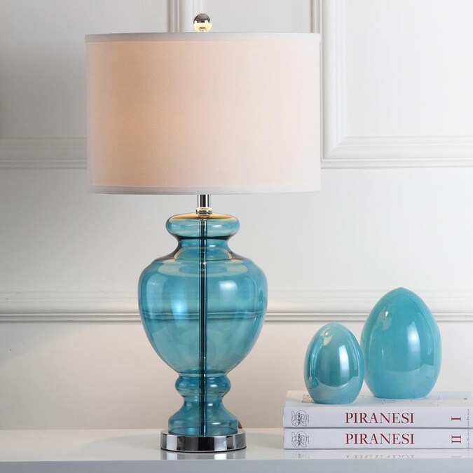 Inspired by collectible colored glass vases, this turquoise glass table lamp is a perfect accessory for any chic interior. Silver fittings and off-white cotton shade refresh the classic silhouette with a touch of seaside romance.