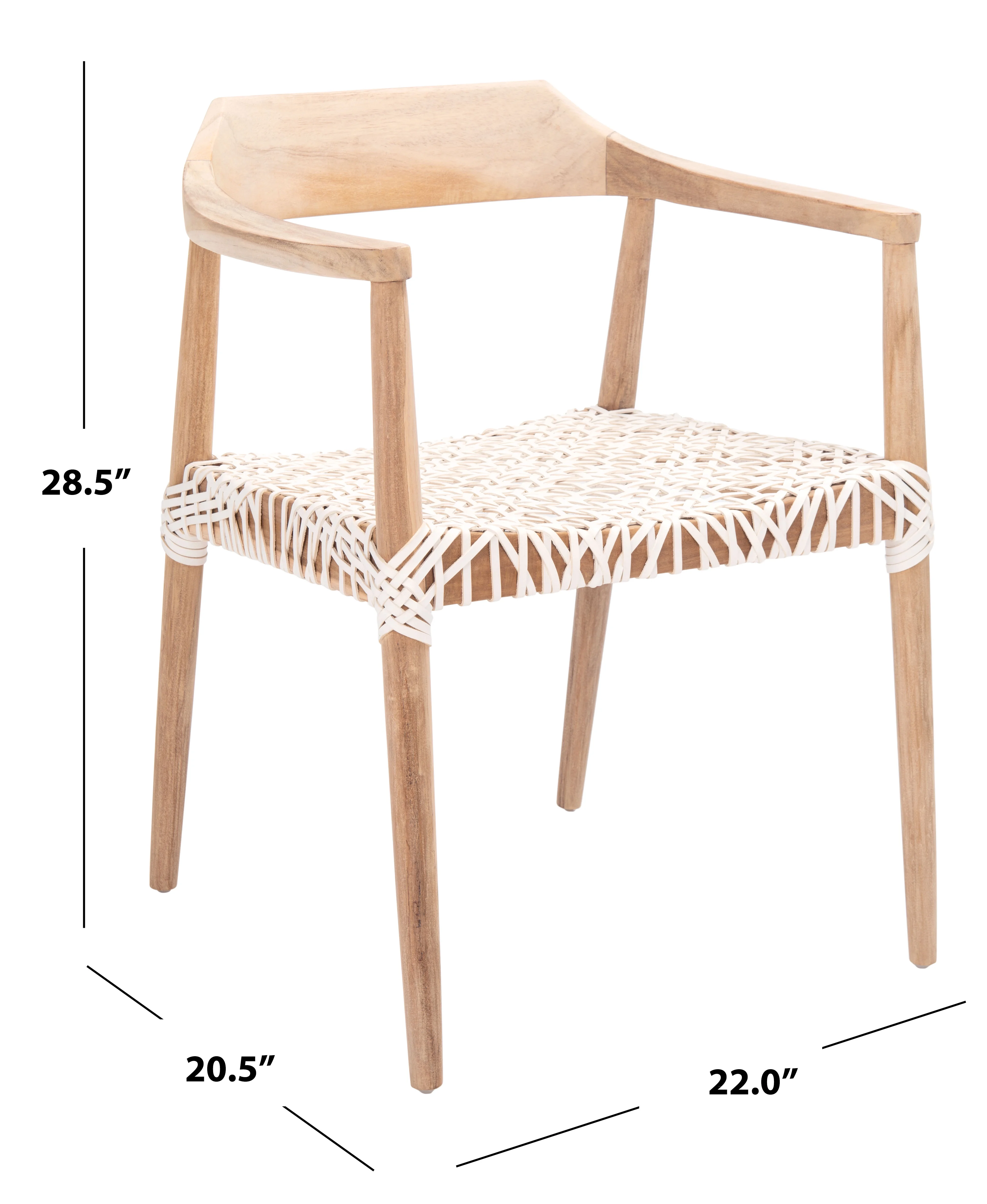 Durable wood frame for long lasting longevity No assembly needed Color: Unfinished Natural (Teak Wood Frame)/White (Leather Seat) Overall Dimension: 22 in. W x 20.5 in. D x 28.5 in. H Item Weight: 10.98 lbs. Weight Capacity: 275 lbs. Finish Surface Treatement: Nc Coating Although leather is one of the most durable upholstery materials, proper care is vital to maintain its appearance and performance. Dust weekly using a soft, clean cloth slightly dampened with distilled water. Blot spills immediately with a soft, clean absorbent dry cloth. Leg Height: 14.5 in. Upholstery with 7 mm Leather Armrest Height: 25.5 in. Armrest Length: 17 in.