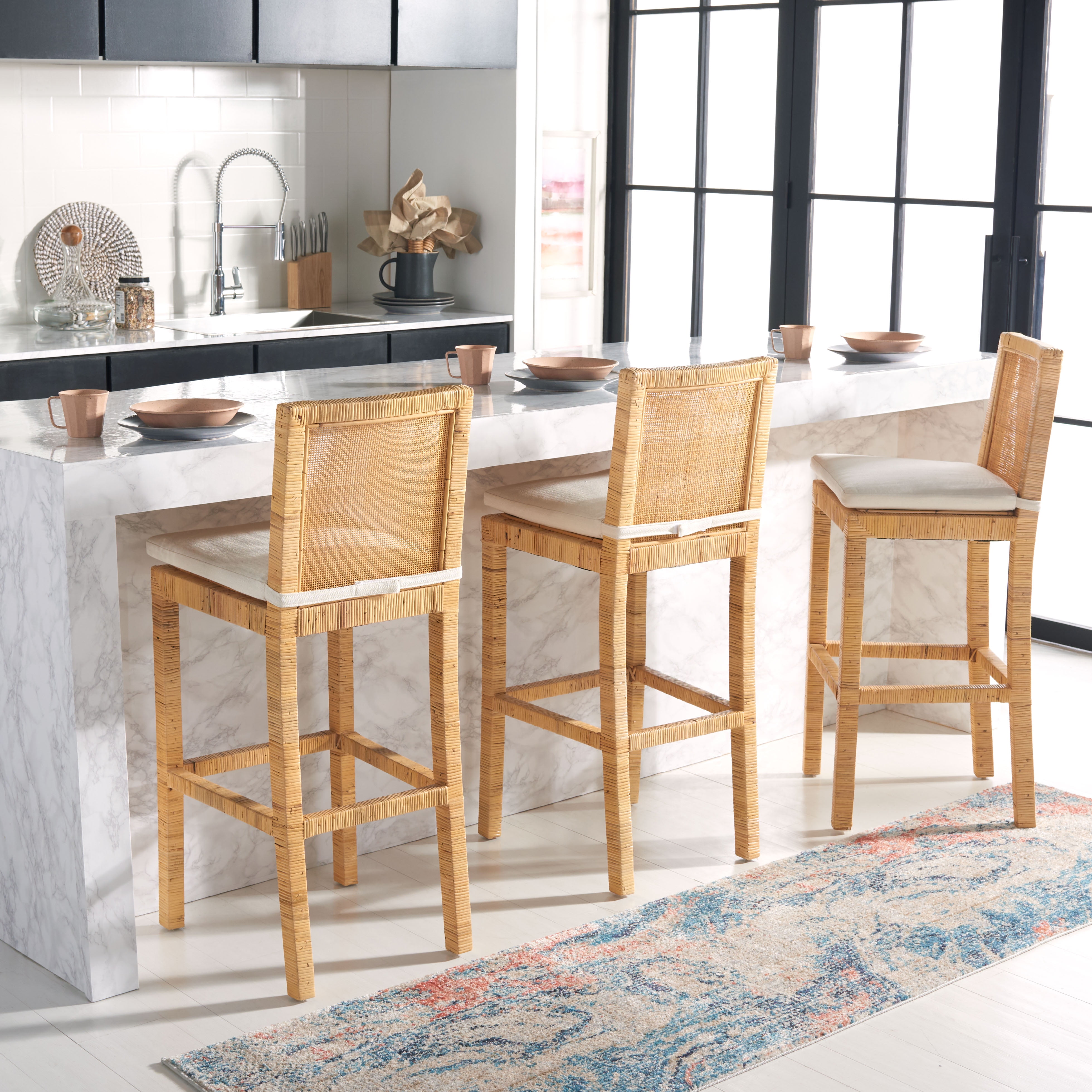 Shop SAFAVIEH at . Save Money. Live Better. SAFAVIEH Tojo Cane Bar Stool with Cushion, Natural/White (22.6 in. W x 18.1 in. D x 44.5 in. H) This Tojo Barstool brings breezy tropical flair to any décor, making it ideal for coastal contemporary interiors. Tojo’s natural cane frame emanates soothing seaside vibes while its soft white cushion ensures comfortably peaceful drinking and dining. For over 100 years, SAFAVIEH has set the standard for finely crafted rugs and home furnishings. Begin your rug, furniture, lighting, outdoor, and home decor search and discover over 100,000 SAFAVIEH products today.