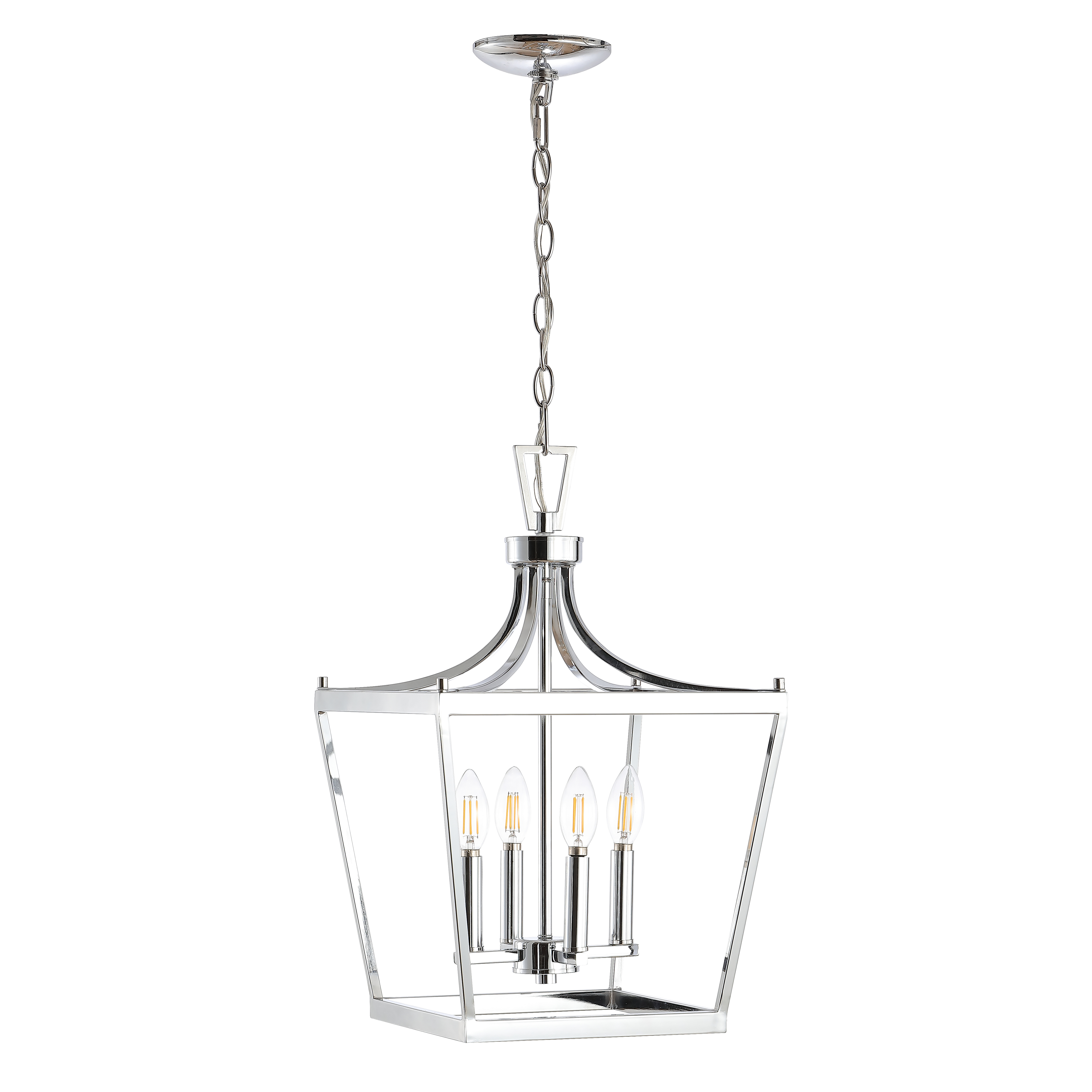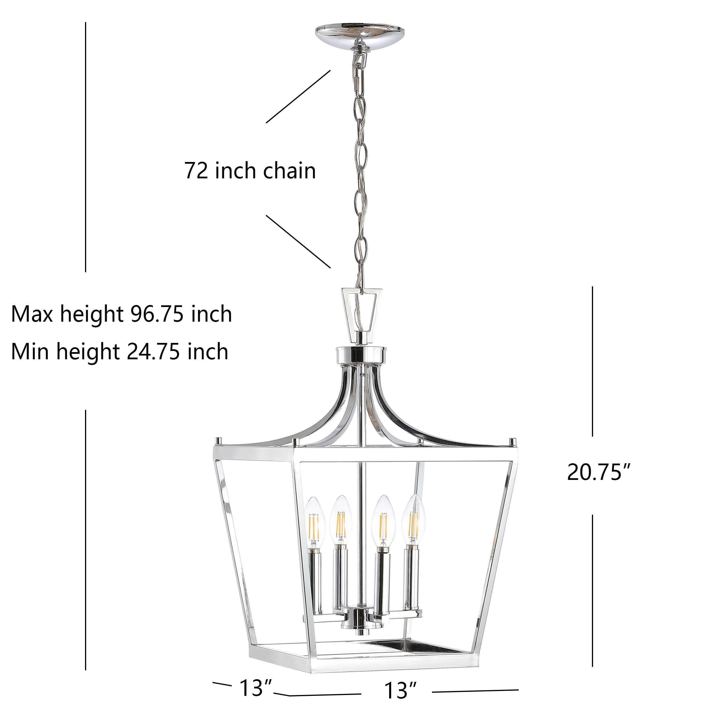 Contemporary design adds a chic look to your home Durable frame for long lasting longevity Easy to clean and maintain Minor assembly needed Color: Chrome Item Dimension: 13 in. W x 13 in. D x 24.75-96.75 in. H Crafted with Iron Cord Color: Clear Cord Length: 84 in. Maximum Hanging Length: 96.75 in. Minimum Hanging Length: 24.75 in. Lighting Body Dimension: 13 in. W x 13 in. D x 20.75 in. H Lamp Certification: UL Light Bulb Base Type: E12 Screw Terminal Type of Light Bulb Included: LED C35 4W Max Wattage: TYPE “B” 40W OR CFL 13W OR LED 9W Lumen: 420 Quantity of Bulb(s): 4 Item Weight: 7.04 lbs. Unit Sold: One Accessories in life style photo(s) not included Please note: The images and product dimensions on our website are as accurate as possible. Due to differences in computer monitors, some item’s color may vary slightly. Before cleaning any lamp shade or fixture, disconnect the power source. Wipe with a soft, dry cloth. Avoid the use of chemicals and household cleaners as they may damage the finish.