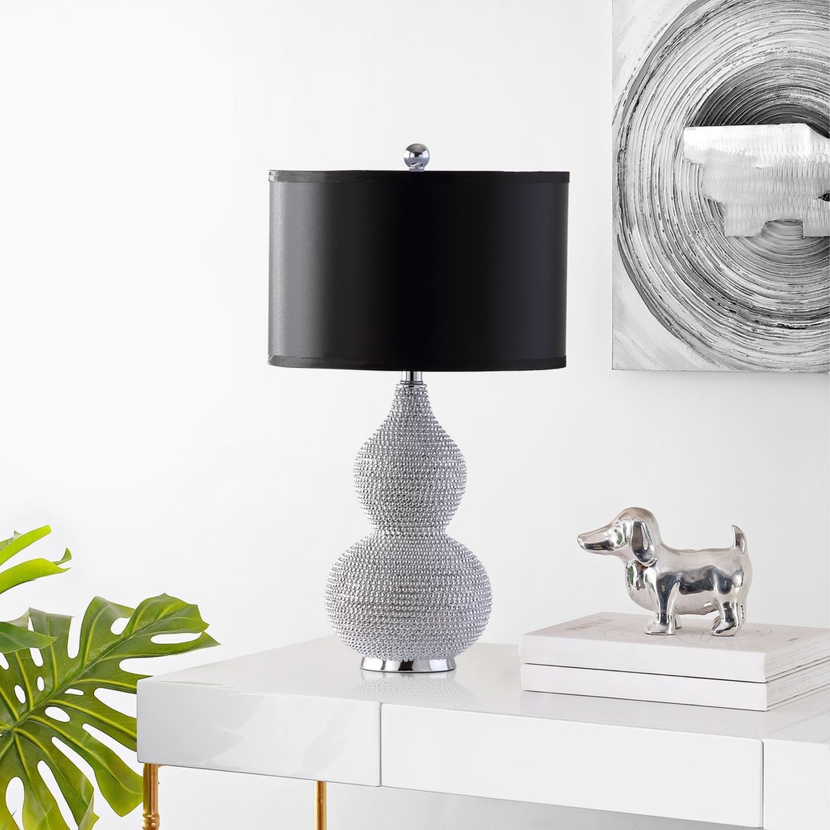 Contemporary design adds a chic look to your home Durable resin frame for long lasting longevity Easy to clean and maintain Minor assembly needed Color: Silver Shade Color: Black Item Dimension: 14 in. W x 14 in. D x 24.5 in. H Crafted with: Resin Shade Material: 100% Cotton Shade Height: 9 in. Shade Bottom Dimension: 14 in. W x 14 in. L Shade Top Dimension: 14 in. W x 14 in. L Harp Height: 7 in. Cord Color: Light Grey Cord Length: 60 in. Lamp Body Dimension: 8 in. W x 8 in. D x 13 in. H Bottom Base Dimension: 5.5 in. W x 5.5 in. D x 1 in. H Item Weight: 12.55 lbs Lamp Certification: UL Light Bulb Base Type: E26 Switch Mechanism: On/Off Rotary Switch Type of Bulb Included: A19-LED Max Wattage: 100W Lumen: 805 Finial Color: Chrome Sold in a Set of 2 Accessories in life style photo(s) not included Please note: The images and product dimensions on our website are as accurate as possible. Due to differences in computer monitors, some item’s color may vary slightly. Before cleaning any lamp shade or fixture, disconnect the power source. Wipe with a soft, dry cloth. Avoid the use of chemicals and household cleaners as they may damage the finish.