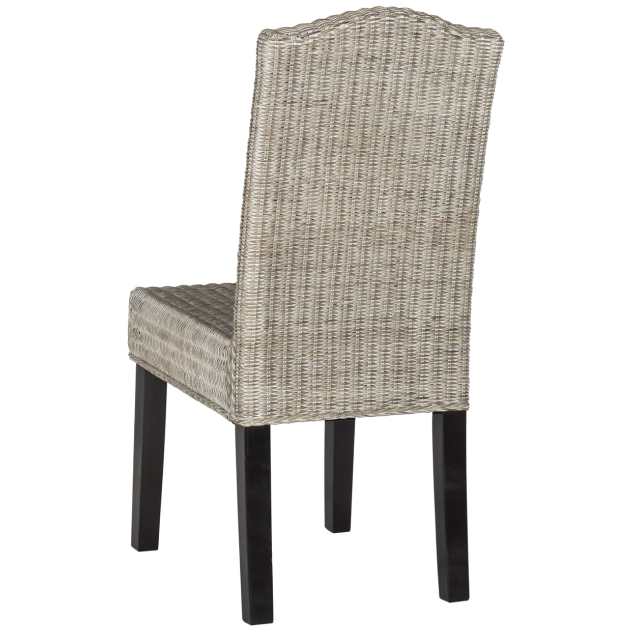 Crafted of antique grey-finished rattan with natural variations in shading and paired with dark hardwood legs.Disclaimer Please note that this item is crafted of rattan and none are exactly alike Each item will have different shadings patterning and variations in color. Transitional with a Nd to the past this set of two camelback wicker dining chairs lend warmth and character to the dining room or kitchen table Assembly Required:Yes Product Weight:18.30 Product Height:38.50 Product Width:17.30 Product Dimensions:17.3 x 22 x 38.5 Product Depth:22.00