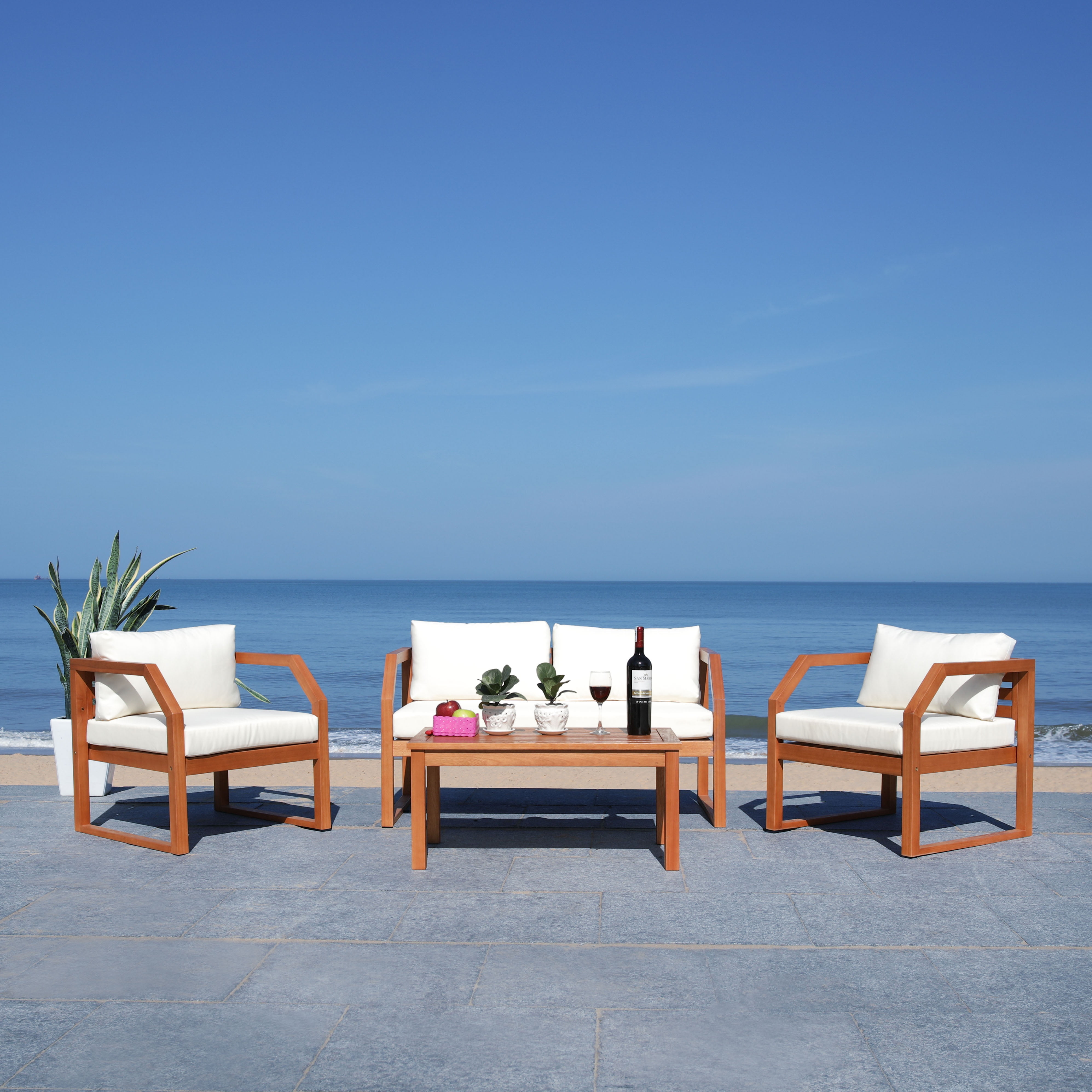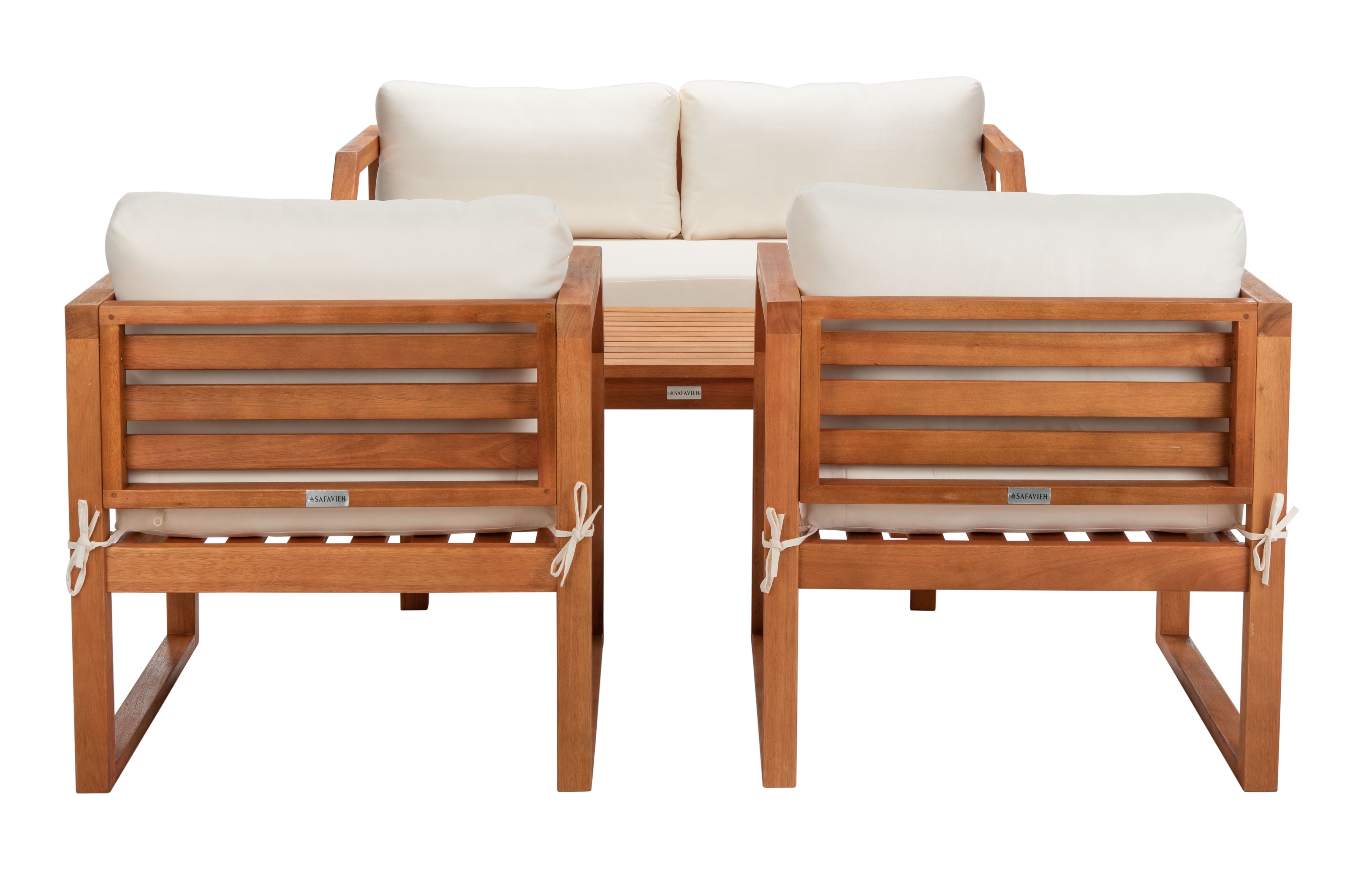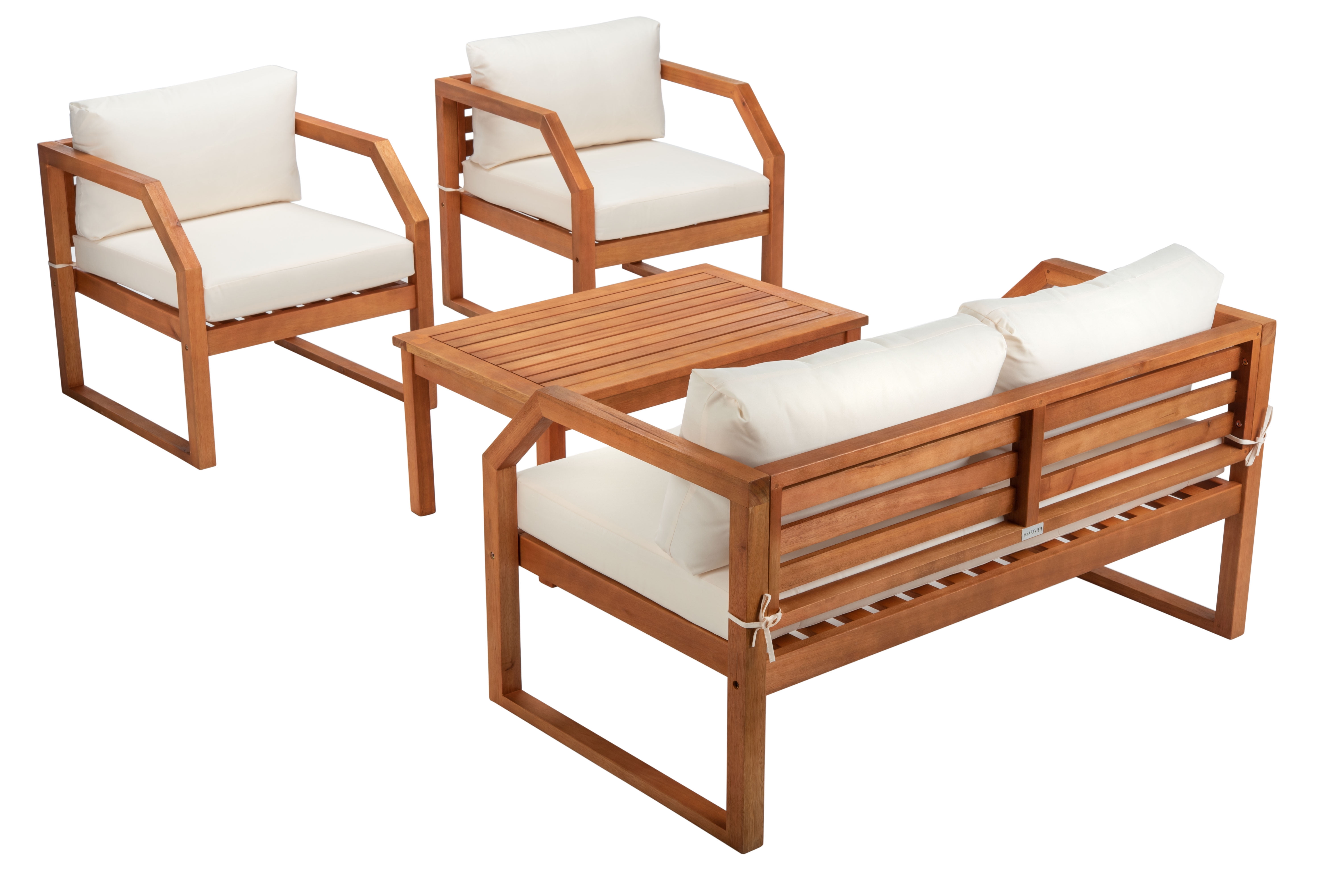 SAFAVIEH Outdoor Collection Dren 4-Piece Living Set Natural/Beige Create an instant outdoor living room with this contemporary 4 piece living set. Warm and inviting, it features a sleek table, a welcoming settee and two cozy lounge chairsall with plush cushions. Designers love its natural eucalyptus wood construction. For over 100 years, SAFAVIEH has set the standard for finely crafted rugs and home furnishings. From coveted fresh and trendy designs to timeless heirloom-quality pieces, expressing your unique personal style has never been easier. Begin your rug, furniture, lighting, outdoor, and home decor search and discover over 100,000 SAFAVIEH products today.