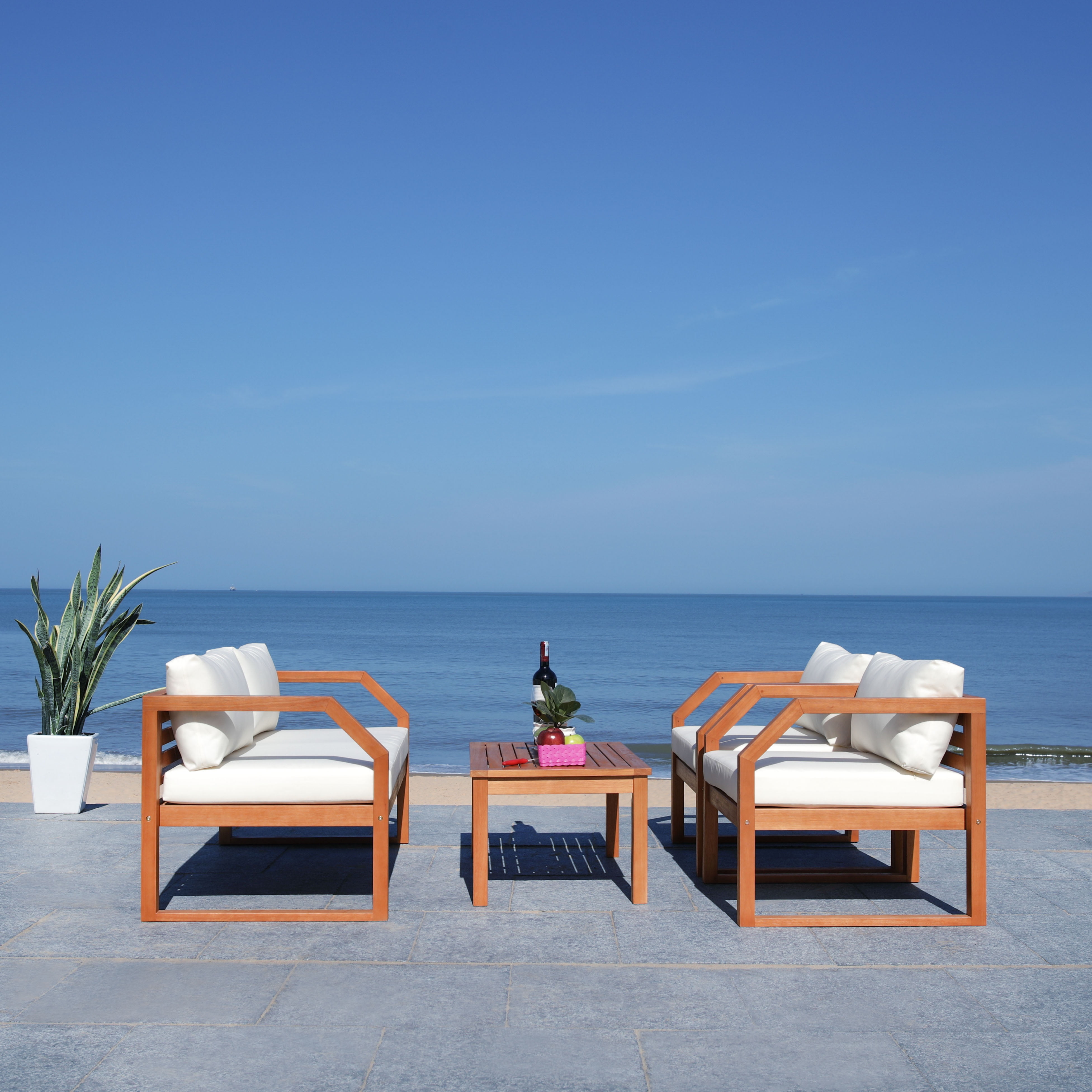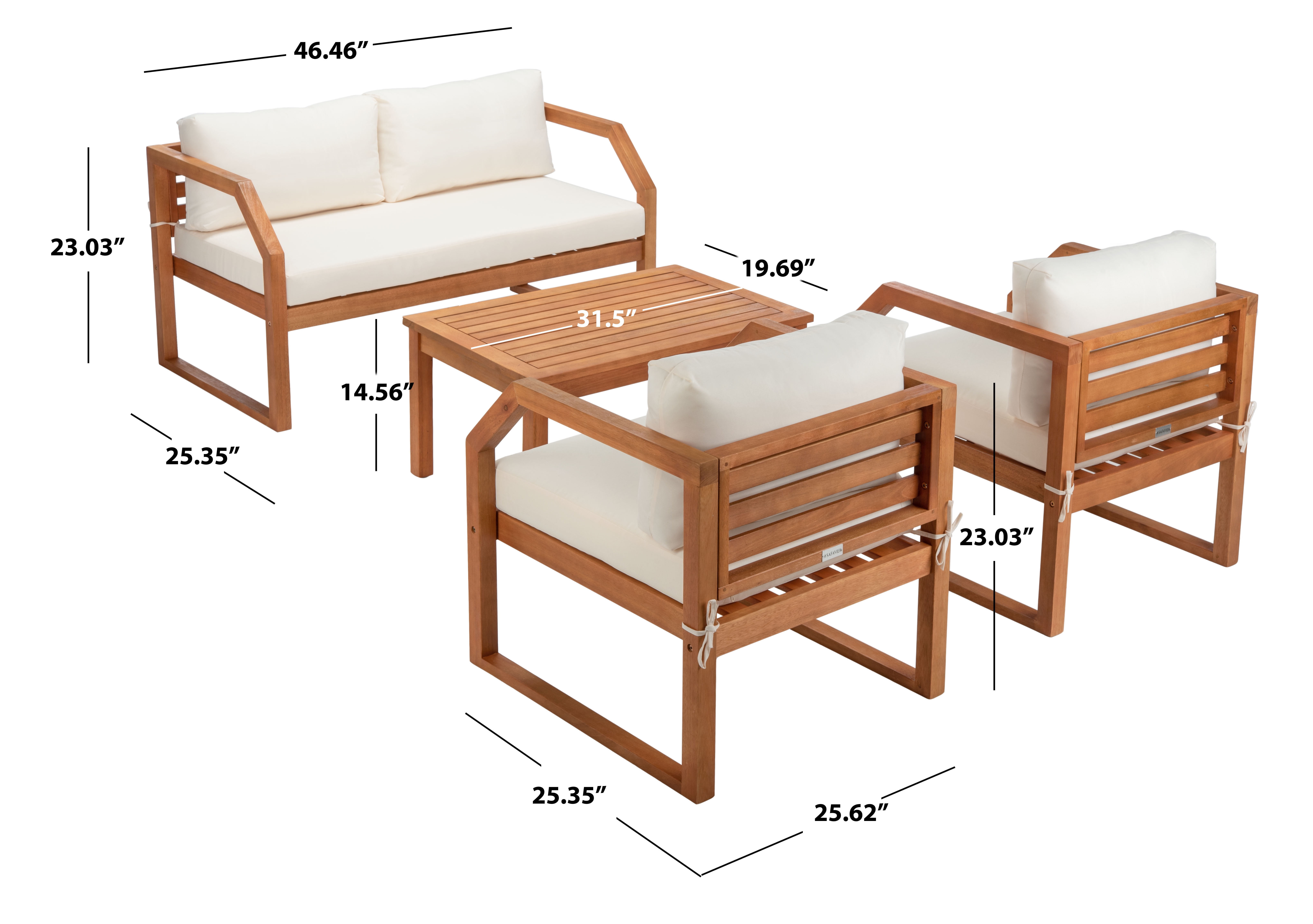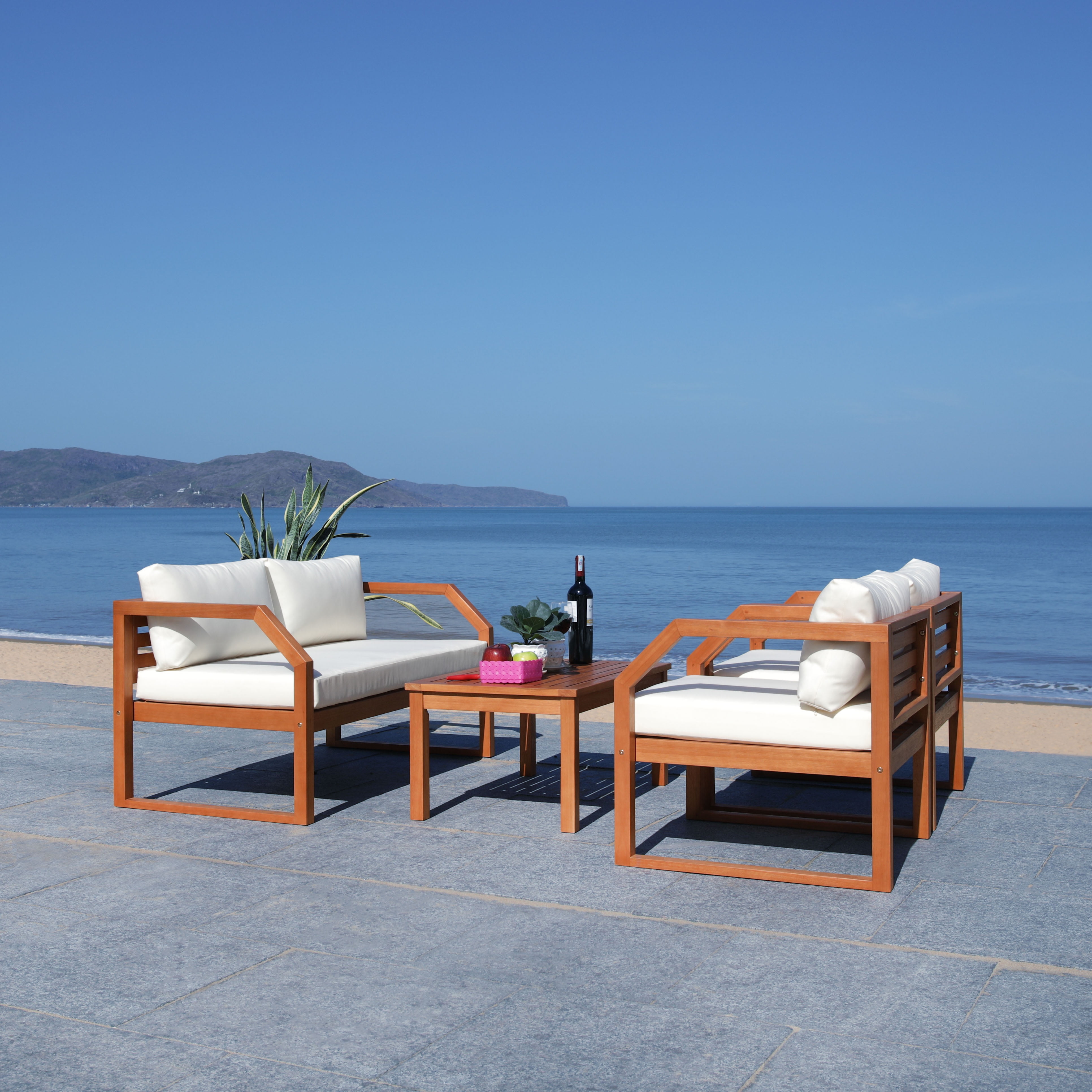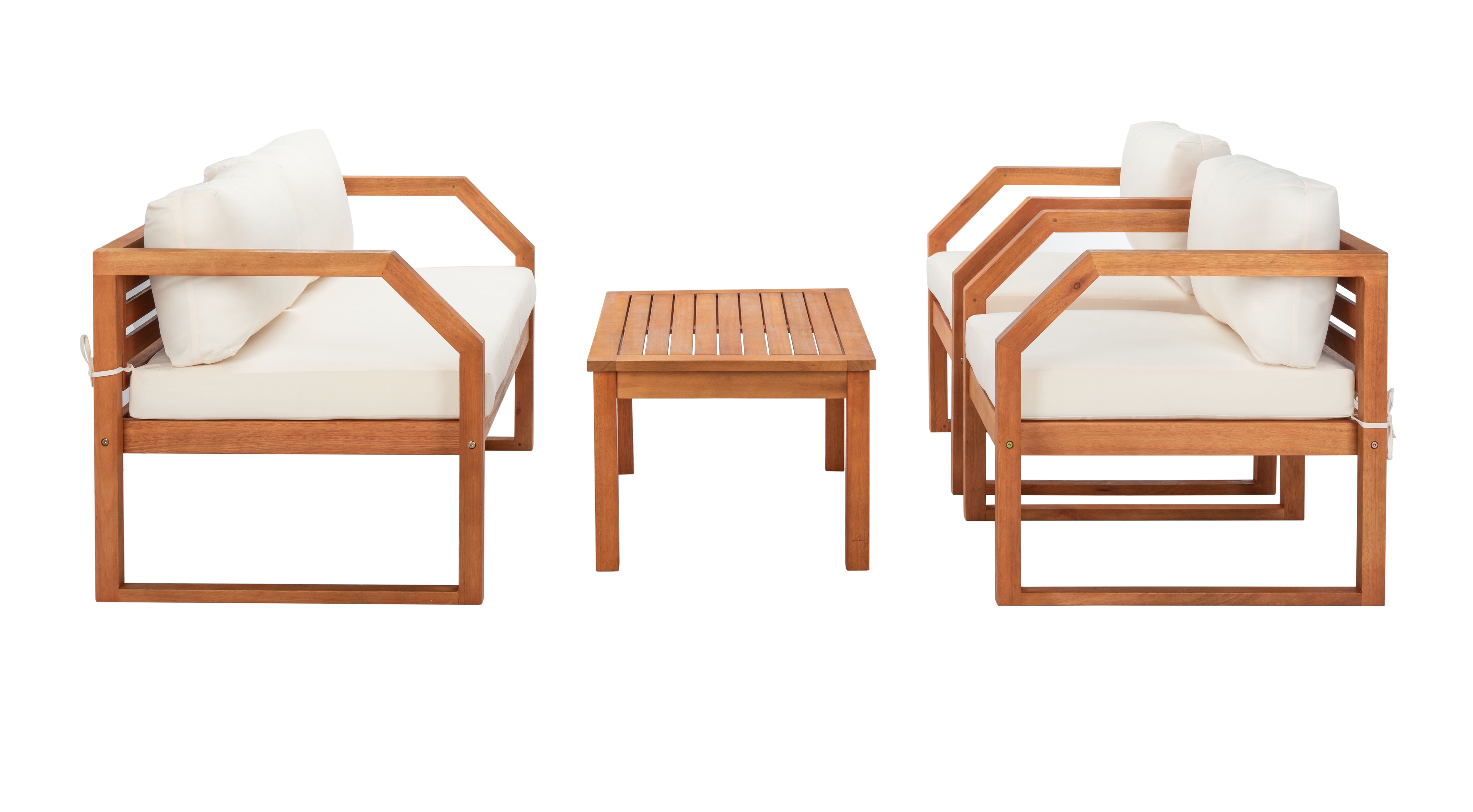 SAFAVIEH Outdoor Collection Dren 4-Piece Living Set Natural/Beige Create an instant outdoor living room with this contemporary 4 piece living set. Warm and inviting, it features a sleek table, a welcoming settee and two cozy lounge chairsall with plush cushions. Designers love its natural eucalyptus wood construction. For over 100 years, SAFAVIEH has set the standard for finely crafted rugs and home furnishings. From coveted fresh and trendy designs to timeless heirloom-quality pieces, expressing your unique personal style has never been easier. Begin your rug, furniture, lighting, outdoor, and home decor search and discover over 100,000 SAFAVIEH products today.