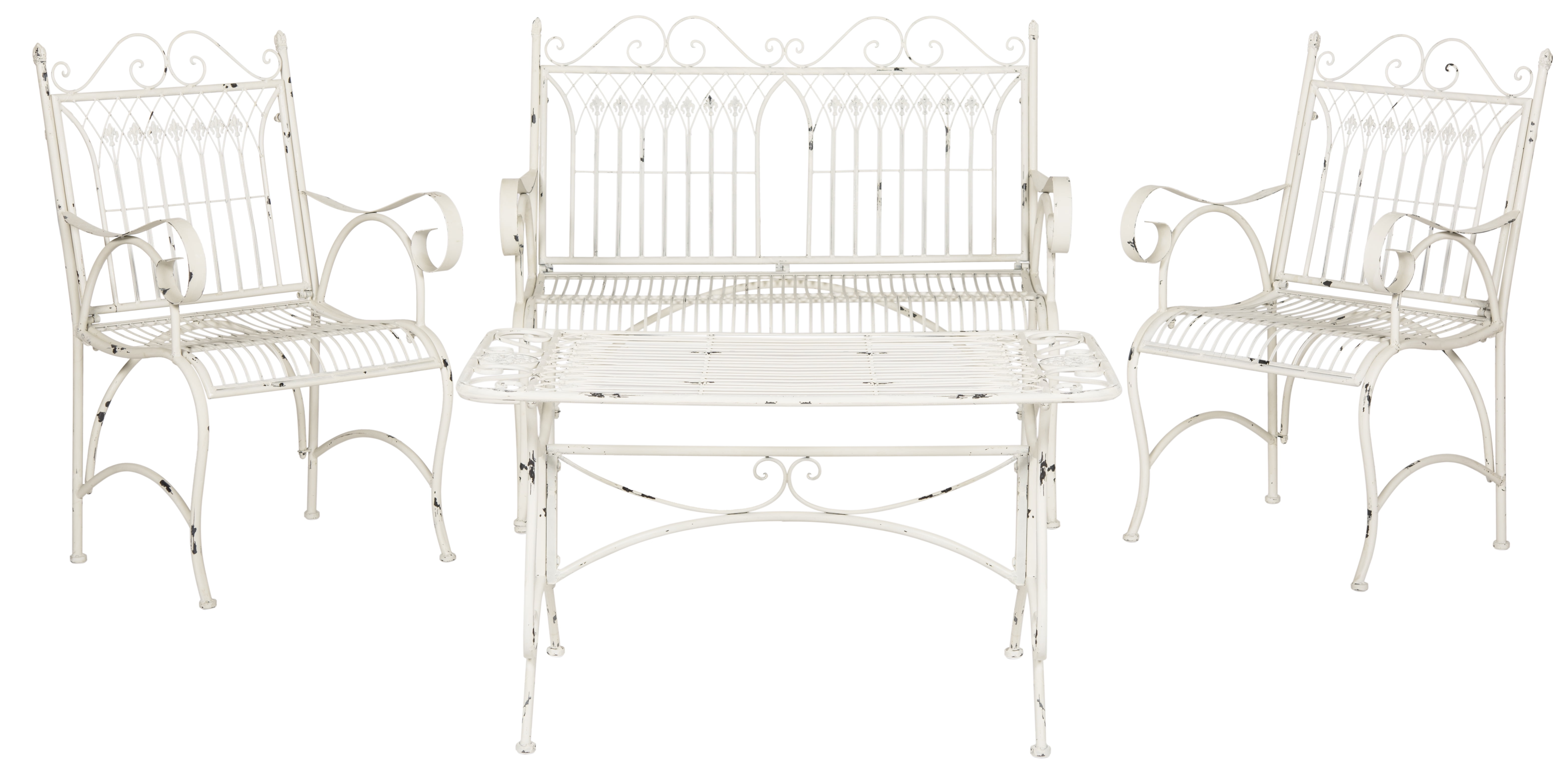 SAFAVIEH Outdoor Collection Leah 4-Piece Set Antique White Emanating turn of the century charm, this Leah Four Piece Set gives any outdoor area a classic, romantic ambiance. Crafted of intricately worked iron in an antique white finish, Leah�s Victorian inspired scroll details transform your patio into an elegant entertainment space. Includes a loveseat, two chairs, and coffee table. For over 100 years, SAFAVIEH has set the standard for finely crafted rugs and home furnishings. From coveted fresh and trendy designs to timeless heirloom-quality pieces, expressing your unique personal style has never been easier. Begin your rug, furniture, lighting, outdoor, and home decor search and discover over 100,000 SAFAVIEH products today.
