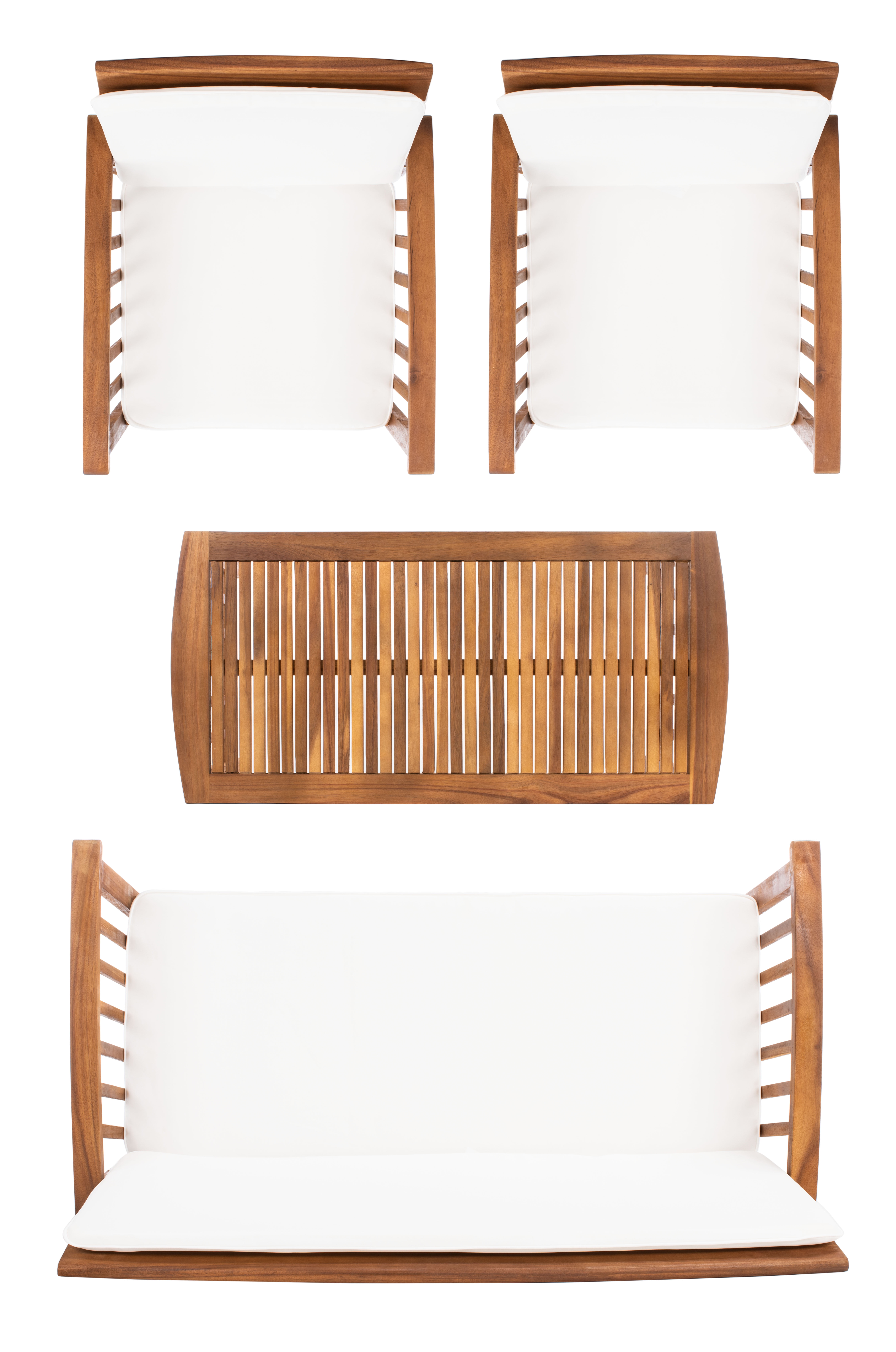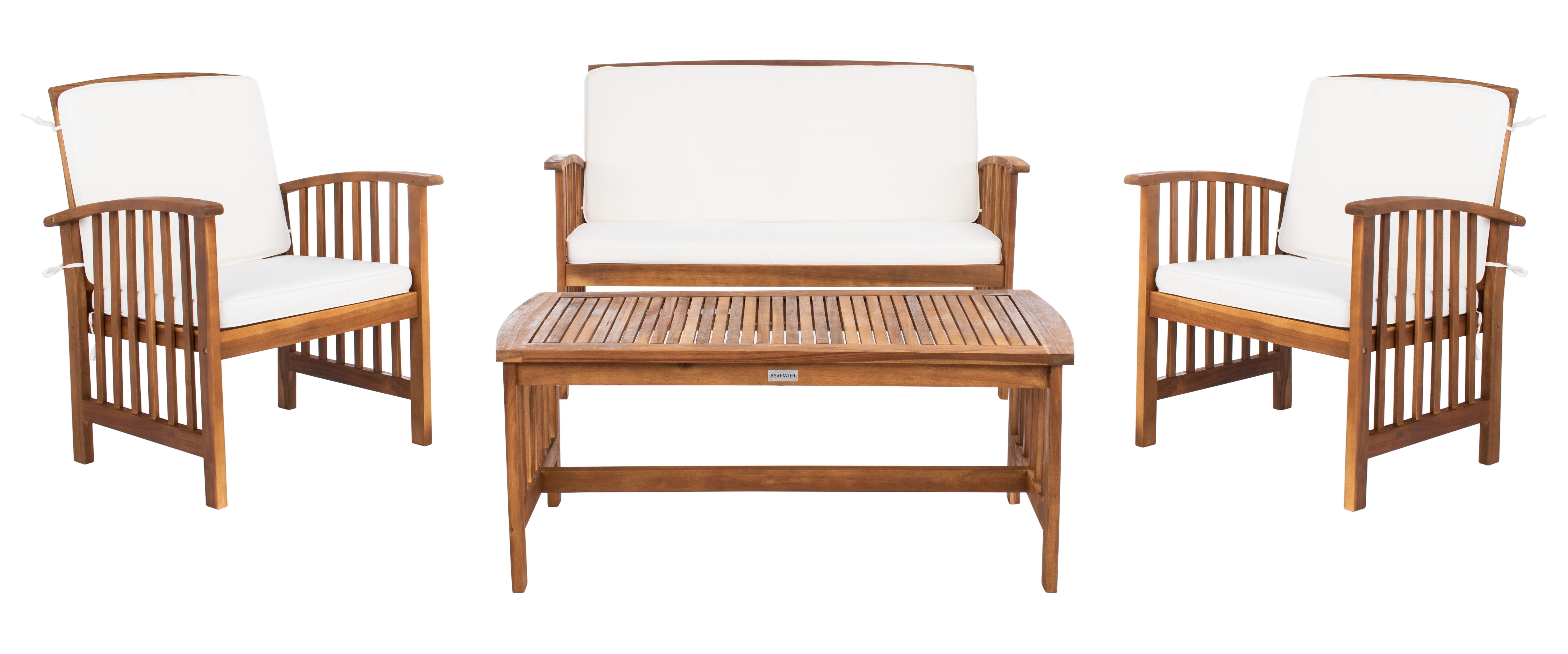 SAFAVIEH Outdoor Collection Rocklin 4-Piece Patio Set Natural/Beige The open and airy design of the Rocklin 4 piece outdoor set combines form and function. The slatted silhouette aids rain drainage while creating chic contemporary forms. The set is crafted of acacia in a brown finish with beige all weather cushions. For over 100 years, SAFAVIEH has set the standard for finely crafted rugs and home furnishings. From coveted fresh and trendy designs to timeless heirloom-quality pieces, expressing your unique personal style has never been easier. Begin your rug, furniture, lighting, outdoor, and home decor search and discover over 100,000 SAFAVIEH products today.