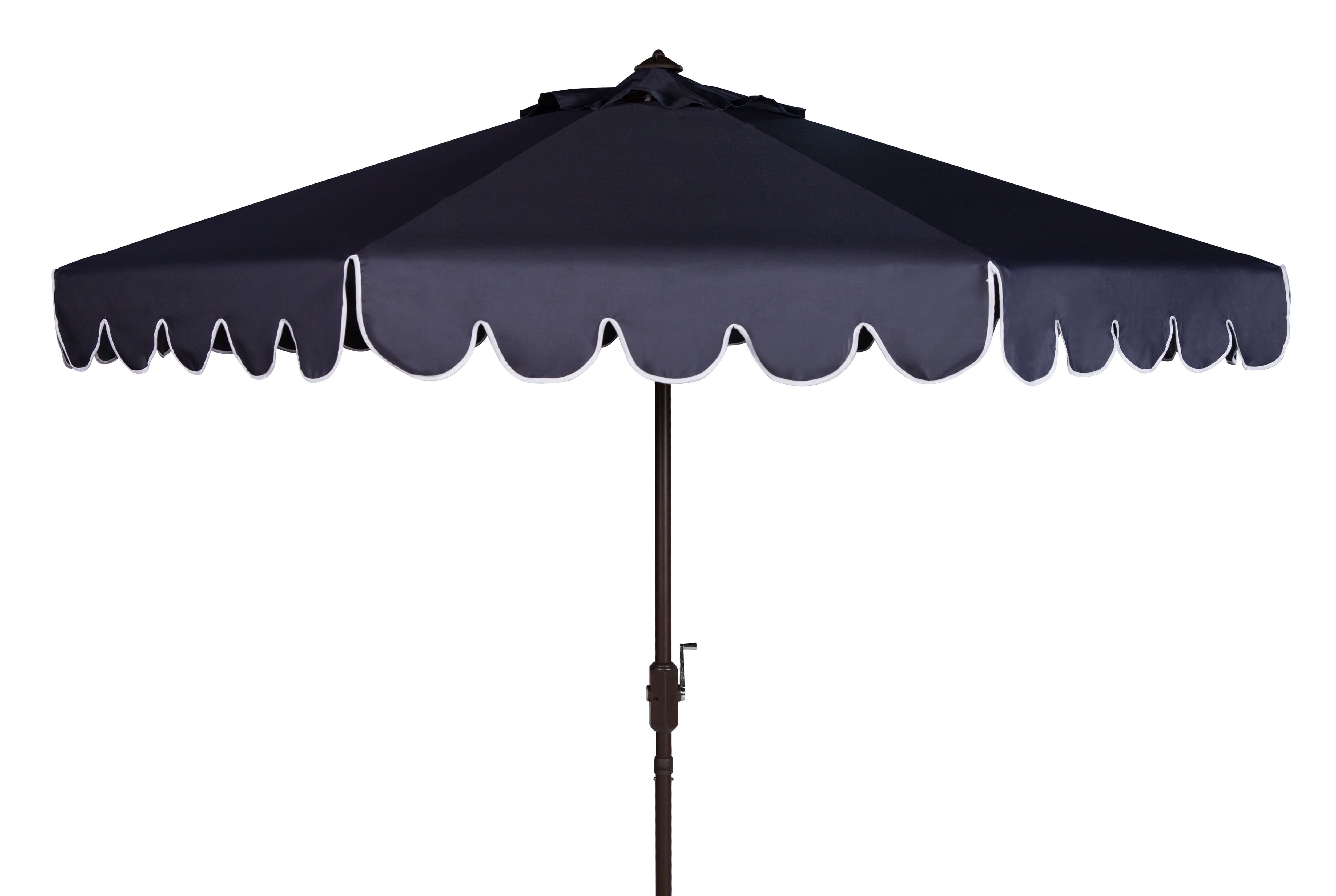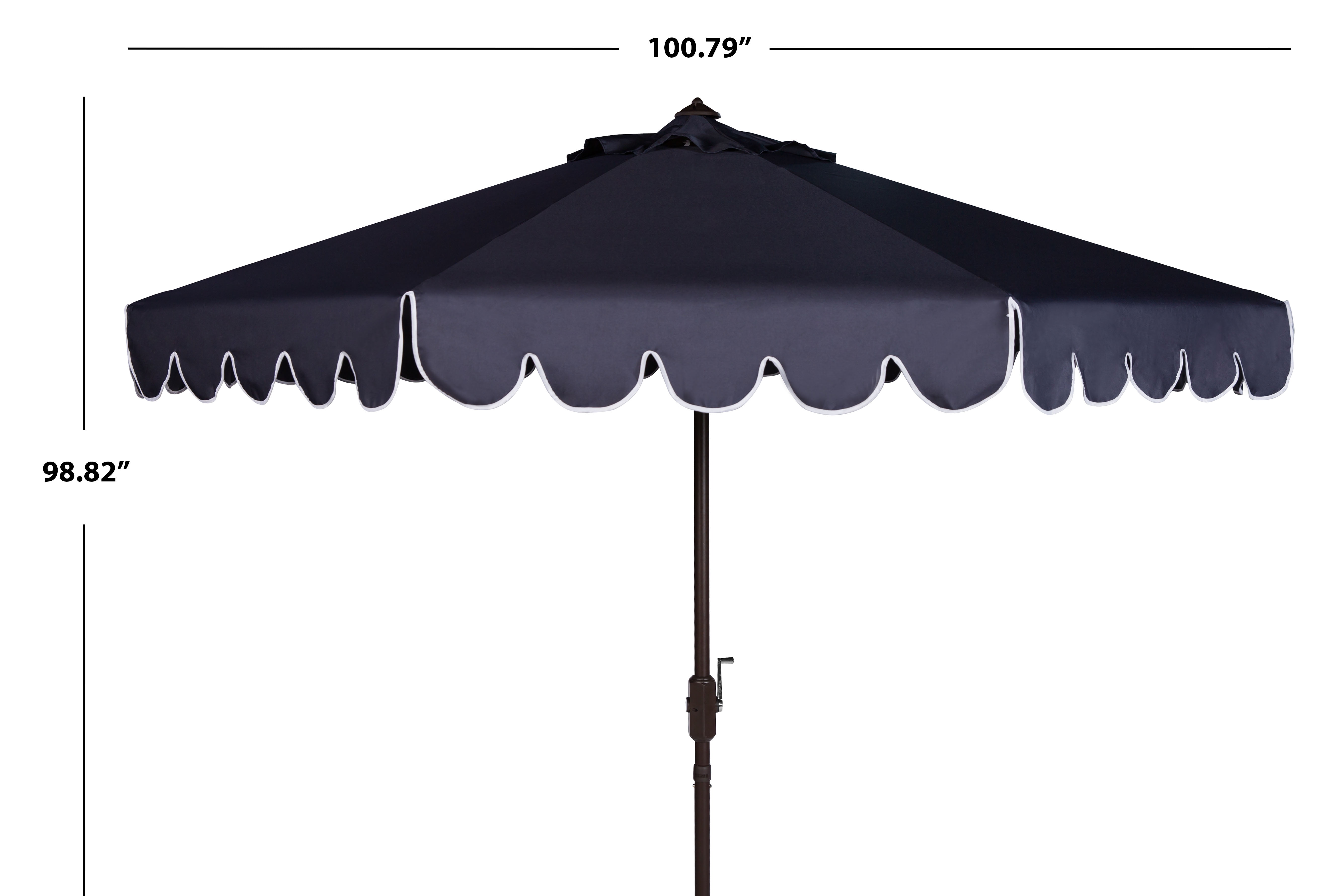 SAFAVIEH Outdoor Collection Venice Single Scallop 9-Foot Tilt Umbrella Navy/White The signature white and blue coloration of Santorinis lush legendary resort inspired this nine foot crank umbrella. Its sophisticated navy hue features a single scallop white trim to create an outdoor retreat for the modern tastemaker. For over 100 years, SAFAVIEH has set the standard for finely crafted rugs and home furnishings. From coveted fresh and trendy designs to timeless heirloom-quality pieces, expressing your unique personal style has never been easier. Begin your rug, furniture, lighting, outdoor, and home decor search and discover over 100,000 SAFAVIEH products today.