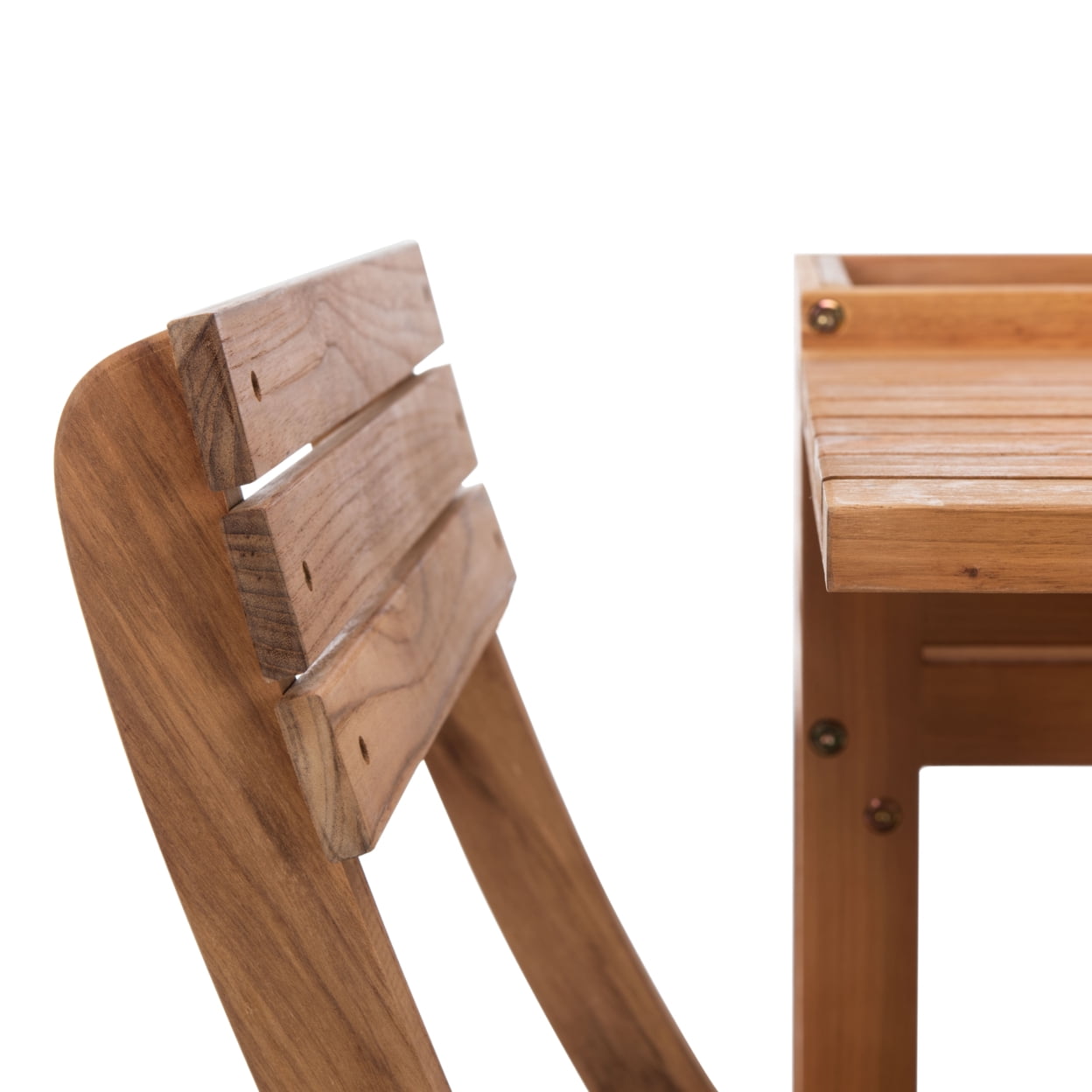 Contemporary design adds a chic look to your home Durable teak and eucalyptus frame for long lasting longevity Minor Assembly Required Color: Natural Chair Dimensions: 15.5 in. W x 19.1 in. D x 31.1 in. H Table Dimensions: 25.2 in. W x 24.8 in. D x 30.3 in. H Seat Dimensions: 14.96 in. W x 11.81 in. D x 17.13 in. H Seat Back Height: 14 in. Seat Back Width: 18.9 in. Back Rest: 31.1 in. 3 Piece Set Weight – Table 17.6 lbs; Chair: 8.36 lbs each Weight Capacity – Chair: 250 lbs; Table: 40 lbs Easy to clean and maintain Accessories in Life Style photo not included Please note: The images and product dimensions on our website are as accurate as possible. Due to differences in computer monitors, some item’s color may vary slightly. Store outdoor furniture indoors or cover well when not in use. Remove wooden furniture from standing water. Dust regularly with small brush or vacuum. Spills should be taken care of immediately before they harden or stain with a slightly dampened sponge.
